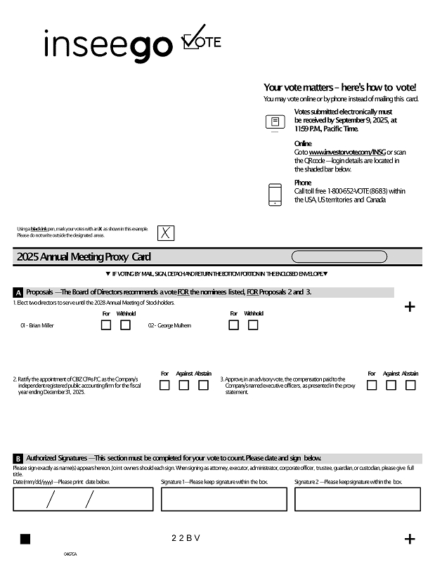 2 2 B V F o r W ithhold Proposals — The Board of Directors recommends a vote FOR the nominees listed, FOR Proposals 2 and 3. A 04 6 7 G A 2. Ratify the appointment of CBIZ CPAs P.C. as the Company’s independent registered public accounting firm for the fiscal year ending December 31, 2025. 3. Approve, in an advisory vote, the compensation paid to the Company’s named executive officers, as presented in the proxy statement. 1. Elect two directors to serve until the 2028 Annual Meeting of Stockholders. For Withhold 01 - Brian Miller 02 - George Mulhern For Against Abstain For Against Abstain Please sign exactly as name(s) appears hereon. Joint owners should each sign. When signing as attorney, executor, administrator, corporate officer, trustee, guardian, or custodian, please give full title. Date (mm/dd/yyyy) — Please print date below. Signature 1 — Please keep signature within the box. Signature 2 — Please keep signature within the box. Authorized Signatures — This section must be completed for your vote to count. Please date and sign below. B 2025 Annual Meeting Proxy Card Using a black ink pen, mark your votes with an X as shown in this example. Please do not write outside the designated areas. □ IF VOTING BY MAIL, SIGN, DETACH AND RETURN THE BOTTOM PORTION IN THE ENCLOSED ENVELOPE. □ Your vote matters – here’s how to vote! You may vote online or by phone instead of mailing this card. Votes submitted electronically must be received by September 9, 2025, at 11:59 P.M., Pacific Time. Online Go to www.investorvote.com/INSG or scan the QR code — login details are located in the shaded bar below. Phone Call toll free 1 - 800 - 652 - VOTE (8683) within the USA, US territories and Canada
