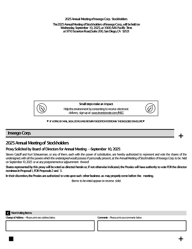 Small steps make an impact. Help the environment by consenting to receive electronic delivery, sign up at www.investorvote.com/INSG Inseego Corp. 2025 Annual Meeting of Stockholders Proxy Solicited by Board of Directors for Annual Meeting — September 10 , 2025 Steven Gatoff and Kurt Scheuerman, or any of them, each with the power of substitution, are hereby authorized to represent and vote the shares of the undersigned, with all the powers which the undersigned would possess if personally present, at the Annual Meeting of Stockholders of Inseego Corp . to be held on September 10 , 2025 or at any postponement or adjournment thereof . Shares represented by this proxy will be voted as directed herein or, if not otherwise indicated, the Proxies will have authority to vote FOR the director nominees in Proposal 1 , FOR Proposals 2 and 3 . In their discretion, the Proxies are authorized to vote upon such other business as may properly come before the meeting . (Items to be voted appear on reverse side) Non - Voting Items C □ IF VOTING BY MAIL, SIGN, DETACH AND RETURN THE BOTTOM PORTION IN THE ENCLOSED ENVELOPE. □ Change of Address — Please print new address below. Comments — Please print your comments below. 2025 Annual Meeting of Inseego Corp. Stockholders The 2025 Annual Meeting of Stockholders of Inseego Corp., will be held on Wednesday, September 10, 2025, at 10:00 A.M. Pacific Time at 9710 Scranton Road, Suite 200, San Diego, CA 92121