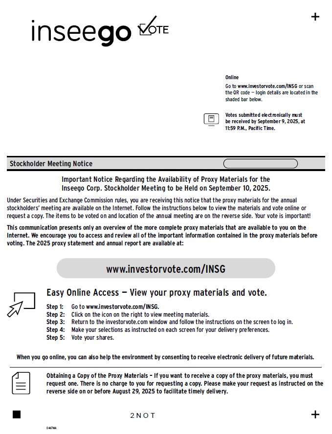 www.investorvote.com/INSG Easy Online Access — View your proxy materials and vote. Step 1: Step 2: Step 3: Step 4: Step 5: Go to www.investorvote.com/INSG. Click on the icon on the right to view meeting materials. Return to the investorvote.com window and follow the instructions on the screen to log in. Make your selections as instructed on each screen for your delivery preferences. Vote your shares. Online Go to www.investorvote.com/INSG or scan the QR code — login details are located in the shaded bar below. Votes submitted electronically must be received by September 9, 2025, at 11:59 P.M., Pacific Time. Stockholder Meeting Notice Important Notice Regarding the Availability of Proxy Materials for the Inseego Corp. Stockholder Meeting to be Held on September 10, 2025. Under Securities and Exchange Commission rules, you are receiving this notice that the proxy materials for the annual stockholders’ meeting are available on the Internet. Follow the instructions below to view the materials and vote online or request a copy. The items to be voted on and location of the annual meeting are on the reverse side. Your vote is important! This communication presents only an overview of the more complete proxy materials that are available to you on the Internet. We encourage you to access and review all of the important information contained in the proxy materials before voting. The 2025 proxy statement and annual report are available at: 0467MA When you go online, you can also help the environment by consenting to receive electronic delivery of future materials. Obtaining a Copy of the Proxy Materials – If you want to receive a copy of the proxy materials, you must request one. There is no charge to you for requesting a copy. Please make your request as instructed on the reverse side on or before August 29, 2025 to facilitate timely delivery. 2 N O T
