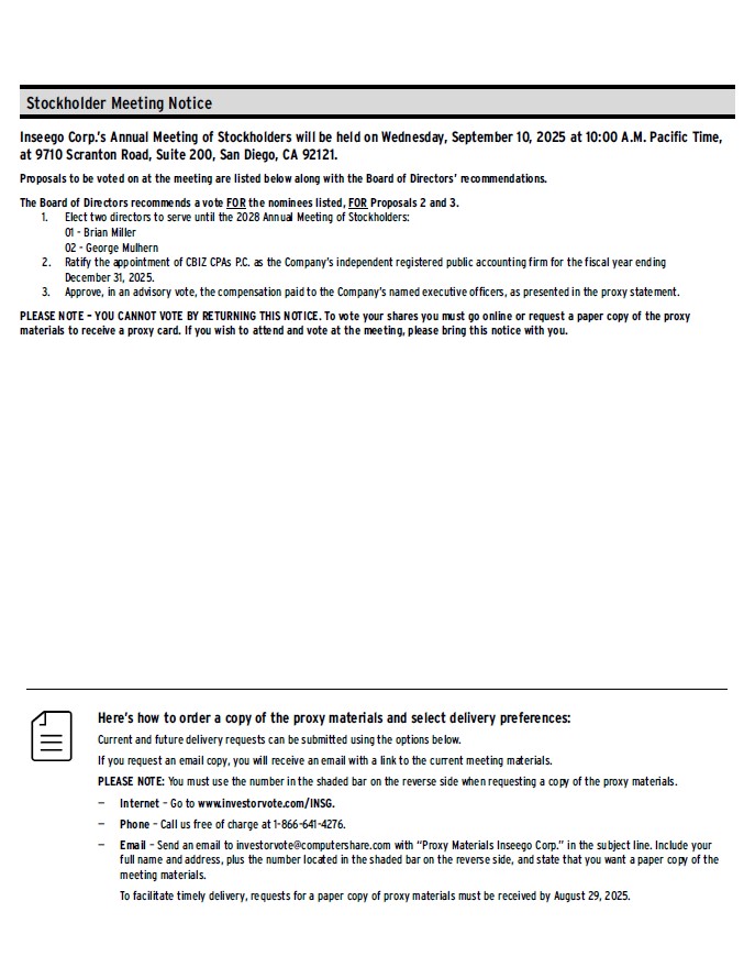Here’s how to order a copy of the proxy materials and select delivery preferences: Current and future delivery requests can be submitted using the options below. If you request an email copy, you will receive an email with a link to the current meeting materials. PLEASE NOTE: You must use the number in the shaded bar on the reverse side when requesting a copy of the proxy materials. — Internet – Go to www.investorvote.com/INSG. — Phone – Call us free of charge at 1 - 866 - 641 - 4276. — Email – Send an email to investorvote@computershare.com with “Proxy Materials Inseego Corp.” in the subject line. Include your full name and address, plus the number located in the shaded bar on the reverse side, and state that you want a paper copy of the meeting materials. To facilitate timely delivery, requests for a paper copy of proxy materials must be received by August 29, 2025. Stockholder Meeting Notice Inseego Corp.’s Annual Meeting of Stockholders will be held on Wednesday, September 10, 2025 at 10:00 A.M. Pacific Time, at 9710 Scranton Road, Suite 200, San Diego, CA 92121. Proposals to be voted on at the meeting are listed below along with the Board of Directors’ recommendations. The Board of Directors recommends a vote FOR the nominees listed, FOR Proposals 2 and 3. 1. Elect two directors to serve until the 2028 Annual Meeting of Stockholders: 1. - Brian Miller 2. - George Mulhern 2. Ratify the appointment of CBIZ CPAs P.C. as the Company’s independent registered public accounting firm for the fiscal year ending December 31, 2025. 3. Approve, in an advisory vote, the compensation paid to the Company’s named executive officers, as presented in the proxy statement. PLEASE NOTE – YOU CANNOT VOTE BY RETURNING THIS NOTICE. To vote your shares you must go online or request a paper copy of the proxy materials to receive a proxy card. If you wish to attend and vote at the meeting, please bring this notice with you.