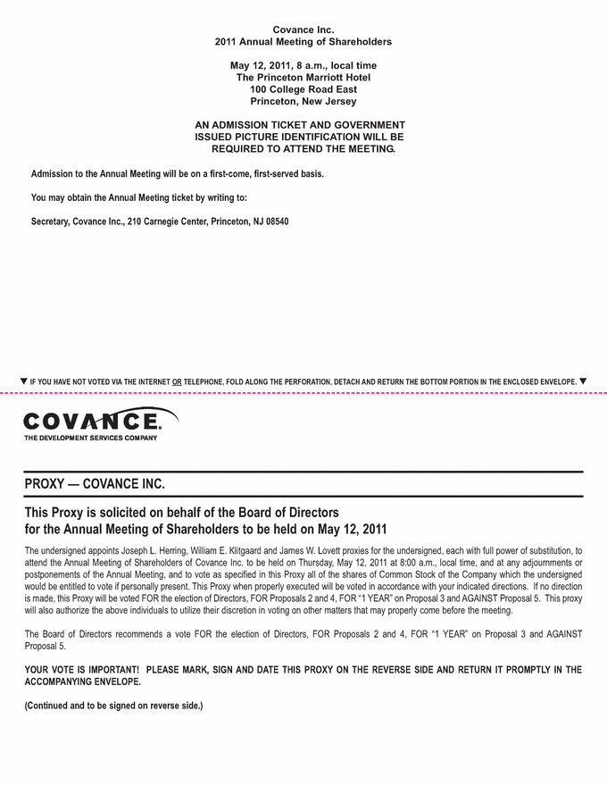 This Proxy is solicited on behalf of the Board of Directors for the Annual Meeting of Shareholders to be held on May 12, 2011 The undersigned appoints Joseph L. Herring, William E. Klitgaard and James W. Lovett proxies for the undersigned, each with full power of substitution, to attend the Annual Meeting of Shareholders of Covance Inc. to be held on Thursday, May 12, 2011 at 8:00 a.m., local time, and at any adjournments or postponements of the Annual Meeting, and to vote as specified in this Proxy all of the shares of Common Stock of the Company which the undersigned would be entitled to vote if personally present. This Proxy when properly executed will be voted in accordance with your indicated directions. If no direction is made, this Proxy will be voted FOR the election of Directors, FOR Proposals 2 and 4, FOR “1 YEAR” on Proposal 3 and AGAINST Proposal 5. This proxy will also authorize the above individuals to utilize their discretion in voting on other matters that may properly come before the meeting. The Board of Directors recommends a vote FOR the election of Directors, FOR Proposals 2 and 4, FOR “1 YEAR” on Proposal 3 and AGAINST Proposal 5. YOUR VOTE IS IMPORTANT! PLEASE MARK, SIGN AND DATE THIS PROXY ON THE REVERSE SIDE AND RETURN IT PROMPTLY IN THE ACCOMPANYING ENVELOPE. (Continued and to be signed on reverse side.) PROXY — COVANCE INC. Admission to the Annual Meeting will be on a first-come, first-served basis. You may obtain the Annual Meeting ticket by writing to: Secretary, Covance Inc., 210 Carnegie Center, Princeton, NJ 08540 Covance Inc. 2011 Annual Meeting of Shareholders May 12, 2011, 8 a.m., local time The Princeton Marriott Hotel 100 College Road East Princeton, New Jersey AN ADMISSION TICKET AND GOVERNMENT ISSUED PICTURE IDENTIFICATION WILL BE REQUIRED TO ATTEND THE MEETING. IF YOU HAVE NOT VOTED VIA THE INTERNET OR TELEPHONE, FOLD ALONG THE PERFORATION, DETACH AND RETURN THE BOTTOM PORTION IN THE ENCLOSED ENVELOPE. |