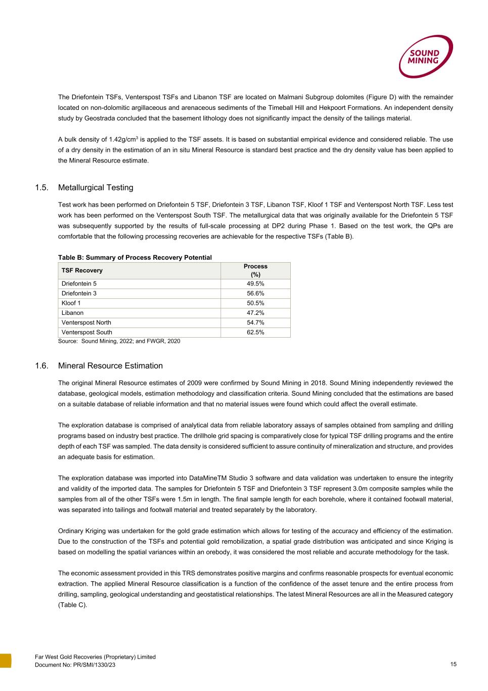 Far West Gold Recoveries (Proprietary) Limited Document No: PR/SMI/1330/23 15 The Driefontein TSFs, Venterspost TSFs and Libanon TSF are located on Malmani Subgroup dolomites (Figure D) with the remainder located on non-dolomitic argillaceous and arenaceous sediments of the Timeball Hill and Hekpoort Formations. An independent density study by Geostrada concluded that the basement lithology does not significantly impact the density of the tailings material. A bulk density of 1.42g/cm3 is applied to the TSF assets. It is based on substantial empirical evidence and considered reliable. The use of a dry density in the estimation of an in situ Mineral Resource is standard best practice and the dry density value has been applied to the Mineral Resource estimate. 1.5. Metallurgical Testing Test work has been performed on Driefontein 5 TSF, Driefontein 3 TSF, Libanon TSF, Kloof 1 TSF and Venterspost North TSF. Less test work has been performed on the Venterspost South TSF. The metallurgical data that was originally available for the Driefontein 5 TSF was subsequently supported by the results of full-scale processing at DP2 during Phase 1. Based on the test work, the QPs are comfortable that the following processing recoveries are achievable for the respective TSFs (Table B). Table B: Summary of Process Recovery Potential TSF Recovery Process (%) Driefontein 5 49.5% Driefontein 3 56.6% Kloof 1 50.5% Libanon 47.2% Venterspost North 54.7% Venterspost South 62.5% Source: Sound Mining, 2022; and FWGR, 2020 1.6. Mineral Resource Estimation The original Mineral Resource estimates of 2009 were confirmed by Sound Mining in 2018. Sound Mining independently reviewed the database, geological models, estimation methodology and classification criteria. Sound Mining concluded that the estimations are based on a suitable database of reliable information and that no material issues were found which could affect the overall estimate. The exploration database is comprised of analytical data from reliable laboratory assays of samples obtained from sampling and drilling programs based on industry best practice. The drillhole grid spacing is comparatively close for typical TSF drilling programs and the entire depth of each TSF was sampled. The data density is considered sufficient to assure continuity of mineralization and structure, and provides an adequate basis for estimation. The exploration database was imported into DataMineTM Studio 3 software and data validation was undertaken to ensure the integrity and validity of the imported data. The samples for Driefontein 5 TSF and Driefontein 3 TSF represent 3.0m composite samples while the samples from all of the other TSFs were 1.5m in length. The final sample length for each borehole, where it contained footwall material, was separated into tailings and footwall material and treated separately by the laboratory. Ordinary Kriging was undertaken for the gold grade estimation which allows for testing of the accuracy and efficiency of the estimation. Due to the construction of the TSFs and potential gold remobilization, a spatial grade distribution was anticipated and since Kriging is based on modelling the spatial variances within an orebody, it was considered the most reliable and accurate methodology for the task. The economic assessment provided in this TRS demonstrates positive margins and confirms reasonable prospects for eventual economic extraction. The applied Mineral Resource classification is a function of the confidence of the asset tenure and the entire process from drilling, sampling, geological understanding and geostatistical relationships. The latest Mineral Resources are all in the Measured category (Table C).
