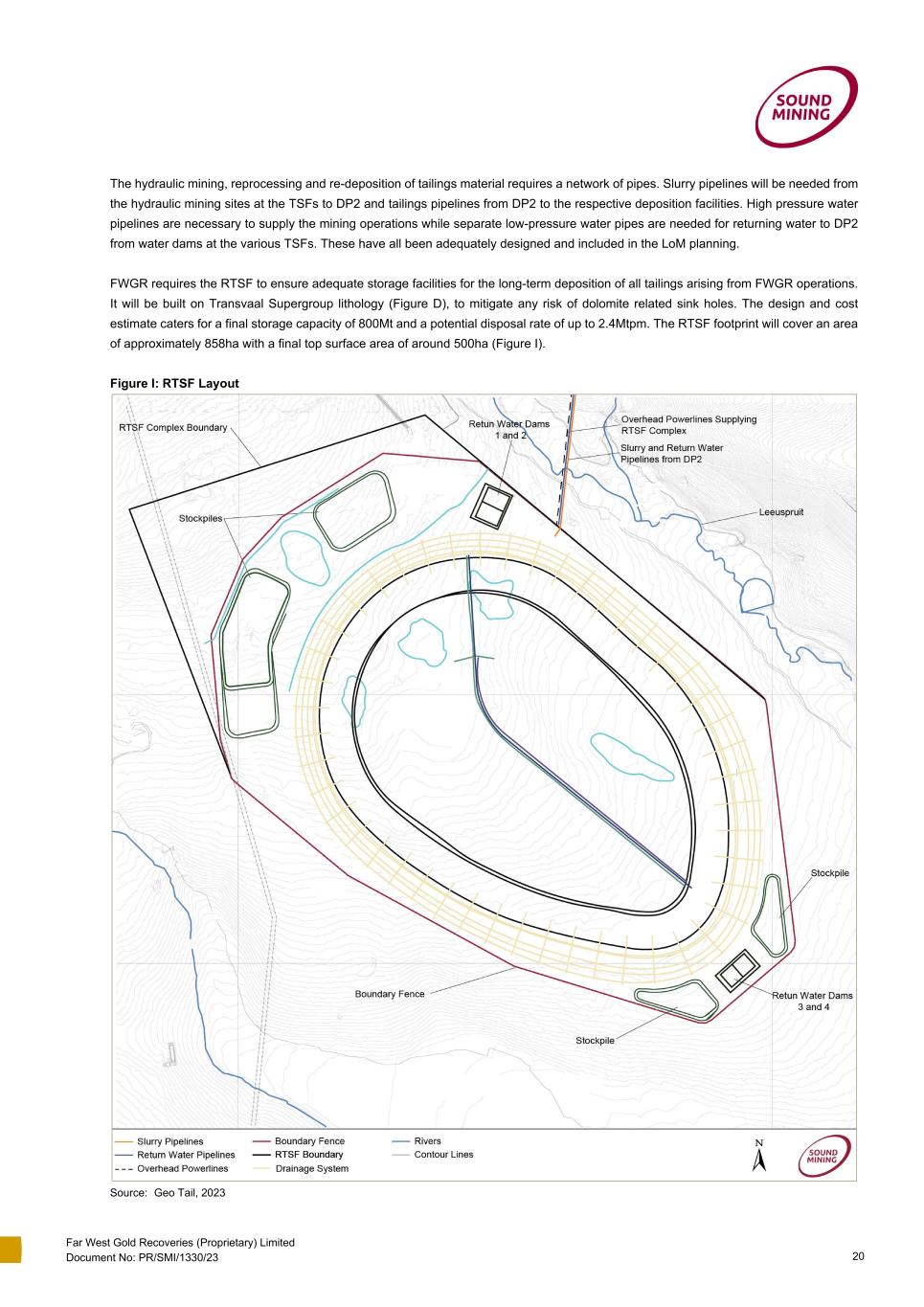 Far West Gold Recoveries (Proprietary) Limited Document No: PR/SMI/1330/23 20 The hydraulic mining, reprocessing and re-deposition of tailings material requires a network of pipes. Slurry pipelines will be needed from the hydraulic mining sites at the TSFs to DP2 and tailings pipelines from DP2 to the respective deposition facilities. High pressure water pipelines are necessary to supply the mining operations while separate low-pressure water pipes are needed for returning water to DP2 from water dams at the various TSFs. These have all been adequately designed and included in the LoM planning. FWGR requires the RTSF to ensure adequate storage facilities for the long-term deposition of all tailings arising from FWGR operations. It will be built on Transvaal Supergroup lithology (Figure D), to mitigate any risk of dolomite related sink holes. The design and cost estimate caters for a final storage capacity of 800Mt and a potential disposal rate of up to 2.4Mtpm. The RTSF footprint will cover an area of approximately 858ha with a final top surface area of around 500ha (Figure I). Figure I: RTSF Layout Source: Geo Tail, 2023