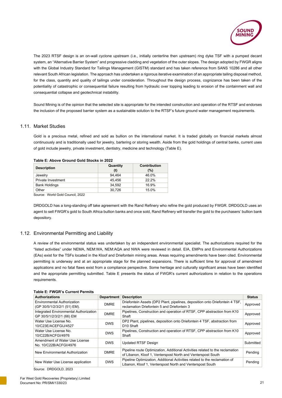 Far West Gold Recoveries (Proprietary) Limited Document No: PR/SMI/1330/23 21 The 2023 RTSF design is an on-wall cyclone upstream (i.e., initially centerline then upstream) ring dyke TSF with a pumped decant system, an “Alternative Barrier System” and progressive cladding and vegetation of the outer slopes. The design adopted by FWGR aligns with the Global Industry Standard for Tailings Management (GISTM) standard and has taken reference from SANS 10286 and all other relevant South African legislation. The approach has undertaken a rigorous iterative examination of an appropriate tailing disposal method, for the class, quantity and quality of tailings under consideration. Throughout the design process, cognizance has been taken of the potentiality of catastrophic or consequential failure resulting from hydraulic over topping leading to erosion of the containment wall and consequential collapse and geotechnical instability. Sound Mining is of the opinion that the selected site is appropriate for the intended construction and operation of the RTSF and endorses the inclusion of the proposed barrier system as a sustainable solution to the RTSF’s future ground water management requirements. 1.11. Market Studies Gold is a precious metal, refined and sold as bullion on the international market. It is traded globally on financial markets almost continuously and is traditionally used for jewelry, bartering or storing wealth. Aside from the gold holdings of central banks, current uses of gold include jewelry, private investment, dentistry, medicine and technology (Table E). Table E: Above Ground Gold Stocks in 2022 Description Quantity (t) Contribution (%) Jewelry 94,464 46.0% Private Investment 45,456 22.2% Bank Holdings 34,592 16.9% Other 30,726 15.0% Source: World Gold Council, 2022 DRDGOLD has a long-standing off take agreement with the Rand Refinery who refine the gold produced by FWGR. DRDGOLD uses an agent to sell FWGR’s gold to South Africa bullion banks and once sold, Rand Refinery will transfer the gold to the purchasers’ bullion bank depository. 1.12. Environmental Permitting and Liability A review of the environmental status was undertaken by an independent environmental specialist. The authorizations required for the “listed activities” under NEMA, NEM:WA, NEM:AQA and NWA were reviewed in detail. EIA, EMPrs and Environmental Authorizations (EAs) exist for the TSFs located in the Kloof and Driefontein mining areas. Areas requiring amendments have been cited. Environmental permitting is underway and at an appropriate stage for the planned expansions. There is sufficient time for approval of amendment applications and no fatal flaws exist from a compliance perspective. Some heritage and culturally significant areas have been identified and the appropriate permitting submitted. Table E presents the status of FWGR’s current authorizations in relation to the operations requirements. Table E: FWGR’s Current Permits Authorizations Department Description Status Environmental Authorization (GP 30/5/1/2/3/2/1 (51) EM). DMRE Driefontein Assets (DP2 Plant, pipelines, deposition onto Driefontein 4 TSF, reclamation Driefontein 5 and Driefontein 3 Approved Integrated Environmental Authorization GP 30/5/1/2/3/2/1 (66) EM DMRE Pipelines, Construction and operation of RTSF, CPP abstraction from K10 Shaft Approved Water Use License No. 10/C23E/ACEFGIJ/4527 DWS DP2 Plant, pipelines, deposition onto Driefontein 4 TSF, abstraction from D10 Shaft Approved Water Use License No. 10/C22B/ACFGI/4976 DWS Pipelines, Construction and operation of RTSF, CPP abstraction from K10 Shaft Approved Amendment of Water Use License No. 10/C22B/ACFGI/4976 DWS Updated RTSF Design Submitted New Environmental Authorization DMRE Pipeline route Optimization, Additional Activities related to the reclamation of Libanon, Kloof 1, Venterspost North and Venterspost South Pending New Water Use License application DWS Pipeline Optimization, Additional Activities related to the reclamation of Libanon, Kloof 1, Venterspost North and Venterspost South Pending Source: DRDGOLD, 2023