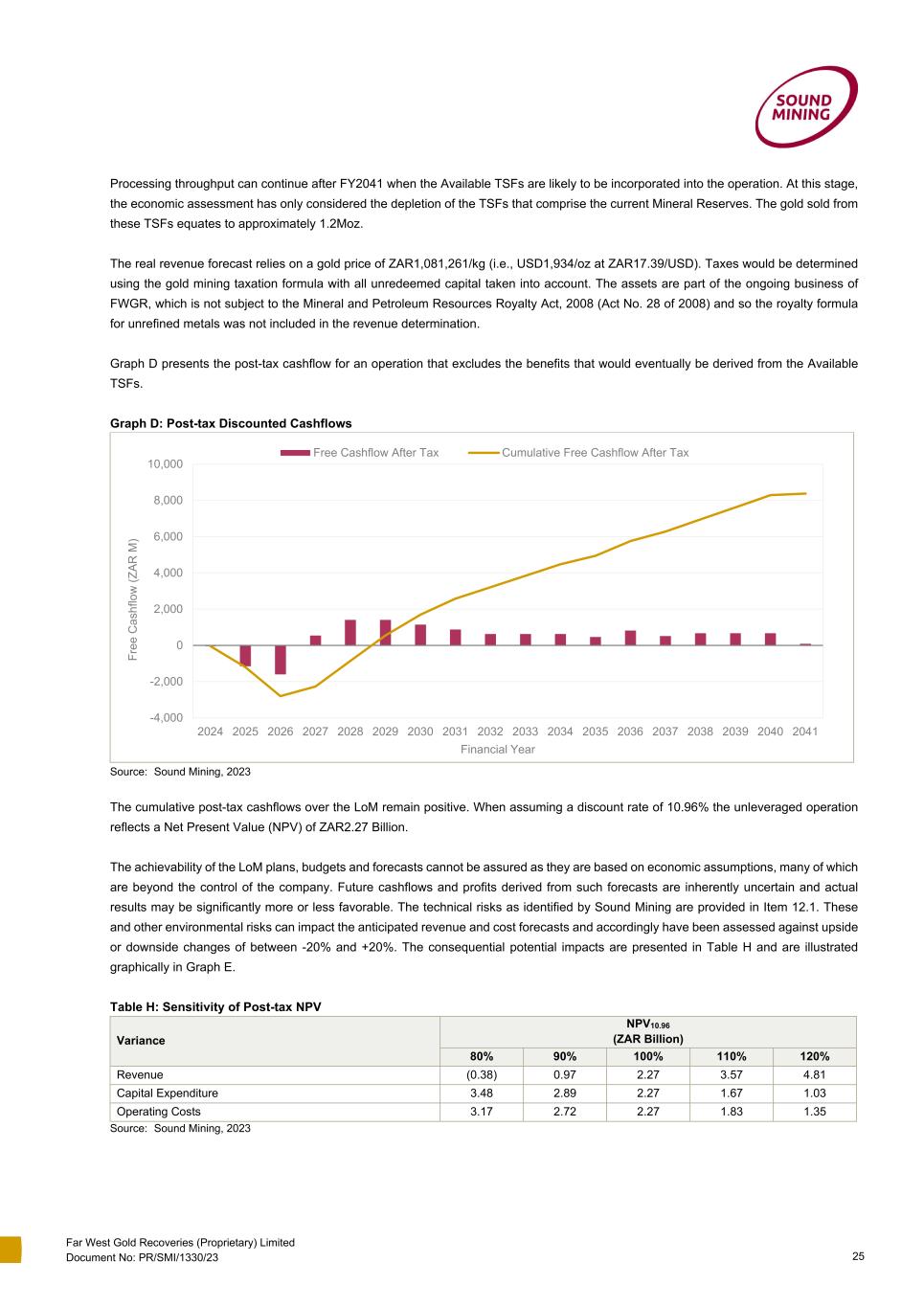 Far West Gold Recoveries (Proprietary) Limited Document No: PR/SMI/1330/23 110 Graph 11: Gold Sales Forecast Source: Sound Mining, 2023 Processing throughput can continue after FY2041 when the available TSFs are likely to be incorporated into the operation. At this stage, the economic assessment has only considered the depletion of the TSFs that comprise the current Mineral Reserves. The gold sold from these TSFs equate to approximately 1.2Moz. The real revenue forecast relies on a gold price of ZAR1,081,261/kg (i.e., USD1,934/oz at ZAR17.39/USD). Taxes would be determined using the gold mining tax formula with all unredeemed capital taken into account. The assets are part of the ongoing business of FWGR, which fall outside the ambit of the provision of the MPRDA that would place an obligation to pay royalties on the proceeds of the operations. 19.2. Cashflows Graph 12 presents the post-tax cashflow for an operation that excludes the benefits that would eventually be derived from the Available TSFs (see Error! Reference source not found.). Graph 12: Post-tax Discounted Cashflows Source: Sound Mining, 2023 0 500 1,000 1,500 2,000 2,500 3,000 3,500 2024 2025 2026 2027 2028 2029 2030 2031 2032 2033 2034 2035 2036 2037 2038 2039 2040 2041 G ol d So ld (k g) Financial Year -4,000 -2,000 0 2,000 4,000 6,000 8,000 10,000 2024 2025 2026 2027 2028 2029 2030 2031 2032 2033 2034 2035 2036 2037 2038 2039 2040 2041 Fr ee C as hf lo w (Z AR M ) Financial Year Free Cashflow After Tax Cumulative Free Cashflow After Tax