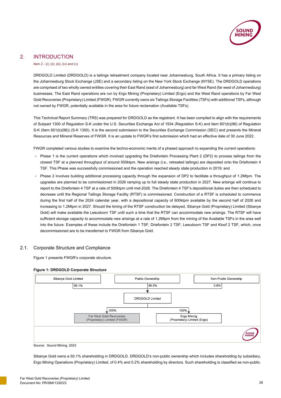 Far West Gold Recoveries (Proprietary) Limited Document No: PR/SMI/1330/23 28 2. INTRODUCTION Item 2 - (i); (ii); (iii); (iv) and (v) DRDGOLD Limited (DRDGOLD) is a tailings retreatment company located near Johannesburg, South Africa. It has a primary listing on the Johannesburg Stock Exchange (JSE) and a secondary listing on the New York Stock Exchange (NYSE). The DRDGOLD operations are comprised of two wholly owned entities covering their East Rand (east of Johannesburg) and far West Rand (far west of Johannesburg) businesses. The East Rand operations are run by Ergo Mining (Proprietary) Limited (Ergo) and the West Rand operations by Far West Gold Recoveries (Proprietary) Limited (FWGR). FWGR currently owns six Tailings Storage Facilities (TSFs) with additional TSFs, although not owned by FWGR, potentially available in the area for future reclamation (Available TSFs). This Technical Report Summary (TRS) was prepared for DRDGOLD as the registrant. It has been compiled to align with the requirements of Subpart 1300 of Regulation S-K under the U.S. Securities Exchange Act of 1934 (Regulation S-K) and Item 601(b)(96) of Regulation S-K (Item 601(b)(96)) (S-K 1300). It is the second submission to the Securities Exchange Commission (SEC) and presents the Mineral Resources and Mineral Reserves of FWGR. It is an update to FWGR’s first submission which had an effective date of 30 June 2022. FWGR completed various studies to examine the techno-economic merits of a phased approach to expanding the current operations: • Phase 1 is the current operations which involved upgrading the Driefontein Processing Plant 2 (DP2) to process tailings from the closest TSF at a planned throughput of around 500ktpm. New arisings (i.e., retreated tailings) are deposited onto the Driefontein 4 TSF. This Phase was successfully commissioned and the operation reached steady state production in 2019; and • Phase 2 involves building additional processing capacity through the expansion of DP2 to facilitate a throughput of 1.2Mtpm. The upgrades are planned to be commissioned in 2026 ramping up to full steady state production in 2027. New arisings will continue to report to the Driefontein 4 TSF at a rate of 500ktpm until mid-2026. The Driefontein 4 TSF’s depositional duties are then scheduled to decrease until the Regional Tailings Storage Facility (RTSF) is commissioned. Construction of a RTSF is scheduled to commence during the first half of the 2024 calendar year, with a depositional capacity of 600ktpm available by the second half of 2026 and increasing to 1.2Mtpm in 2027. Should the timing of the RTSF construction be delayed, Sibanye Gold (Proprietary) Limited (Sibanye Gold) will make available the Leeudoorn TSF until such a time that the RTSF can accommodate new arisings. The RTSF will have sufficient storage capacity to accommodate new arisings at a rate of 1.2Mtpm from the mining of the Available TSFs in the area well into the future. Examples of these include the Driefontein 1 TSF, Driefontein 2 TSF, Leeudoorn TSF and Kloof 2 TSF, which, once decommissioned are to be transferred to FWGR from Sibanye Gold. 2.1. Corporate Structure and Compliance Figure 1 presents FWGR’s corporate structure. Figure 1: DRDGOLD Corporate Structure Source: Sound Mining, 2023 Sibanye Gold owns a 50.1% shareholding in DRDGOLD. DRDGOLD’s non-public ownership which includes shareholding by subsidiary, Ergo Mining Operations (Proprietary) Limited, of 0.4% and 0.2% shareholding by directors. Such shareholding is classified as non-public.
