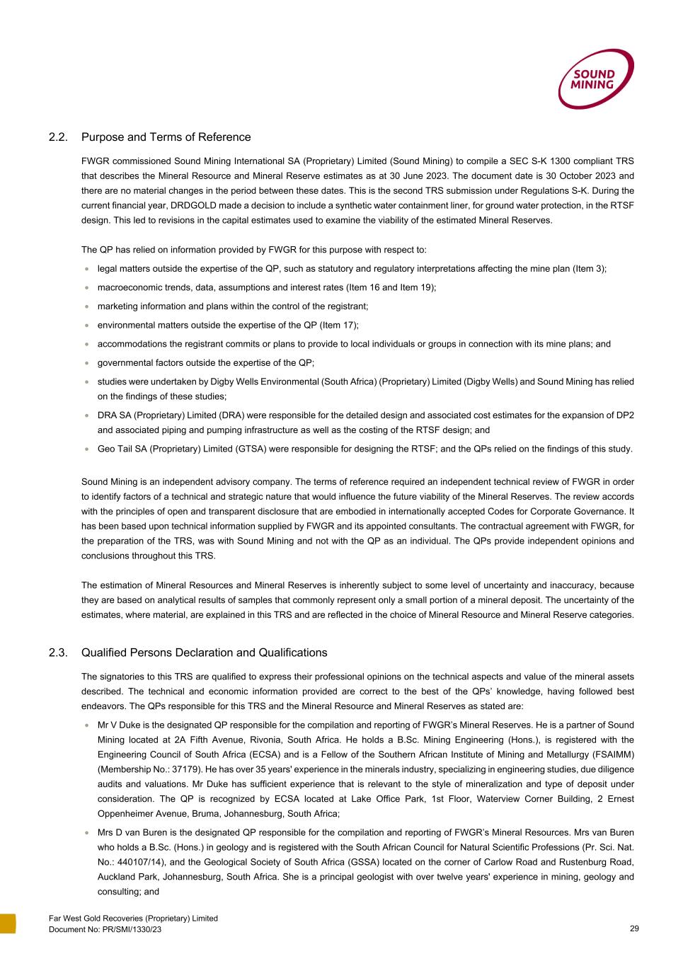 Far West Gold Recoveries (Proprietary) Limited Document No: PR/SMI/1330/23 29 2.2. Purpose and Terms of Reference FWGR commissioned Sound Mining International SA (Proprietary) Limited (Sound Mining) to compile a SEC S-K 1300 compliant TRS that describes the Mineral Resource and Mineral Reserve estimates as at 30 June 2023. The document date is 30 October 2023 and there are no material changes in the period between these dates. This is the second TRS submission under Regulations S-K. During the current financial year, DRDGOLD made a decision to include a synthetic water containment liner, for ground water protection, in the RTSF design. This led to revisions in the capital estimates used to examine the viability of the estimated Mineral Reserves. The QP has relied on information provided by FWGR for this purpose with respect to: • legal matters outside the expertise of the QP, such as statutory and regulatory interpretations affecting the mine plan (Item 3); • macroeconomic trends, data, assumptions and interest rates (Item 16 and Item 19); • marketing information and plans within the control of the registrant; • environmental matters outside the expertise of the QP (Item 17); • accommodations the registrant commits or plans to provide to local individuals or groups in connection with its mine plans; and • governmental factors outside the expertise of the QP; • studies were undertaken by Digby Wells Environmental (South Africa) (Proprietary) Limited (Digby Wells) and Sound Mining has relied on the findings of these studies; • DRA SA (Proprietary) Limited (DRA) were responsible for the detailed design and associated cost estimates for the expansion of DP2 and associated piping and pumping infrastructure as well as the costing of the RTSF design; and • Geo Tail SA (Proprietary) Limited (GTSA) were responsible for designing the RTSF; and the QPs relied on the findings of this study. Sound Mining is an independent advisory company. The terms of reference required an independent technical review of FWGR in order to identify factors of a technical and strategic nature that would influence the future viability of the Mineral Reserves. The review accords with the principles of open and transparent disclosure that are embodied in internationally accepted Codes for Corporate Governance. It has been based upon technical information supplied by FWGR and its appointed consultants. The contractual agreement with FWGR, for the preparation of the TRS, was with Sound Mining and not with the QP as an individual. The QPs provide independent opinions and conclusions throughout this TRS. The estimation of Mineral Resources and Mineral Reserves is inherently subject to some level of uncertainty and inaccuracy, because they are based on analytical results of samples that commonly represent only a small portion of a mineral deposit. The uncertainty of the estimates, where material, are explained in this TRS and are reflected in the choice of Mineral Resource and Mineral Reserve categories. 2.3. Qualified Persons Declaration and Qualifications The signatories to this TRS are qualified to express their professional opinions on the technical aspects and value of the mineral assets described. The technical and economic information provided are correct to the best of the QPs’ knowledge, having followed best endeavors. The QPs responsible for this TRS and the Mineral Resource and Mineral Reserves as stated are: • Mr V Duke is the designated QP responsible for the compilation and reporting of FWGR’s Mineral Reserves. He is a partner of Sound Mining located at 2A Fifth Avenue, Rivonia, South Africa. He holds a B.Sc. Mining Engineering (Hons.), is registered with the Engineering Council of South Africa (ECSA) and is a Fellow of the Southern African Institute of Mining and Metallurgy (FSAIMM) (Membership No.: 37179). He has over 35 years' experience in the minerals industry, specializing in engineering studies, due diligence audits and valuations. Mr Duke has sufficient experience that is relevant to the style of mineralization and type of deposit under consideration. The QP is recognized by ECSA located at Lake Office Park, 1st Floor, Waterview Corner Building, 2 Ernest Oppenheimer Avenue, Bruma, Johannesburg, South Africa; • Mrs D van Buren is the designated QP responsible for the compilation and reporting of FWGR’s Mineral Resources. Mrs van Buren who holds a B.Sc. (Hons.) in geology and is registered with the South African Council for Natural Scientific Professions (Pr. Sci. Nat. No.: 440107/14), and the Geological Society of South Africa (GSSA) located on the corner of Carlow Road and Rustenburg Road, Auckland Park, Johannesburg, South Africa. She is a principal geologist with over twelve years' experience in mining, geology and consulting; and