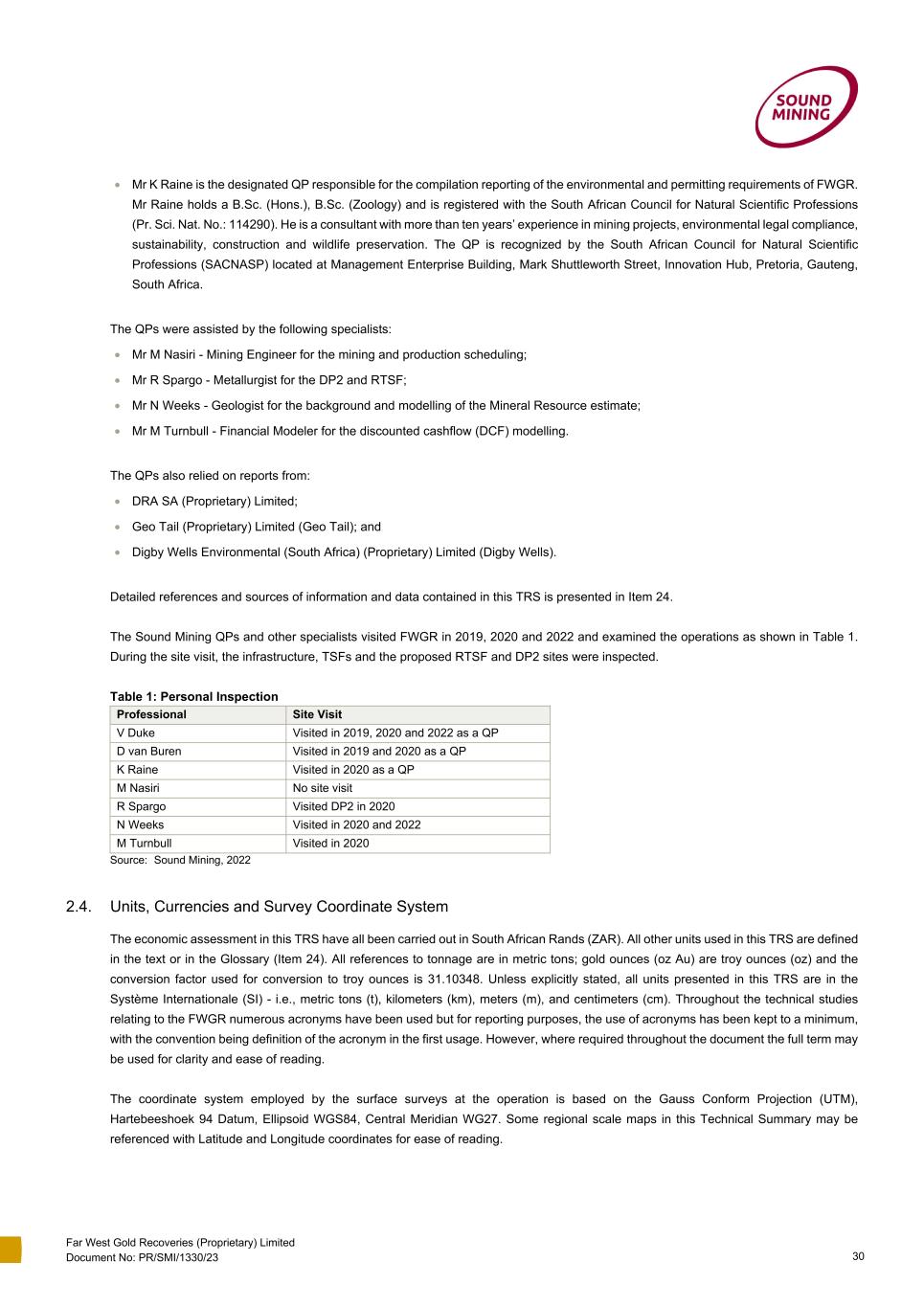 Far West Gold Recoveries (Proprietary) Limited Document No: PR/SMI/1330/23 30 • Mr K Raine is the designated QP responsible for the compilation reporting of the environmental and permitting requirements of FWGR. Mr Raine holds a B.Sc. (Hons.), B.Sc. (Zoology) and is registered with the South African Council for Natural Scientific Professions (Pr. Sci. Nat. No.: 114290). He is a consultant with more than ten years’ experience in mining projects, environmental legal compliance, sustainability, construction and wildlife preservation. The QP is recognized by the South African Council for Natural Scientific Professions (SACNASP) located at Management Enterprise Building, Mark Shuttleworth Street, Innovation Hub, Pretoria, Gauteng, South Africa. The QPs were assisted by the following specialists: • Mr M Nasiri - Mining Engineer for the mining and production scheduling; • Mr R Spargo - Metallurgist for the DP2 and RTSF; • Mr N Weeks - Geologist for the background and modelling of the Mineral Resource estimate; • Mr M Turnbull - Financial Modeler for the discounted cashflow (DCF) modelling. The QPs also relied on reports from: • DRA SA (Proprietary) Limited; • Geo Tail (Proprietary) Limited (Geo Tail); and • Digby Wells Environmental (South Africa) (Proprietary) Limited (Digby Wells). Detailed references and sources of information and data contained in this TRS is presented in Item 24. The Sound Mining QPs and other specialists visited FWGR in 2019, 2020 and 2022 and examined the operations as shown in Table 1. During the site visit, the infrastructure, TSFs and the proposed RTSF and DP2 sites were inspected. Table 1: Personal Inspection Professional Site Visit V Duke Visited in 2019, 2020 and 2022 as a QP D van Buren Visited in 2019 and 2020 as a QP K Raine Visited in 2020 as a QP M Nasiri No site visit R Spargo Visited DP2 in 2020 N Weeks Visited in 2020 and 2022 M Turnbull Visited in 2020 Source: Sound Mining, 2022 2.4. Units, Currencies and Survey Coordinate System The economic assessment in this TRS have all been carried out in South African Rands (ZAR). All other units used in this TRS are defined in the text or in the Glossary (Item 24). All references to tonnage are in metric tons; gold ounces (oz Au) are troy ounces (oz) and the conversion factor used for conversion to troy ounces is 31.10348. Unless explicitly stated, all units presented in this TRS are in the Système Internationale (SI) - i.e., metric tons (t), kilometers (km), meters (m), and centimeters (cm). Throughout the technical studies relating to the FWGR numerous acronyms have been used but for reporting purposes, the use of acronyms has been kept to a minimum, with the convention being definition of the acronym in the first usage. However, where required throughout the document the full term may be used for clarity and ease of reading. The coordinate system employed by the surface surveys at the operation is based on the Gauss Conform Projection (UTM), Hartebeeshoek 94 Datum, Ellipsoid WGS84, Central Meridian WG27. Some regional scale maps in this Technical Summary may be referenced with Latitude and Longitude coordinates for ease of reading.