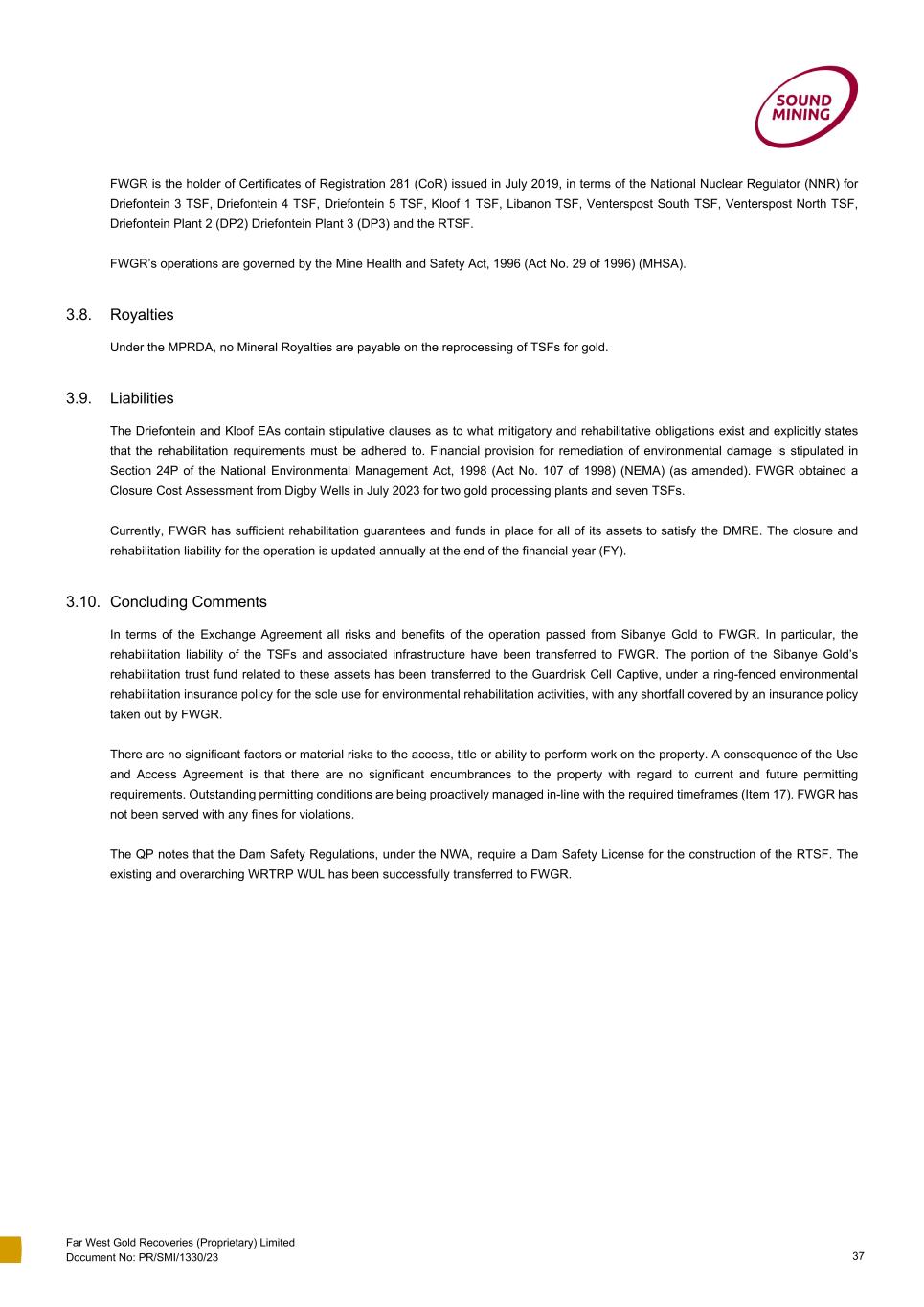 Far West Gold Recoveries (Proprietary) Limited Document No: PR/SMI/1330/23 37 FWGR is the holder of Certificates of Registration 281 (CoR) issued in July 2019, in terms of the National Nuclear Regulator (NNR) for Driefontein 3 TSF, Driefontein 4 TSF, Driefontein 5 TSF, Kloof 1 TSF, Libanon TSF, Venterspost South TSF, Venterspost North TSF, Driefontein Plant 2 (DP2) Driefontein Plant 3 (DP3) and the RTSF. FWGR’s operations are governed by the Mine Health and Safety Act, 1996 (Act No. 29 of 1996) (MHSA). 3.8. Royalties Under the MPRDA, no Mineral Royalties are payable on the reprocessing of TSFs for gold. 3.9. Liabilities The Driefontein and Kloof EAs contain stipulative clauses as to what mitigatory and rehabilitative obligations exist and explicitly states that the rehabilitation requirements must be adhered to. Financial provision for remediation of environmental damage is stipulated in Section 24P of the National Environmental Management Act, 1998 (Act No. 107 of 1998) (NEMA) (as amended). FWGR obtained a Closure Cost Assessment from Digby Wells in July 2023 for two gold processing plants and seven TSFs. Currently, FWGR has sufficient rehabilitation guarantees and funds in place for all of its assets to satisfy the DMRE. The closure and rehabilitation liability for the operation is updated annually at the end of the financial year (FY). 3.10. Concluding Comments In terms of the Exchange Agreement all risks and benefits of the operation passed from Sibanye Gold to FWGR. In particular, the rehabilitation liability of the TSFs and associated infrastructure have been transferred to FWGR. The portion of the Sibanye Gold’s rehabilitation trust fund related to these assets has been transferred to the Guardrisk Cell Captive, under a ring-fenced environmental rehabilitation insurance policy for the sole use for environmental rehabilitation activities, with any shortfall covered by an insurance policy taken out by FWGR. There are no significant factors or material risks to the access, title or ability to perform work on the property. A consequence of the Use and Access Agreement is that there are no significant encumbrances to the property with regard to current and future permitting requirements. Outstanding permitting conditions are being proactively managed in-line with the required timeframes (Item 17). FWGR has not been served with any fines for violations. The QP notes that the Dam Safety Regulations, under the NWA, require a Dam Safety License for the construction of the RTSF. The existing and overarching WRTRP WUL has been successfully transferred to FWGR.