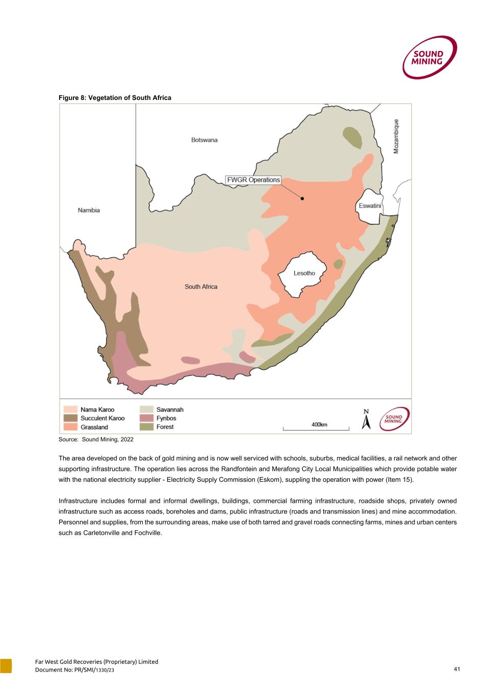 Far West Gold Recoveries (Proprietary) Limited Document No: PR/SMI/1330/23 41 Figure 8: Vegetation of South Africa Source: Sound Mining, 2022 The area developed on the back of gold mining and is now well serviced with schools, suburbs, medical facilities, a rail network and other supporting infrastructure. The operation lies across the Randfontein and Merafong City Local Municipalities which provide potable water with the national electricity supplier - Electricity Supply Commission (Eskom), suppling the operation with power (Item 15). Infrastructure includes formal and informal dwellings, buildings, commercial farming infrastructure, roadside shops, privately owned infrastructure such as access roads, boreholes and dams, public infrastructure (roads and transmission lines) and mine accommodation. Personnel and supplies, from the surrounding areas, make use of both tarred and gravel roads connecting farms, mines and urban centers such as Carletonville and Fochville.