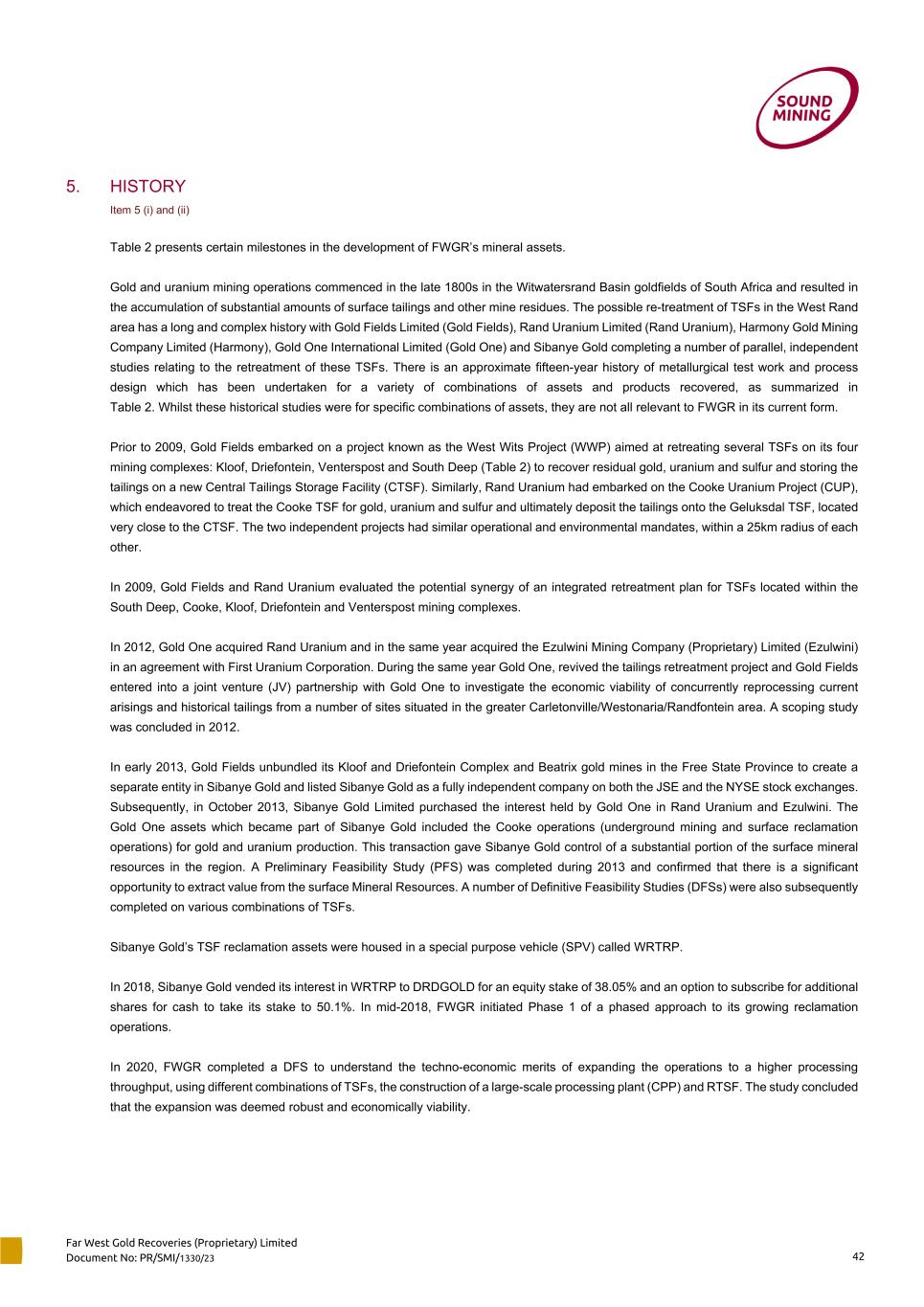 Far West Gold Recoveries (Proprietary) Limited Document No: PR/SMI/1330/23 42 5. HISTORY Item 5 (i) and (ii) Table 2 presents certain milestones in the development of FWGR’s mineral assets. Gold and uranium mining operations commenced in the late 1800s in the Witwatersrand Basin goldfields of South Africa and resulted in the accumulation of substantial amounts of surface tailings and other mine residues. The possible re-treatment of TSFs in the West Rand area has a long and complex history with Gold Fields Limited (Gold Fields), Rand Uranium Limited (Rand Uranium), Harmony Gold Mining Company Limited (Harmony), Gold One International Limited (Gold One) and Sibanye Gold completing a number of parallel, independent studies relating to the retreatment of these TSFs. There is an approximate fifteen-year history of metallurgical test work and process design which has been undertaken for a variety of combinations of assets and products recovered, as summarized in Table 2. Whilst these historical studies were for specific combinations of assets, they are not all relevant to FWGR in its current form. Prior to 2009, Gold Fields embarked on a project known as the West Wits Project (WWP) aimed at retreating several TSFs on its four mining complexes: Kloof, Driefontein, Venterspost and South Deep (Table 2) to recover residual gold, uranium and sulfur and storing the tailings on a new Central Tailings Storage Facility (CTSF). Similarly, Rand Uranium had embarked on the Cooke Uranium Project (CUP), which endeavored to treat the Cooke TSF for gold, uranium and sulfur and ultimately deposit the tailings onto the Geluksdal TSF, located very close to the CTSF. The two independent projects had similar operational and environmental mandates, within a 25km radius of each other. In 2009, Gold Fields and Rand Uranium evaluated the potential synergy of an integrated retreatment plan for TSFs located within the South Deep, Cooke, Kloof, Driefontein and Venterspost mining complexes. In 2012, Gold One acquired Rand Uranium and in the same year acquired the Ezulwini Mining Company (Proprietary) Limited (Ezulwini) in an agreement with First Uranium Corporation. During the same year Gold One, revived the tailings retreatment project and Gold Fields entered into a joint venture (JV) partnership with Gold One to investigate the economic viability of concurrently reprocessing current arisings and historical tailings from a number of sites situated in the greater Carletonville/Westonaria/Randfontein area. A scoping study was concluded in 2012. In early 2013, Gold Fields unbundled its Kloof and Driefontein Complex and Beatrix gold mines in the Free State Province to create a separate entity in Sibanye Gold and listed Sibanye Gold as a fully independent company on both the JSE and the NYSE stock exchanges. Subsequently, in October 2013, Sibanye Gold Limited purchased the interest held by Gold One in Rand Uranium and Ezulwini. The Gold One assets which became part of Sibanye Gold included the Cooke operations (underground mining and surface reclamation operations) for gold and uranium production. This transaction gave Sibanye Gold control of a substantial portion of the surface mineral resources in the region. A Preliminary Feasibility Study (PFS) was completed during 2013 and confirmed that there is a significant opportunity to extract value from the surface Mineral Resources. A number of Definitive Feasibility Studies (DFSs) were also subsequently completed on various combinations of TSFs. Sibanye Gold’s TSF reclamation assets were housed in a special purpose vehicle (SPV) called WRTRP. In 2018, Sibanye Gold vended its interest in WRTRP to DRDGOLD for an equity stake of 38.05% and an option to subscribe for additional shares for cash to take its stake to 50.1%. In mid-2018, FWGR initiated Phase 1 of a phased approach to its growing reclamation operations. In 2020, FWGR completed a DFS to understand the techno-economic merits of expanding the operations to a higher processing throughput, using different combinations of TSFs, the construction of a large-scale processing plant (CPP) and RTSF. The study concluded that the expansion was deemed robust and economically viability.
