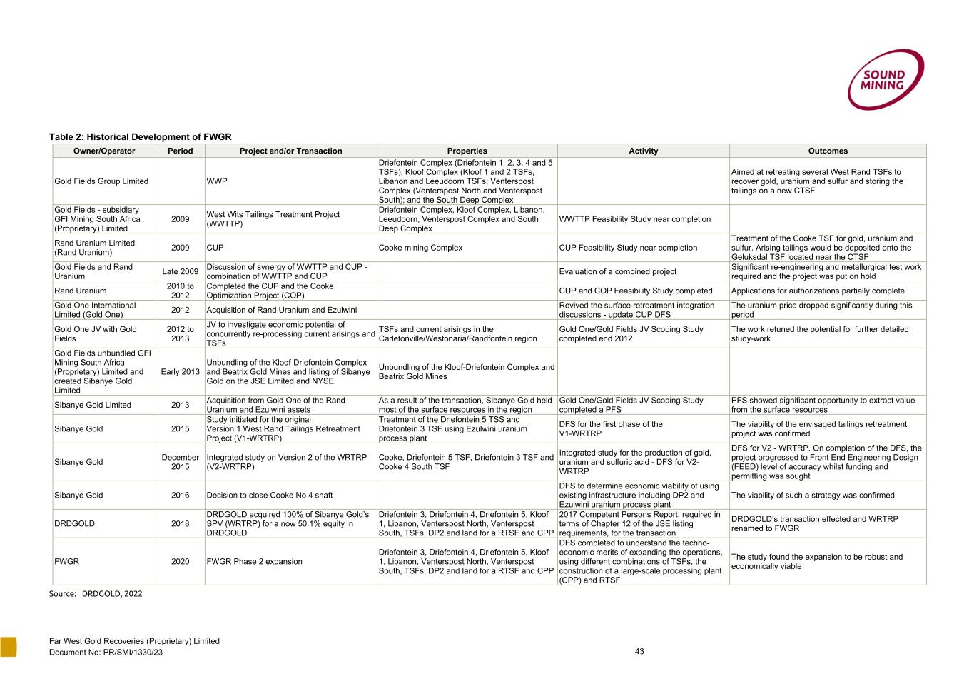 Far West Gold Recoveries (Proprietary) Limited Document No: PR/SMI/1330/23 43 Table 2: Historical Development of FWGR Owner/Operator Period Project and/or Transaction Properties Activity Outcomes Gold Fields Group Limited WWP Driefontein Complex (Driefontein 1, 2, 3, 4 and 5 TSFs); Kloof Complex (Kloof 1 and 2 TSFs, Libanon and Leeudoorn TSFs; Venterspost Complex (Venterspost North and Venterspost South); and the South Deep Complex Aimed at retreating several West Rand TSFs to recover gold, uranium and sulfur and storing the tailings on a new CTSF Gold Fields - subsidiary GFI Mining South Africa (Proprietary) Limited 2009 West Wits Tailings Treatment Project (WWTTP) Driefontein Complex, Kloof Complex, Libanon, Leeudoorn, Venterspost Complex and South Deep Complex WWTTP Feasibility Study near completion Rand Uranium Limited (Rand Uranium) 2009 CUP Cooke mining Complex CUP Feasibility Study near completion Treatment of the Cooke TSF for gold, uranium and sulfur. Arising tailings would be deposited onto the Geluksdal TSF located near the CTSF Gold Fields and Rand Uranium Late 2009 Discussion of synergy of WWTTP and CUP - combination of WWTTP and CUP Evaluation of a combined project Significant re-engineering and metallurgical test work required and the project was put on hold Rand Uranium 2010 to 2012 Completed the CUP and the Cooke Optimization Project (COP) CUP and COP Feasibility Study completed Applications for authorizations partially complete Gold One International Limited (Gold One) 2012 Acquisition of Rand Uranium and Ezulwini Revived the surface retreatment integration discussions - update CUP DFS The uranium price dropped significantly during this period Gold One JV with Gold Fields 2012 to 2013 JV to investigate economic potential of concurrently re-processing current arisings and TSFs TSFs and current arisings in the Carletonville/Westonaria/Randfontein region Gold One/Gold Fields JV Scoping Study completed end 2012 The work retuned the potential for further detailed study-work Gold Fields unbundled GFI Mining South Africa (Proprietary) Limited and created Sibanye Gold Limited Early 2013 Unbundling of the Kloof-Driefontein Complex and Beatrix Gold Mines and listing of Sibanye Gold on the JSE Limited and NYSE Unbundling of the Kloof-Driefontein Complex and Beatrix Gold Mines Sibanye Gold Limited 2013 Acquisition from Gold One of the Rand Uranium and Ezulwini assets As a result of the transaction, Sibanye Gold held most of the surface resources in the region Gold One/Gold Fields JV Scoping Study completed a PFS PFS showed significant opportunity to extract value from the surface resources Sibanye Gold 2015 Study initiated for the original Version 1 West Rand Tailings Retreatment Project (V1-WRTRP) Treatment of the Driefontein 5 TSS and Driefontein 3 TSF using Ezulwini uranium process plant DFS for the first phase of the V1-WRTRP The viability of the envisaged tailings retreatment project was confirmed Sibanye Gold December 2015 Integrated study on Version 2 of the WRTRP (V2-WRTRP) Cooke, Driefontein 5 TSF, Driefontein 3 TSF and Cooke 4 South TSF Integrated study for the production of gold, uranium and sulfuric acid - DFS for V2- WRTRP DFS for V2 - WRTRP. On completion of the DFS, the project progressed to Front End Engineering Design (FEED) level of accuracy whilst funding and permitting was sought Sibanye Gold 2016 Decision to close Cooke No 4 shaft DFS to determine economic viability of using existing infrastructure including DP2 and Ezulwini uranium process plant The viability of such a strategy was confirmed DRDGOLD 2018 DRDGOLD acquired 100% of Sibanye Gold’s SPV (WRTRP) for a now 50.1% equity in DRDGOLD Driefontein 3, Driefontein 4, Driefontein 5, Kloof 1, Libanon, Venterspost North, Venterspost South, TSFs, DP2 and land for a RTSF and CPP 2017 Competent Persons Report, required in terms of Chapter 12 of the JSE listing requirements, for the transaction DRDGOLD’s transaction effected and WRTRP renamed to FWGR FWGR 2020 FWGR Phase 2 expansion Driefontein 3, Driefontein 4, Driefontein 5, Kloof 1, Libanon, Venterspost North, Venterspost South, TSFs, DP2 and land for a RTSF and CPP DFS completed to understand the techno- economic merits of expanding the operations, using different combinations of TSFs, the construction of a large-scale processing plant (CPP) and RTSF The study found the expansion to be robust and economically viable Source: DRDGOLD, 2022