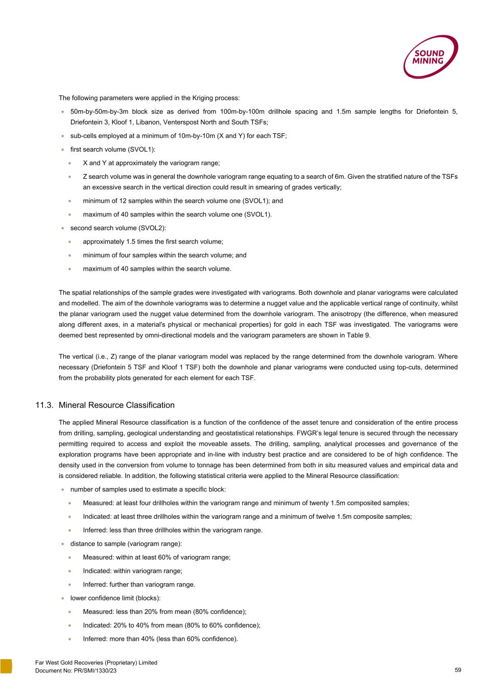Far West Gold Recoveries (Proprietary) Limited Document No: PR/SMI/1330/23 59 The following parameters were applied in the Kriging process: • 50m-by-50m-by-3m block size as derived from 100m-by-100m drillhole spacing and 1.5m sample lengths for Driefontein 5, Driefontein 3, Kloof 1, Libanon, Venterspost North and South TSFs; • sub-cells employed at a minimum of 10m-by-10m (X and Y) for each TSF; • first search volume (SVOL1): • X and Y at approximately the variogram range; • Z search volume was in general the downhole variogram range equating to a search of 6m. Given the stratified nature of the TSFs an excessive search in the vertical direction could result in smearing of grades vertically; • minimum of 12 samples within the search volume one (SVOL1); and • maximum of 40 samples within the search volume one (SVOL1). • second search volume (SVOL2): • approximately 1.5 times the first search volume; • minimum of four samples within the search volume; and • maximum of 40 samples within the search volume. The spatial relationships of the sample grades were investigated with variograms. Both downhole and planar variograms were calculated and modelled. The aim of the downhole variograms was to determine a nugget value and the applicable vertical range of continuity, whilst the planar variogram used the nugget value determined from the downhole variogram. The anisotropy (the difference, when measured along different axes, in a material's physical or mechanical properties) for gold in each TSF was investigated. The variograms were deemed best represented by omni-directional models and the variogram parameters are shown in Table 9. The vertical (i.e., Z) range of the planar variogram model was replaced by the range determined from the downhole variogram. Where necessary (Driefontein 5 TSF and Kloof 1 TSF) both the downhole and planar variograms were conducted using top-cuts, determined from the probability plots generated for each element for each TSF. 11.3. Mineral Resource Classification The applied Mineral Resource classification is a function of the confidence of the asset tenure and consideration of the entire process from drilling, sampling, geological understanding and geostatistical relationships. FWGR’s legal tenure is secured through the necessary permitting required to access and exploit the moveable assets. The drilling, sampling, analytical processes and governance of the exploration programs have been appropriate and in-line with industry best practice and are considered to be of high confidence. The density used in the conversion from volume to tonnage has been determined from both in situ measured values and empirical data and is considered reliable. In addition, the following statistical criteria were applied to the Mineral Resource classification: • number of samples used to estimate a specific block: • Measured: at least four drillholes within the variogram range and minimum of twenty 1.5m composited samples; • Indicated: at least three drillholes within the variogram range and a minimum of twelve 1.5m composite samples; • Inferred: less than three drillholes within the variogram range. • distance to sample (variogram range): • Measured: within at least 60% of variogram range; • Indicated: within variogram range; • Inferred: further than variogram range. • lower confidence limit (blocks): • Measured: less than 20% from mean (80% confidence); • Indicated: 20% to 40% from mean (80% to 60% confidence); • Inferred: more than 40% (less than 60% confidence).