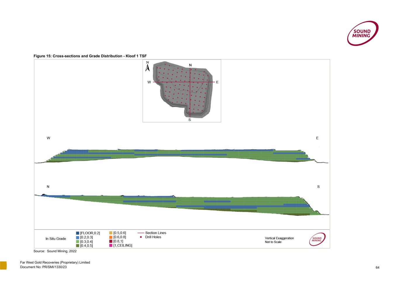 Far West Gold Recoveries (Proprietary) Limited Document No: PR/SMI/1330/23 64 Figure 15: Cross-sections and Grade Distribution - Kloof 1 TSF Source: Sound Mining, 2022