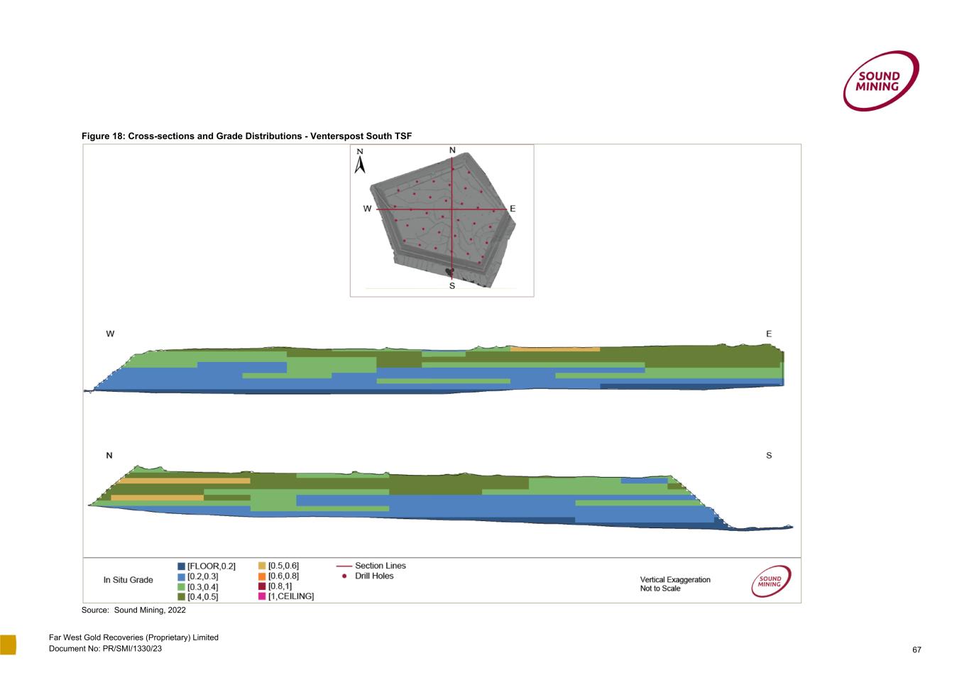 Far West Gold Recoveries (Proprietary) Limited Document No: PR/SMI/1330/23 66 Figure 17: Cross-sections and Grade Distribution - Venterspost North TSF Source: Sound Mining, 2022