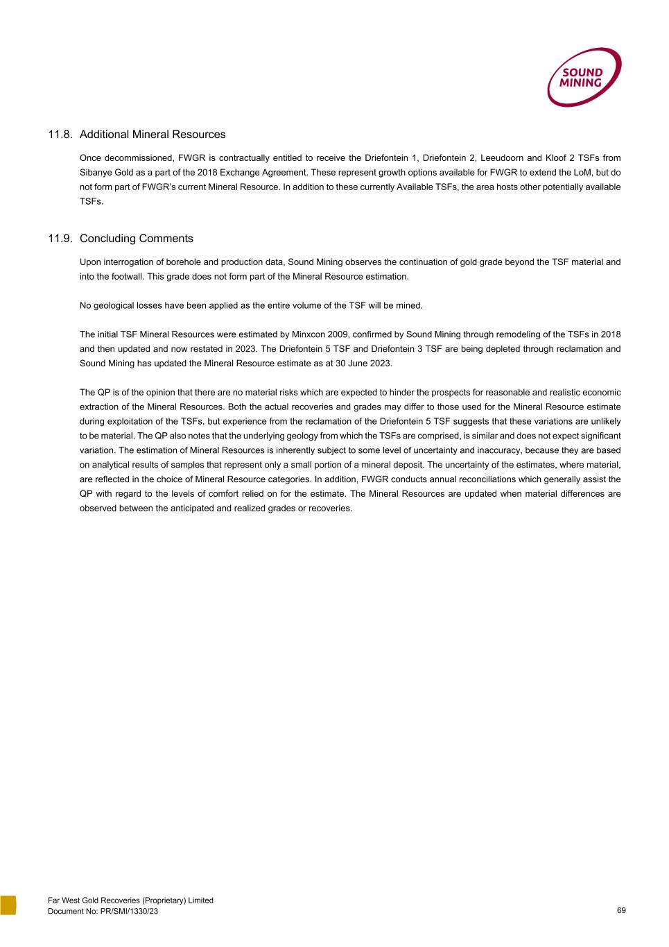 Far West Gold Recoveries (Proprietary) Limited Document No: PR/SMI/1330/23 69 11.8. Additional Mineral Resources Once decommissioned, FWGR is contractually entitled to receive the Driefontein 1, Driefontein 2, Leeudoorn and Kloof 2 TSFs from Sibanye Gold as a part of the 2018 Exchange Agreement. These represent growth options available for FWGR to extend the LoM, but do not form part of FWGR’s current Mineral Resource. In addition to these currently Available TSFs, the area hosts other potentially available TSFs. 11.9. Concluding Comments Upon interrogation of borehole and production data, Sound Mining observes the continuation of gold grade beyond the TSF material and into the footwall. This grade does not form part of the Mineral Resource estimation. No geological losses have been applied as the entire volume of the TSF will be mined. The initial TSF Mineral Resources were estimated by Minxcon 2009, confirmed by Sound Mining through remodeling of the TSFs in 2018 and then updated and now restated in 2023. The Driefontein 5 TSF and Driefontein 3 TSF are being depleted through reclamation and Sound Mining has updated the Mineral Resource estimate as at 30 June 2023. The QP is of the opinion that there are no material risks which are expected to hinder the prospects for reasonable and realistic economic extraction of the Mineral Resources. Both the actual recoveries and grades may differ to those used for the Mineral Resource estimate during exploitation of the TSFs, but experience from the reclamation of the Driefontein 5 TSF suggests that these variations are unlikely to be material. The QP also notes that the underlying geology from which the TSFs are comprised, is similar and does not expect significant variation. The estimation of Mineral Resources is inherently subject to some level of uncertainty and inaccuracy, because they are based on analytical results of samples that represent only a small portion of a mineral deposit. The uncertainty of the estimates, where material, are reflected in the choice of Mineral Resource categories. In addition, FWGR conducts annual reconciliations which generally assist the QP with regard to the levels of comfort relied on for the estimate. The Mineral Resources are updated when material differences are observed between the anticipated and realized grades or recoveries.