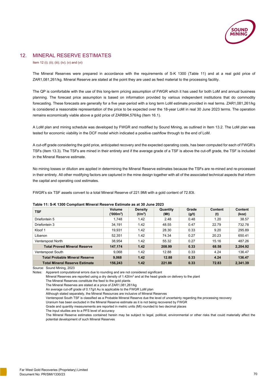 Far West Gold Recoveries (Proprietary) Limited Document No: PR/SMI/1330/23 70 12. MINERAL RESERVE ESTIMATES Item 12 (i); (ii); (iii); (iv); (v) and (vi) The Mineral Reserves were prepared in accordance with the requirements of S-K 1300 (Table 11) and at a real gold price of ZAR1,081,261/kg. Mineral Reserve are stated at the point they are used as feed material to the processing facility. The QP is comfortable with the use of this long-term pricing assumption of FWGR which it has used for both LoM and annual business planning. The forecast price assumption is based on information provided by various independent institutions that do commodity forecasting. These forecasts are generally for a five year-period with a long term LoM estimate provided in real terms. ZAR1,081,261/kg is considered a reasonable representation of the price to be expected over the 18-year LoM in real 30 June 2023 terms. The operation remains economically viable above a gold price of ZAR894,576/kg (Item 16.1). A LoM plan and mining schedule was developed by FWGR and modified by Sound Mining, as outlined in Item 13.2. The LoM plan was tested for economic viability in the DCF model which indicated a positive cashflow through to the end of LoM. A cut-off grade considering the gold price, anticipated recovery and the expected operating costs, has been computed for each of FWGR’s TSFs (Item 13.3). The TSFs are mined in their entirety and if the average grade of a TSF is above the cut-off grade, the TSF is included in the Mineral Reserve estimate. No mining losses or dilution are applied in determining the Mineral Reserve estimates because the TSFs are re-mined and re-processed in their entirety. All other modifying factors are captured in the mine design together with all of the associated technical aspects that inform the capital and operating cost estimates. FWGR’s six TSF assets convert to a total Mineral Reserve of 221.9Mt with a gold content of 72.83t. Table 11: S-K 1300 Compliant Mineral Reserve Estimate as at 30 June 2023 TSF Volume ('000m3) Density (t/m3) Quantity (Mt) Grade (g/t) Content (t) Content (koz) Driefontein 5 1,748 1.42 2.48 0.48 1.20 38.57 Driefontein 3 34,191 1.42 48.55 0.47 22.79 732.78 Kloof 1 19,931 1.42 28.30 0.33 9.20 295.89 Libanon 52,351 1.42 74.34 0.27 20.23 650.41 Venterspost North 38,954 1.42 55.32 0.27 15.16 487.26 Total Proved Mineral Reserve 147,174 1.42 208.99 0.33 68.58 2,204.92 Venterspost South 9,068 1.42 12.88 0.33 4.24 136.47 Total Probable Mineral Reserve 9,068 1.42 12.88 0.33 4.24 136.47 Total Mineral Reserve Estimate 156,243 1.42 221.86 0.33 72.83 2,341.39 Source: Sound Mining, 2023 Notes: Apparent computational errors due to rounding and are not considered significant Mineral Reserves are reported using a dry density of 1.42t/m3 and at the head grade on delivery to the plant The Mineral Reserves constitute the feed to the gold plants The Mineral Reserves are stated at a price of ZAR1,081,261/kg An average cut-off grade of 0.17g/t Au is applicable to the FWGR LoM plan Although stated separately, the Mineral Resources are inclusive of Mineral Reserves Venterspost South TSF is classified as a Probable Mineral Reserve due the level of uncertainty regarding the processing recovery Uranium has been excluded in the Mineral Reserve estimate as it is not being recovered by FWGR Grade and quantity measurements are reported in metric units (Mt) rounded to two decimal places The input studies are to a PFS level of accuracy The Mineral Reserve estimates contained herein may be subject to legal, political, environmental or other risks that could materially affect the potential development of such Mineral Reserves