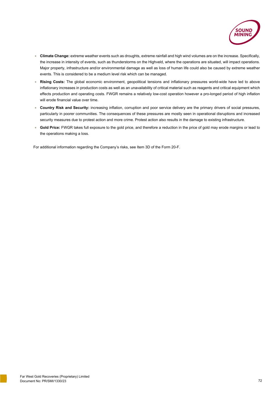 Far West Gold Recoveries (Proprietary) Limited Document No: PR/SMI/1330/23 72 • Climate Change: extreme weather events such as droughts, extreme rainfall and high wind volumes are on the increase. Specifically, the increase in intensity of events, such as thunderstorms on the Highveld, where the operations are situated, will impact operations. Major property, infrastructure and/or environmental damage as well as loss of human life could also be caused by extreme weather events. This is considered to be a medium level risk which can be managed. • Rising Costs: The global economic environment, geopolitical tensions and inflationary pressures world-wide have led to above inflationary increases in production costs as well as an unavailability of critical material such as reagents and critical equipment which effects production and operating costs. FWGR remains a relatively low-cost operation however a pro-longed period of high inflation will erode financial value over time. • Country Risk and Security: increasing inflation, corruption and poor service delivery are the primary drivers of social pressures, particularly in poorer communities. The consequences of these pressures are mostly seen in operational disruptions and increased security measures due to protest action and more crime. Protest action also results in the damage to existing infrastructure. • Gold Price: FWGR takes full exposure to the gold price, and therefore a reduction in the price of gold may erode margins or lead to the operations making a loss. For additional information regarding the Company’s risks, see Item 3D of the Form 20-F.