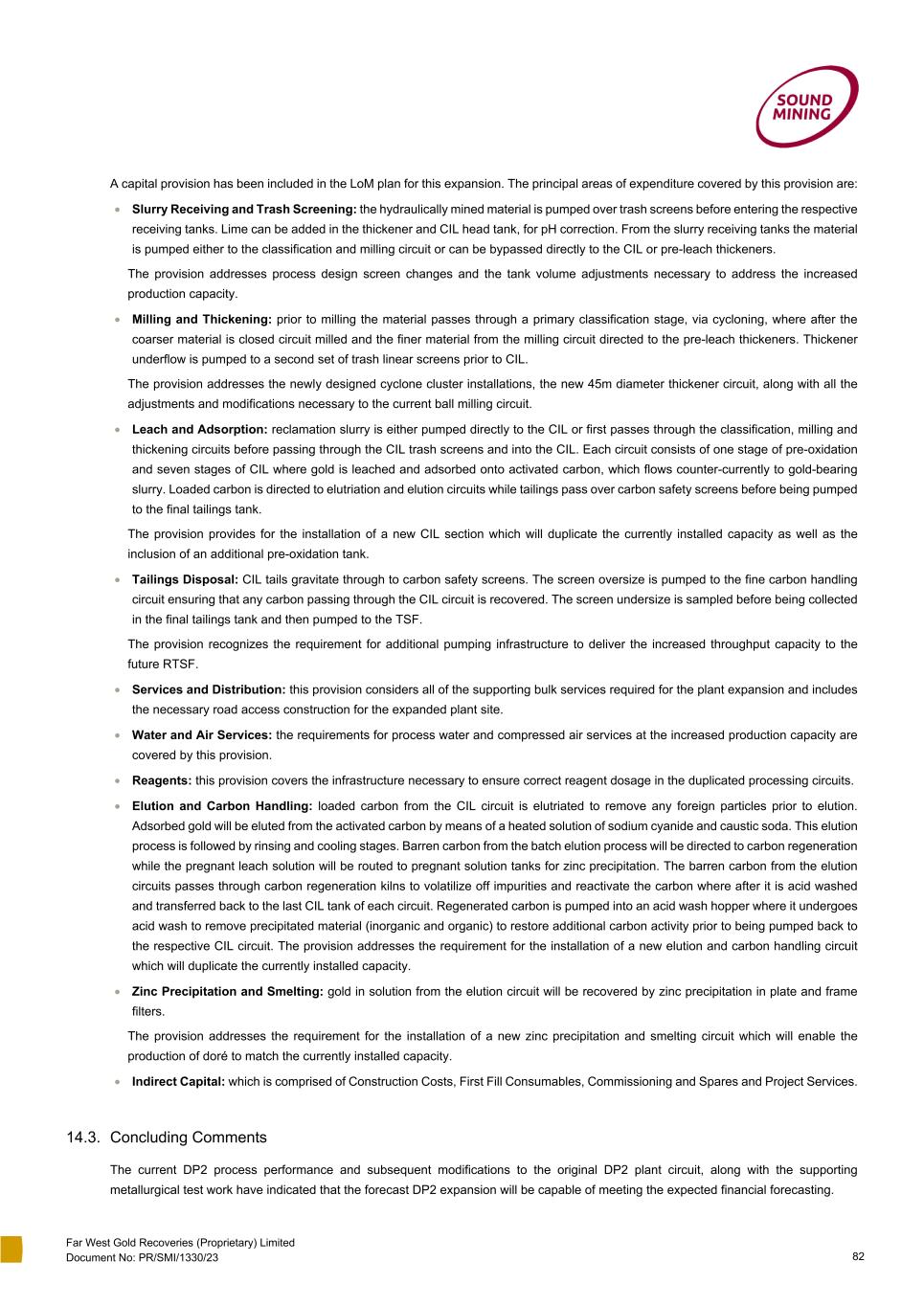 Far West Gold Recoveries (Proprietary) Limited Document No: PR/SMI/1330/23 82 A capital provision has been included in the LoM plan for this expansion. The principal areas of expenditure covered by this provision are: • Slurry Receiving and Trash Screening: the hydraulically mined material is pumped over trash screens before entering the respective receiving tanks. Lime can be added in the thickener and CIL head tank, for pH correction. From the slurry receiving tanks the material is pumped either to the classification and milling circuit or can be bypassed directly to the CIL or pre-leach thickeners. The provision addresses process design screen changes and the tank volume adjustments necessary to address the increased production capacity. • Milling and Thickening: prior to milling the material passes through a primary classification stage, via cycloning, where after the coarser material is closed circuit milled and the finer material from the milling circuit directed to the pre-leach thickeners. Thickener underflow is pumped to a second set of trash linear screens prior to CIL. The provision addresses the newly designed cyclone cluster installations, the new 45m diameter thickener circuit, along with all the adjustments and modifications necessary to the current ball milling circuit. • Leach and Adsorption: reclamation slurry is either pumped directly to the CIL or first passes through the classification, milling and thickening circuits before passing through the CIL trash screens and into the CIL. Each circuit consists of one stage of pre-oxidation and seven stages of CIL where gold is leached and adsorbed onto activated carbon, which flows counter-currently to gold-bearing slurry. Loaded carbon is directed to elutriation and elution circuits while tailings pass over carbon safety screens before being pumped to the final tailings tank. The provision provides for the installation of a new CIL section which will duplicate the currently installed capacity as well as the inclusion of an additional pre-oxidation tank. • Tailings Disposal: CIL tails gravitate through to carbon safety screens. The screen oversize is pumped to the fine carbon handling circuit ensuring that any carbon passing through the CIL circuit is recovered. The screen undersize is sampled before being collected in the final tailings tank and then pumped to the TSF. The provision recognizes the requirement for additional pumping infrastructure to deliver the increased throughput capacity to the future RTSF. • Services and Distribution: this provision considers all of the supporting bulk services required for the plant expansion and includes the necessary road access construction for the expanded plant site. • Water and Air Services: the requirements for process water and compressed air services at the increased production capacity are covered by this provision. • Reagents: this provision covers the infrastructure necessary to ensure correct reagent dosage in the duplicated processing circuits. • Elution and Carbon Handling: loaded carbon from the CIL circuit is elutriated to remove any foreign particles prior to elution. Adsorbed gold will be eluted from the activated carbon by means of a heated solution of sodium cyanide and caustic soda. This elution process is followed by rinsing and cooling stages. Barren carbon from the batch elution process will be directed to carbon regeneration while the pregnant leach solution will be routed to pregnant solution tanks for zinc precipitation. The barren carbon from the elution circuits passes through carbon regeneration kilns to volatilize off impurities and reactivate the carbon where after it is acid washed and transferred back to the last CIL tank of each circuit. Regenerated carbon is pumped into an acid wash hopper where it undergoes acid wash to remove precipitated material (inorganic and organic) to restore additional carbon activity prior to being pumped back to the respective CIL circuit. The provision addresses the requirement for the installation of a new elution and carbon handling circuit which will duplicate the currently installed capacity. • Zinc Precipitation and Smelting: gold in solution from the elution circuit will be recovered by zinc precipitation in plate and frame filters. The provision addresses the requirement for the installation of a new zinc precipitation and smelting circuit which will enable the production of doré to match the currently installed capacity. • Indirect Capital: which is comprised of Construction Costs, First Fill Consumables, Commissioning and Spares and Project Services. 14.3. Concluding Comments The current DP2 process performance and subsequent modifications to the original DP2 plant circuit, along with the supporting metallurgical test work have indicated that the forecast DP2 expansion will be capable of meeting the expected financial forecasting.