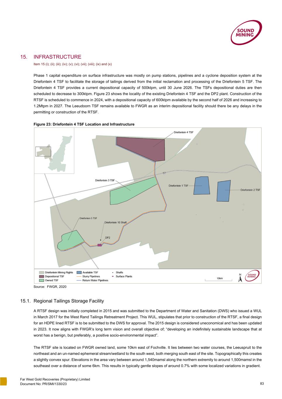 Far West Gold Recoveries (Proprietary) Limited Document No: PR/SMI/1330/23 83 15. INFRASTRUCTURE Item 15 (i); (ii); (iii); (iv); (v); (vi); (vii); (viii); (ix) and (x) Phase 1 capital expenditure on surface infrastructure was mostly on pump stations, pipelines and a cyclone deposition system at the Driefontein 4 TSF to facilitate the storage of tailings derived from the initial reclamation and processing of the Driefontein 5 TSF. The Driefontein 4 TSF provides a current depositional capacity of 500ktpm, until 30 June 2026. The TSFs depositional duties are then scheduled to decrease to 300ktpm. Figure 23 shows the locality of the existing Driefontein 4 TSF and the DP2 plant. Construction of the RTSF is scheduled to commence in 2024, with a depositional capacity of 600ktpm available by the second half of 2026 and increasing to 1.2Mtpm in 2027. The Leeudoorn TSF remains available to FWGR as an interim depositional facility should there be any delays in the permitting or construction of the RTSF. Figure 23: Driefontein 4 TSF Location and Infrastructure Source: FWGR, 2020 15.1. Regional Tailings Storage Facility A RTSF design was initially completed in 2015 and was submitted to the Department of Water and Sanitation (DWS) who issued a WUL in March 2017 for the West Rand Tailings Retreatment Project. This WUL, stipulates that prior to construction of the RTSF, a final design for an HDPE lined RTSF is to be submitted to the DWS for approval. The 2015 design is considered uneconomical and has been updated in 2023. It now aligns with FWGR’s long term vision and overall objective of; “developing an indefinitely sustainable landscape that at worst has a benign, but preferably, a positive socio-environmental impact”. The RTSF site is located on FWGR owned land, some 10km east of Fochville. It lies between two water courses, the Leeuspruit to the northeast and an un-named ephemeral stream/wetland to the south west, both merging south east of the site. Topographically this creates a slightly convex spur. Elevations in the area vary between around 1,540mamsl along the northern extremity to around 1,500mamsl in the southeast over a distance of some 6km. This results in typically gentle slopes of around 0.7% with some localized variations in gradient.