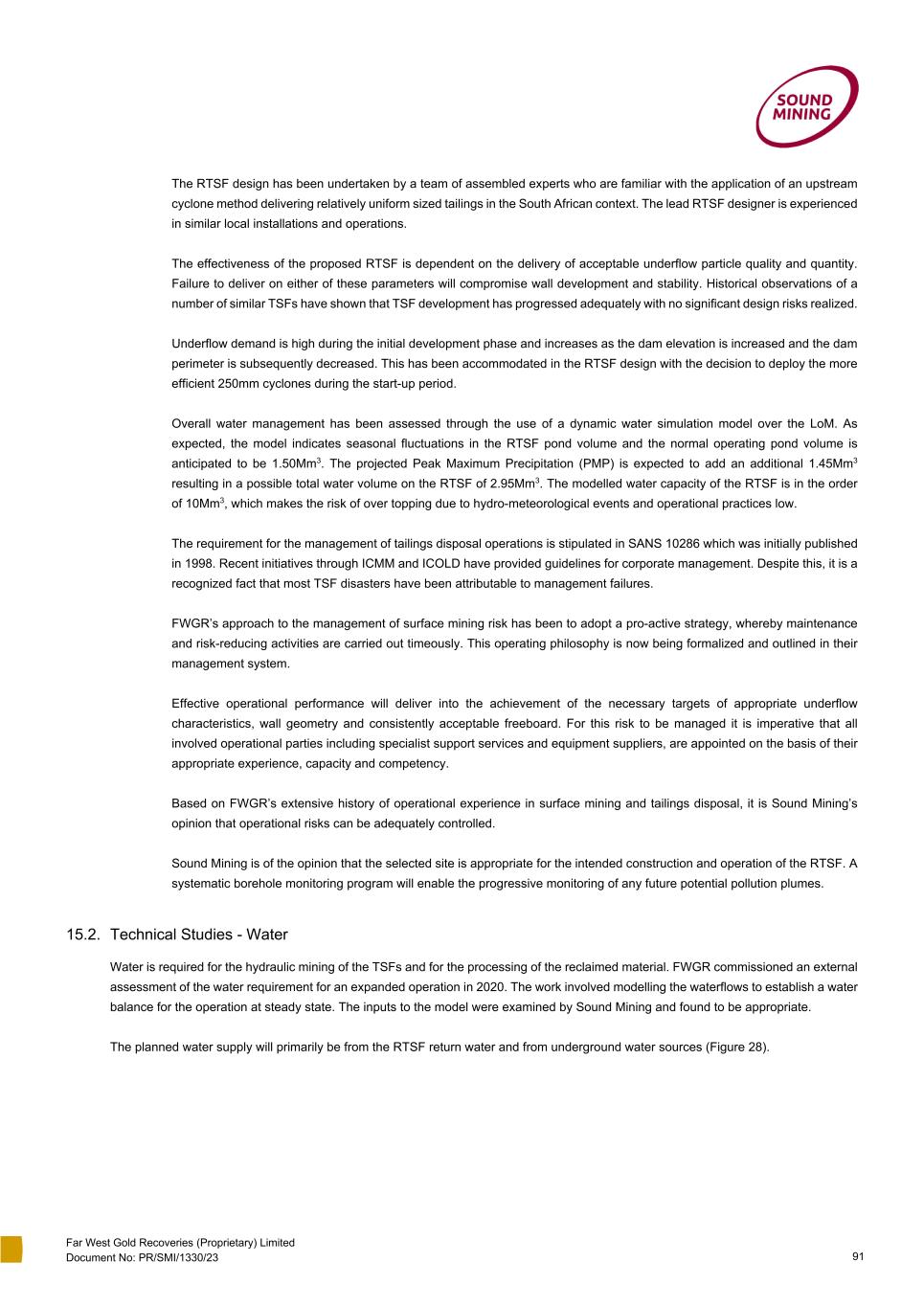 Far West Gold Recoveries (Proprietary) Limited Document No: PR/SMI/1330/23 91 The RTSF design has been undertaken by a team of assembled experts who are familiar with the application of an upstream cyclone method delivering relatively uniform sized tailings in the South African context. The lead RTSF designer is experienced in similar local installations and operations. The effectiveness of the proposed RTSF is dependent on the delivery of acceptable underflow particle quality and quantity. Failure to deliver on either of these parameters will compromise wall development and stability. Historical observations of a number of similar TSFs have shown that TSF development has progressed adequately with no significant design risks realized. Underflow demand is high during the initial development phase and increases as the dam elevation is increased and the dam perimeter is subsequently decreased. This has been accommodated in the RTSF design with the decision to deploy the more efficient 250mm cyclones during the start-up period. Overall water management has been assessed through the use of a dynamic water simulation model over the LoM. As expected, the model indicates seasonal fluctuations in the RTSF pond volume and the normal operating pond volume is anticipated to be 1.50Mm3. The projected Peak Maximum Precipitation (PMP) is expected to add an additional 1.45Mm3 resulting in a possible total water volume on the RTSF of 2.95Mm3. The modelled water capacity of the RTSF is in the order of 10Mm3, which makes the risk of over topping due to hydro-meteorological events and operational practices low. The requirement for the management of tailings disposal operations is stipulated in SANS 10286 which was initially published in 1998. Recent initiatives through ICMM and ICOLD have provided guidelines for corporate management. Despite this, it is a recognized fact that most TSF disasters have been attributable to management failures. FWGR’s approach to the management of surface mining risk has been to adopt a pro-active strategy, whereby maintenance and risk-reducing activities are carried out timeously. This operating philosophy is now being formalized and outlined in their management system. Effective operational performance will deliver into the achievement of the necessary targets of appropriate underflow characteristics, wall geometry and consistently acceptable freeboard. For this risk to be managed it is imperative that all involved operational parties including specialist support services and equipment suppliers, are appointed on the basis of their appropriate experience, capacity and competency. Based on FWGR’s extensive history of operational experience in surface mining and tailings disposal, it is Sound Mining’s opinion that operational risks can be adequately controlled. Sound Mining is of the opinion that the selected site is appropriate for the intended construction and operation of the RTSF. A systematic borehole monitoring program will enable the progressive monitoring of any future potential pollution plumes. 15.2. Technical Studies - Water Water is required for the hydraulic mining of the TSFs and for the processing of the reclaimed material. FWGR commissioned an external assessment of the water requirement for an expanded operation in 2020. The work involved modelling the waterflows to establish a water balance for the operation at steady state. The inputs to the model were examined by Sound Mining and found to be appropriate. The planned water supply will primarily be from the RTSF return water and from underground water sources (Figure 28).