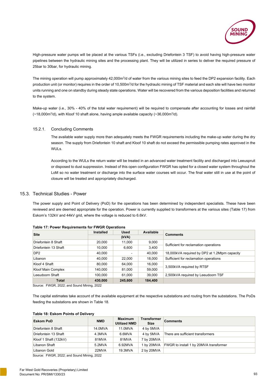 Far West Gold Recoveries (Proprietary) Limited Document No: PR/SMI/1330/23 93 High-pressure water pumps will be placed at the various TSFs (i.e., excluding Driefontein 3 TSF) to avoid having high-pressure water pipelines between the hydraulic mining sites and the processing plant. They will be utilized in series to deliver the required pressure of 25bar to 30bar, for hydraulic mining. The mining operation will pump approximately 42,000m3/d of water from the various mining sites to feed the DP2 expansion facility. Each production unit (or monitor) requires in the order of 10,500m3/d for the hydraulic mining of TSF material and each site will have two monitor units running and one on standby during steady state operations. Water will be recovered from the various deposition facilities and returned to the system. Make-up water (i.e., 30% - 40% of the total water requirement) will be required to compensate after accounting for losses and rainfall (~18,000m3/d), with Kloof 10 shaft alone, having ample available capacity (~36,000m3/d). 15.2.1. Concluding Comments The available water supply more than adequately meets the FWGR requirements including the make-up water during the dry season. The supply from Driefontein 10 shaft and Kloof 10 shaft do not exceed the permissible pumping rates approved in the WULs. According to the WULs the return water will be treated in an advanced water treatment facility and discharged into Leeuspruit or disposed to dust suppression. Instead of this open configuration FWGR has opted for a closed water system throughout the LoM so no water treatment or discharge into the surface water courses will occur. The final water still in use at the point of closure will be treated and appropriately discharged. 15.3. Technical Studies - Power The power supply and Point of Delivery (PoD) for the operations has been determined by independent specialists. These have been reviewed and are deemed appropriate for the operation. Power is currently supplied to transformers at the various sites (Table 17) from Eskom’s 132kV and 44kV grid, where the voltage is reduced to 6.6kV. Table 17: Power Requirements for FWGR Operations Site Installed Used Available Comments (kVA) Driefontein 8 Shaft 20,000 11,000 9,000 Sufficient for reclamation operations Driefontein 13 Shaft 10,000 6,600 3,400 DP2 40,000 - 40,000 18,000kVA required by DP2 at 1.2Mtpm capacity Libanon 40,000 22,000 18,000 Sufficient for reclamation operations Kloof 4 Shaft 80,000 64,000 16,000 3,500kVA required by RTSF Kloof Main Complex 140,000 81,000 59,000 Leeudoorn Shaft 100,000 61,000 39,000 2,500kVA required by Leeudoorn TSF Total 430,000 245,600 184,400 Source: FWGR, 2022; and Sound Mining, 2022 The capital estimates take account of the available equipment at the respective substations and routing from the substations. The PoDs feeding the substations are shown in Table 18. Table 18: Eskom Points of Delivery Eskom PoD NMD Maximum Utilized NMD Transformer Size Comments Driefontein 8 Shaft 14.0MVA 11.0MVA 4 by 5MVA Driefontein 13 Shaft 4.3MVA 6.6MVA 4 by 5MVA There are sufficient transformers Kloof 1 Shaft (132kV) 81MVA 81MVA 7 by 20MVA Libanon Shaft 5.2MVA 6.92MVA 1 by 20MVA FWGR to install 1 by 20MVA transformer Libanon Gold 22MVA 19.3MVA 2 by 20MVA Source: FWGR, 2022; and Sound Mining, 2022