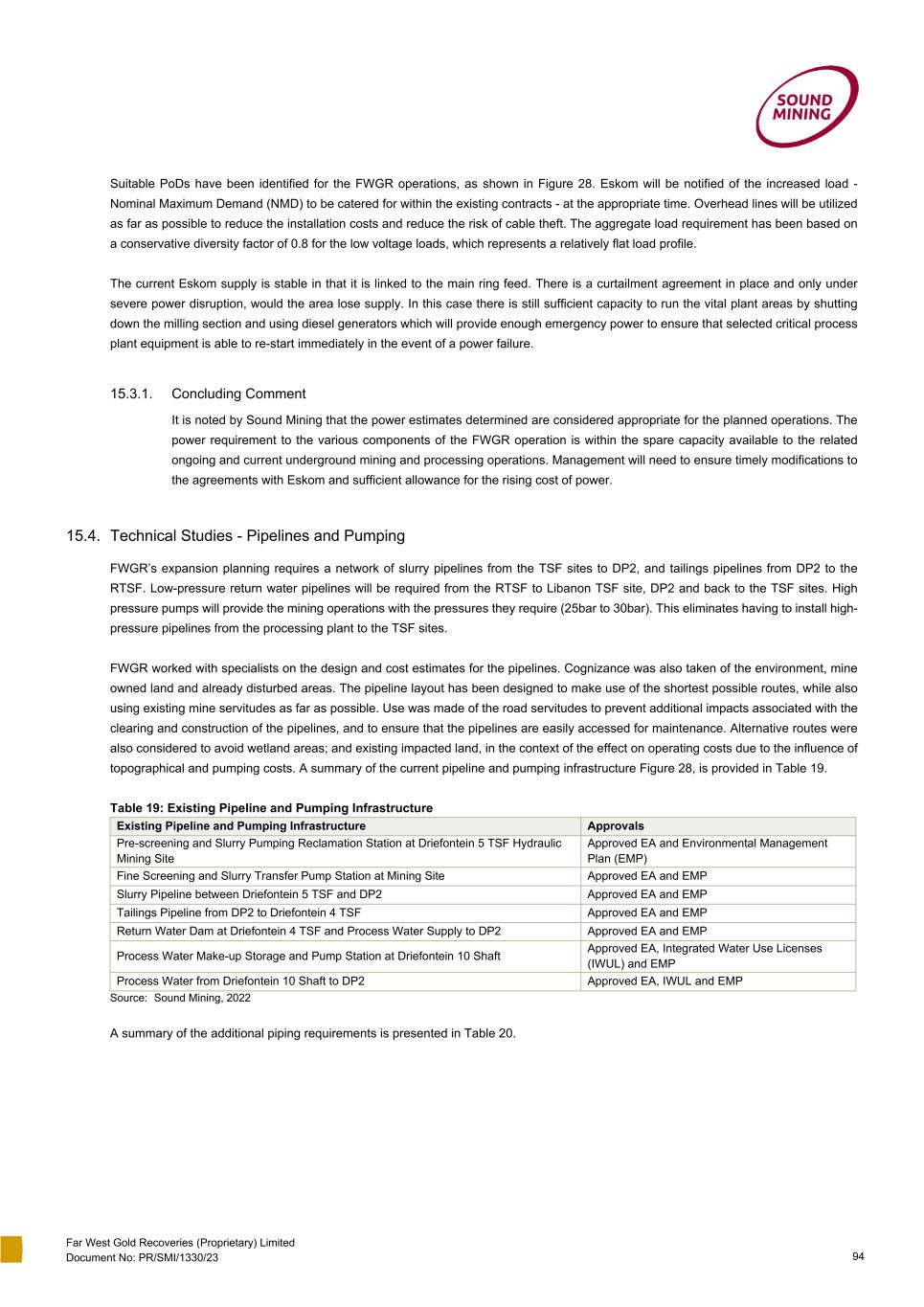 Far West Gold Recoveries (Proprietary) Limited Document No: PR/SMI/1330/23 94 Suitable PoDs have been identified for the FWGR operations, as shown in Figure 28. Eskom will be notified of the increased load - Nominal Maximum Demand (NMD) to be catered for within the existing contracts - at the appropriate time. Overhead lines will be utilized as far as possible to reduce the installation costs and reduce the risk of cable theft. The aggregate load requirement has been based on a conservative diversity factor of 0.8 for the low voltage loads, which represents a relatively flat load profile. The current Eskom supply is stable in that it is linked to the main ring feed. There is a curtailment agreement in place and only under severe power disruption, would the area lose supply. In this case there is still sufficient capacity to run the vital plant areas by shutting down the milling section and using diesel generators which will provide enough emergency power to ensure that selected critical process plant equipment is able to re-start immediately in the event of a power failure. 15.3.1. Concluding Comment It is noted by Sound Mining that the power estimates determined are considered appropriate for the planned operations. The power requirement to the various components of the FWGR operation is within the spare capacity available to the related ongoing and current underground mining and processing operations. Management will need to ensure timely modifications to the agreements with Eskom and sufficient allowance for the rising cost of power. 15.4. Technical Studies - Pipelines and Pumping FWGR’s expansion planning requires a network of slurry pipelines from the TSF sites to DP2, and tailings pipelines from DP2 to the RTSF. Low-pressure return water pipelines will be required from the RTSF to Libanon TSF site, DP2 and back to the TSF sites. High pressure pumps will provide the mining operations with the pressures they require (25bar to 30bar). This eliminates having to install high- pressure pipelines from the processing plant to the TSF sites. FWGR worked with specialists on the design and cost estimates for the pipelines. Cognizance was also taken of the environment, mine owned land and already disturbed areas. The pipeline layout has been designed to make use of the shortest possible routes, while also using existing mine servitudes as far as possible. Use was made of the road servitudes to prevent additional impacts associated with the clearing and construction of the pipelines, and to ensure that the pipelines are easily accessed for maintenance. Alternative routes were also considered to avoid wetland areas; and existing impacted land, in the context of the effect on operating costs due to the influence of topographical and pumping costs. A summary of the current pipeline and pumping infrastructure Figure 28, is provided in Table 19. Table 19: Existing Pipeline and Pumping Infrastructure Existing Pipeline and Pumping Infrastructure Approvals Pre-screening and Slurry Pumping Reclamation Station at Driefontein 5 TSF Hydraulic Mining Site Approved EA and Environmental Management Plan (EMP) Fine Screening and Slurry Transfer Pump Station at Mining Site Approved EA and EMP Slurry Pipeline between Driefontein 5 TSF and DP2 Approved EA and EMP Tailings Pipeline from DP2 to Driefontein 4 TSF Approved EA and EMP Return Water Dam at Driefontein 4 TSF and Process Water Supply to DP2 Approved EA and EMP Process Water Make-up Storage and Pump Station at Driefontein 10 Shaft Approved EA, Integrated Water Use Licenses (IWUL) and EMP Process Water from Driefontein 10 Shaft to DP2 Approved EA, IWUL and EMP Source: Sound Mining, 2022 A summary of the additional piping requirements is presented in Table 20.