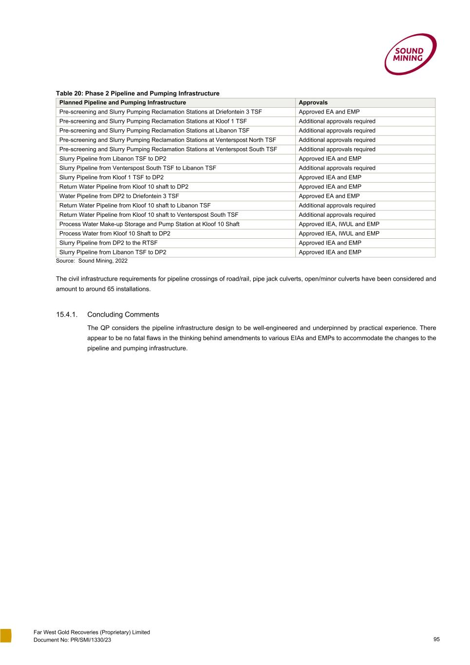 Far West Gold Recoveries (Proprietary) Limited Document No: PR/SMI/1330/23 95 Table 20: Phase 2 Pipeline and Pumping Infrastructure Planned Pipeline and Pumping Infrastructure Approvals Pre-screening and Slurry Pumping Reclamation Stations at Driefontein 3 TSF Approved EA and EMP Pre-screening and Slurry Pumping Reclamation Stations at Kloof 1 TSF Additional approvals required Pre-screening and Slurry Pumping Reclamation Stations at Libanon TSF Additional approvals required Pre-screening and Slurry Pumping Reclamation Stations at Venterspost North TSF Additional approvals required Pre-screening and Slurry Pumping Reclamation Stations at Venterspost South TSF Additional approvals required Slurry Pipeline from Libanon TSF to DP2 Approved IEA and EMP Slurry Pipeline from Venterspost South TSF to Libanon TSF Additional approvals required Slurry Pipeline from Kloof 1 TSF to DP2 Approved IEA and EMP Return Water Pipeline from Kloof 10 shaft to DP2 Approved IEA and EMP Water Pipeline from DP2 to Driefontein 3 TSF Approved EA and EMP Return Water Pipeline from Kloof 10 shaft to Libanon TSF Additional approvals required Return Water Pipeline from Kloof 10 shaft to Venterspost South TSF Additional approvals required Process Water Make-up Storage and Pump Station at Kloof 10 Shaft Approved IEA, IWUL and EMP Process Water from Kloof 10 Shaft to DP2 Approved IEA, IWUL and EMP Slurry Pipeline from DP2 to the RTSF Approved IEA and EMP Slurry Pipeline from Libanon TSF to DP2 Approved IEA and EMP Source: Sound Mining, 2022 The civil infrastructure requirements for pipeline crossings of road/rail, pipe jack culverts, open/minor culverts have been considered and amount to around 65 installations. 15.4.1. Concluding Comments The QP considers the pipeline infrastructure design to be well-engineered and underpinned by practical experience. There appear to be no fatal flaws in the thinking behind amendments to various EIAs and EMPs to accommodate the changes to the pipeline and pumping infrastructure.