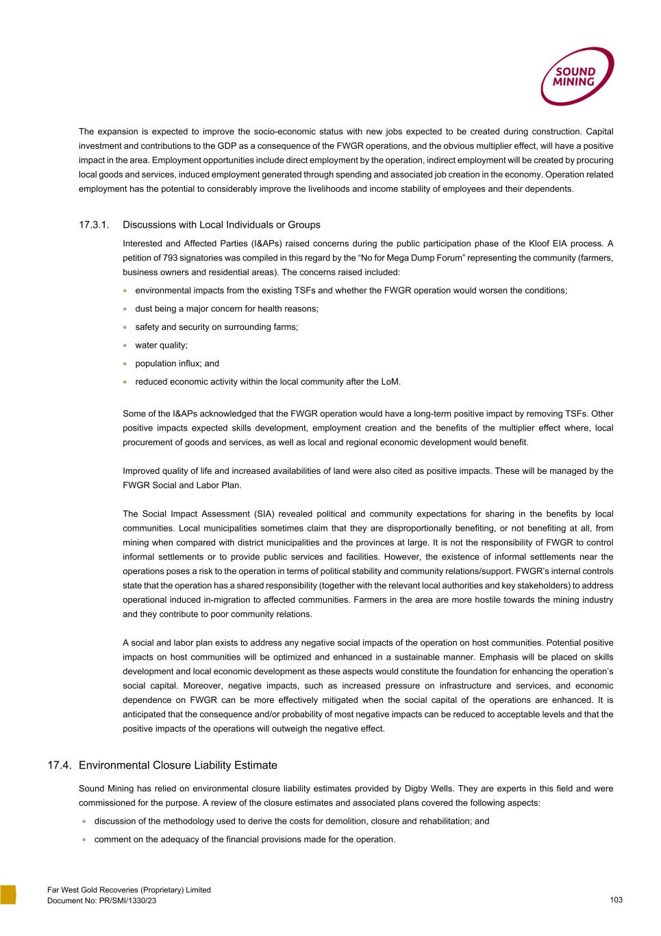 Far West Gold Recoveries (Proprietary) Limited Document No: PR/SMI/1330/23 103 The expansion is expected to improve the socio-economic status with new jobs expected to be created during construction. Capital investment and contributions to the GDP as a consequence of the FWGR operations, and the obvious multiplier effect, will have a positive impact in the area. Employment opportunities include direct employment by the operation, indirect employment will be created by procuring local goods and services, induced employment generated through spending and associated job creation in the economy. Operation related employment has the potential to considerably improve the livelihoods and income stability of employees and their dependents. 17.3.1. Discussions with Local Individuals or Groups Interested and Affected Parties (I&APs) raised concerns during the public participation phase of the Kloof EIA process. A petition of 793 signatories was compiled in this regard by the “No for Mega Dump Forum” representing the community (farmers, business owners and residential areas). The concerns raised included: • environmental impacts from the existing TSFs and whether the FWGR operation would worsen the conditions; • dust being a major concern for health reasons; • safety and security on surrounding farms; • water quality; • population influx; and • reduced economic activity within the local community after the LoM. Some of the I&APs acknowledged that the FWGR operation would have a long-term positive impact by removing TSFs. Other positive impacts expected skills development, employment creation and the benefits of the multiplier effect where, local procurement of goods and services, as well as local and regional economic development would benefit. Improved quality of life and increased availabilities of land were also cited as positive impacts. These will be managed by the FWGR Social and Labor Plan. The Social Impact Assessment (SIA) revealed political and community expectations for sharing in the benefits by local communities. Local municipalities sometimes claim that they are disproportionally benefiting, or not benefiting at all, from mining when compared with district municipalities and the provinces at large. It is not the responsibility of FWGR to control informal settlements or to provide public services and facilities. However, the existence of informal settlements near the operations poses a risk to the operation in terms of political stability and community relations/support. FWGR’s internal controls state that the operation has a shared responsibility (together with the relevant local authorities and key stakeholders) to address operational induced in-migration to affected communities. Farmers in the area are more hostile towards the mining industry and they contribute to poor community relations. A social and labor plan exists to address any negative social impacts of the operation on host communities. Potential positive impacts on host communities will be optimized and enhanced in a sustainable manner. Emphasis will be placed on skills development and local economic development as these aspects would constitute the foundation for enhancing the operation’s social capital. Moreover, negative impacts, such as increased pressure on infrastructure and services, and economic dependence on FWGR can be more effectively mitigated when the social capital of the operations are enhanced. It is anticipated that the consequence and/or probability of most negative impacts can be reduced to acceptable levels and that the positive impacts of the operations will outweigh the negative effect. 17.4. Environmental Closure Liability Estimate Sound Mining has relied on environmental closure liability estimates provided by Digby Wells. They are experts in this field and were commissioned for the purpose. A review of the closure estimates and associated plans covered the following aspects: • discussion of the methodology used to derive the costs for demolition, closure and rehabilitation; and • comment on the adequacy of the financial provisions made for the operation.