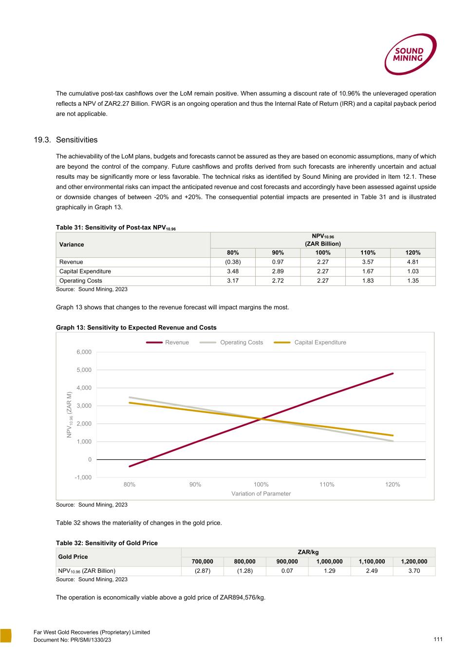 Far West Gold Recoveries (Proprietary) Limited Document No: PR/SMI/1330/23 111 The cumulative post-tax cashflows over the LoM remain positive. When assuming a discount rate of 10.96% the unleveraged operation reflects a NPV of ZAR2.27 Billion. FWGR is an ongoing operation and thus the Internal Rate of Return (IRR) and a capital payback period are not applicable. 19.3. Sensitivities The achievability of the LoM plans, budgets and forecasts cannot be assured as they are based on economic assumptions, many of which are beyond the control of the company. Future cashflows and profits derived from such forecasts are inherently uncertain and actual results may be significantly more or less favorable. The technical risks as identified by Sound Mining are provided in Item 12.1. These and other environmental risks can impact the anticipated revenue and cost forecasts and accordingly have been assessed against upside or downside changes of between -20% and +20%. The consequential potential impacts are presented in Table 31 and is illustrated graphically in Graph 13. Table 31: Sensitivity of Post-tax NPV10.96 Variance NPV10.96 (ZAR Billion) 80% 90% 100% 110% 120% Revenue (0.38) 0.97 2.27 3.57 4.81 Capital Expenditure 3.48 2.89 2.27 1.67 1.03 Operating Costs 3.17 2.72 2.27 1.83 1.35 Source: Sound Mining, 2023 Graph 13 shows that changes to the revenue forecast will impact margins the most. Graph 13: Sensitivity to Expected Revenue and Costs Source: Sound Mining, 2023 Table 32 shows the materiality of changes in the gold price. Table 32: Sensitivity of Gold Price Gold Price ZAR/kg 700,000 800,000 900,000 1,000,000 1,100,000 1,200,000 NPV10.96 (ZAR Billion) (2.87) (1.28) 0.07 1.29 2.49 3.70 Source: Sound Mining, 2023 The operation is economically viable above a gold price of ZAR894,576/kg. -1,000 0 1,000 2,000 3,000 4,000 5,000 6,000 80% 90% 100% 110% 120% N PV 10 .9 6 (Z AR M ) Variation of Parameter Revenue Operating Costs Capital Expenditure