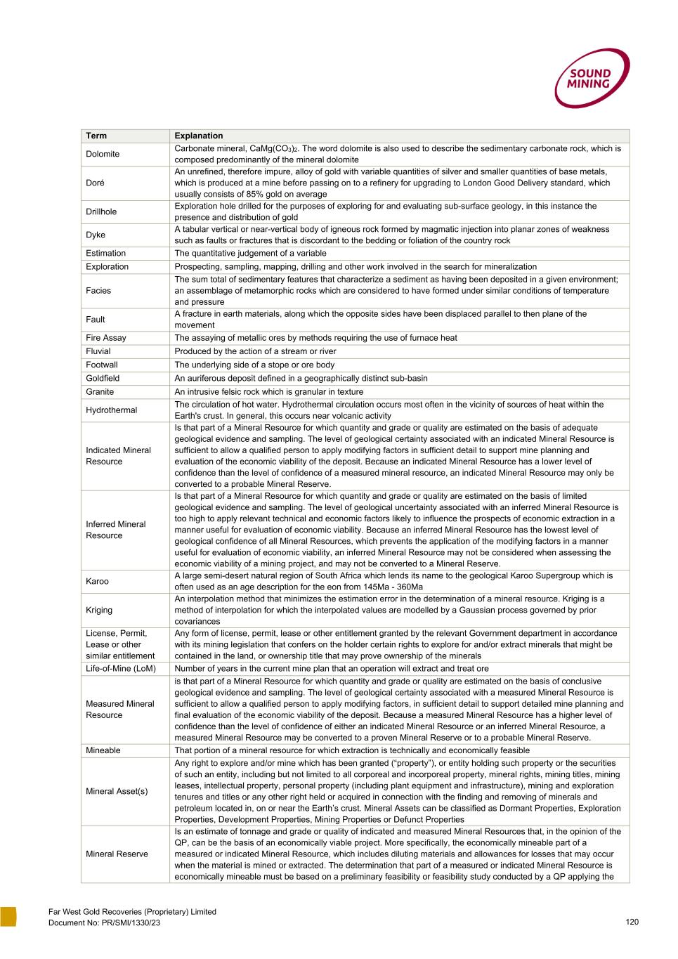 Far West Gold Recoveries (Proprietary) Limited Document No: PR/SMI/1330/23 120 Term Explanation Dolomite Carbonate mineral, CaMg(CO3)2. The word dolomite is also used to describe the sedimentary carbonate rock, which is composed predominantly of the mineral dolomite Doré An unrefined, therefore impure, alloy of gold with variable quantities of silver and smaller quantities of base metals, which is produced at a mine before passing on to a refinery for upgrading to London Good Delivery standard, which usually consists of 85% gold on average Drillhole Exploration hole drilled for the purposes of exploring for and evaluating sub-surface geology, in this instance the presence and distribution of gold Dyke A tabular vertical or near-vertical body of igneous rock formed by magmatic injection into planar zones of weakness such as faults or fractures that is discordant to the bedding or foliation of the country rock Estimation The quantitative judgement of a variable Exploration Prospecting, sampling, mapping, drilling and other work involved in the search for mineralization Facies The sum total of sedimentary features that characterize a sediment as having been deposited in a given environment; an assemblage of metamorphic rocks which are considered to have formed under similar conditions of temperature and pressure Fault A fracture in earth materials, along which the opposite sides have been displaced parallel to then plane of the movement Fire Assay The assaying of metallic ores by methods requiring the use of furnace heat Fluvial Produced by the action of a stream or river Footwall The underlying side of a stope or ore body Goldfield An auriferous deposit defined in a geographically distinct sub-basin Granite An intrusive felsic rock which is granular in texture Hydrothermal The circulation of hot water. Hydrothermal circulation occurs most often in the vicinity of sources of heat within the Earth's crust. In general, this occurs near volcanic activity Indicated Mineral Resource Is that part of a Mineral Resource for which quantity and grade or quality are estimated on the basis of adequate geological evidence and sampling. The level of geological certainty associated with an indicated Mineral Resource is sufficient to allow a qualified person to apply modifying factors in sufficient detail to support mine planning and evaluation of the economic viability of the deposit. Because an indicated Mineral Resource has a lower level of confidence than the level of confidence of a measured mineral resource, an indicated Mineral Resource may only be converted to a probable Mineral Reserve. Inferred Mineral Resource Is that part of a Mineral Resource for which quantity and grade or quality are estimated on the basis of limited geological evidence and sampling. The level of geological uncertainty associated with an inferred Mineral Resource is too high to apply relevant technical and economic factors likely to influence the prospects of economic extraction in a manner useful for evaluation of economic viability. Because an inferred Mineral Resource has the lowest level of geological confidence of all Mineral Resources, which prevents the application of the modifying factors in a manner useful for evaluation of economic viability, an inferred Mineral Resource may not be considered when assessing the economic viability of a mining project, and may not be converted to a Mineral Reserve. Karoo A large semi-desert natural region of South Africa which lends its name to the geological Karoo Supergroup which is often used as an age description for the eon from 145Ma - 360Ma Kriging An interpolation method that minimizes the estimation error in the determination of a mineral resource. Kriging is a method of interpolation for which the interpolated values are modelled by a Gaussian process governed by prior covariances License, Permit, Lease or other similar entitlement Any form of license, permit, lease or other entitlement granted by the relevant Government department in accordance with its mining legislation that confers on the holder certain rights to explore for and/or extract minerals that might be contained in the land, or ownership title that may prove ownership of the minerals Life-of-Mine (LoM) Number of years in the current mine plan that an operation will extract and treat ore Measured Mineral Resource is that part of a Mineral Resource for which quantity and grade or quality are estimated on the basis of conclusive geological evidence and sampling. The level of geological certainty associated with a measured Mineral Resource is sufficient to allow a qualified person to apply modifying factors, in sufficient detail to support detailed mine planning and final evaluation of the economic viability of the deposit. Because a measured Mineral Resource has a higher level of confidence than the level of confidence of either an indicated Mineral Resource or an inferred Mineral Resource, a measured Mineral Resource may be converted to a proven Mineral Reserve or to a probable Mineral Reserve. Mineable That portion of a mineral resource for which extraction is technically and economically feasible Mineral Asset(s) Any right to explore and/or mine which has been granted (“property”), or entity holding such property or the securities of such an entity, including but not limited to all corporeal and incorporeal property, mineral rights, mining titles, mining leases, intellectual property, personal property (including plant equipment and infrastructure), mining and exploration tenures and titles or any other right held or acquired in connection with the finding and removing of minerals and petroleum located in, on or near the Earth’s crust. Mineral Assets can be classified as Dormant Properties, Exploration Properties, Development Properties, Mining Properties or Defunct Properties Mineral Reserve Is an estimate of tonnage and grade or quality of indicated and measured Mineral Resources that, in the opinion 