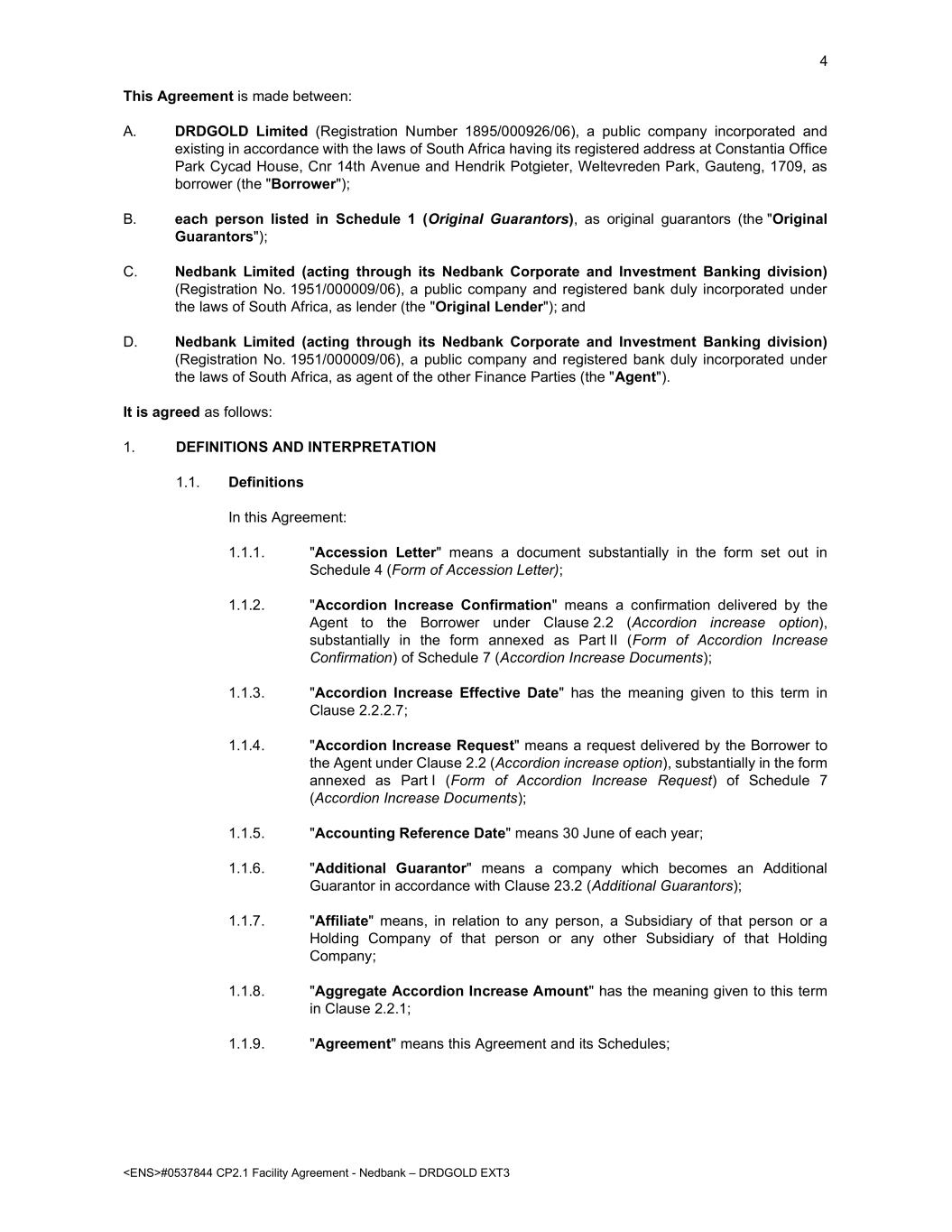 4 <ENS>#0537844 CP2.1 Facility Agreement - Nedbank – DRDGOLD EXT3 This Agreement is made between: A. DRDGOLD Limited (Registration Number 1895/000926/06), a public company incorporated and existing in accordance with the laws of South Africa having its registered address at Constantia Office Park Cycad House, Cnr 14th Avenue and Hendrik Potgieter, Weltevreden Park, Gauteng, 1709, as borrower (the "Borrower"); B. each person listed in Schedule 1 (Original Guarantors), as original guarantors (the "Original Guarantors"); C. Nedbank Limited (acting through its Nedbank Corporate and Investment Banking division) (Registration No. 1951/000009/06), a public company and registered bank duly incorporated under the laws of South Africa, as lender (the "Original Lender"); and D. Nedbank Limited (acting through its Nedbank Corporate and Investment Banking division) (Registration No. 1951/000009/06), a public company and registered bank duly incorporated under the laws of South Africa, as agent of the other Finance Parties (the "Agent"). It is agreed as follows: 1. DEFINITIONS AND INTERPRETATION 1.1. Definitions In this Agreement: 1.1.1. "Accession Letter" means a document substantially in the form set out in Schedule 4 (Form of Accession Letter); 1.1.2. "Accordion Increase Confirmation" means a confirmation delivered by the Agent to the Borrower under Clause 2.2 (Accordion increase option), substantially in the form annexed as Part II (Form of Accordion Increase Confirmation) of Schedule 7 (Accordion Increase Documents); 1.1.3. "Accordion Increase Effective Date" has the meaning given to this term in Clause 2.2.2.7; 1.1.4. "Accordion Increase Request" means a request delivered by the Borrower to the Agent under Clause 2.2 (Accordion increase option), substantially in the form annexed as Part I (Form of Accordion Increase Request) of Schedule 7 (Accordion Increase Documents); 1.1.5. "Accounting Reference Date" means 30 June of each year; 1.1.6. "Additional Guarantor" means a company which becomes an Additional Guarantor in accordance with Clause 23.2 (Additional Guarantors); 1.1.7. "Affiliate" means, in relation to any person, a Subsidiary of that person or a Holding Company of that person or any other Subsidiary of that Holding Company; 1.1.8. "Aggregate Accordion Increase Amount" has the meaning given to this term in Clause 2.2.1; 1.1.9. "Agreement" means this Agreement and its Schedules;