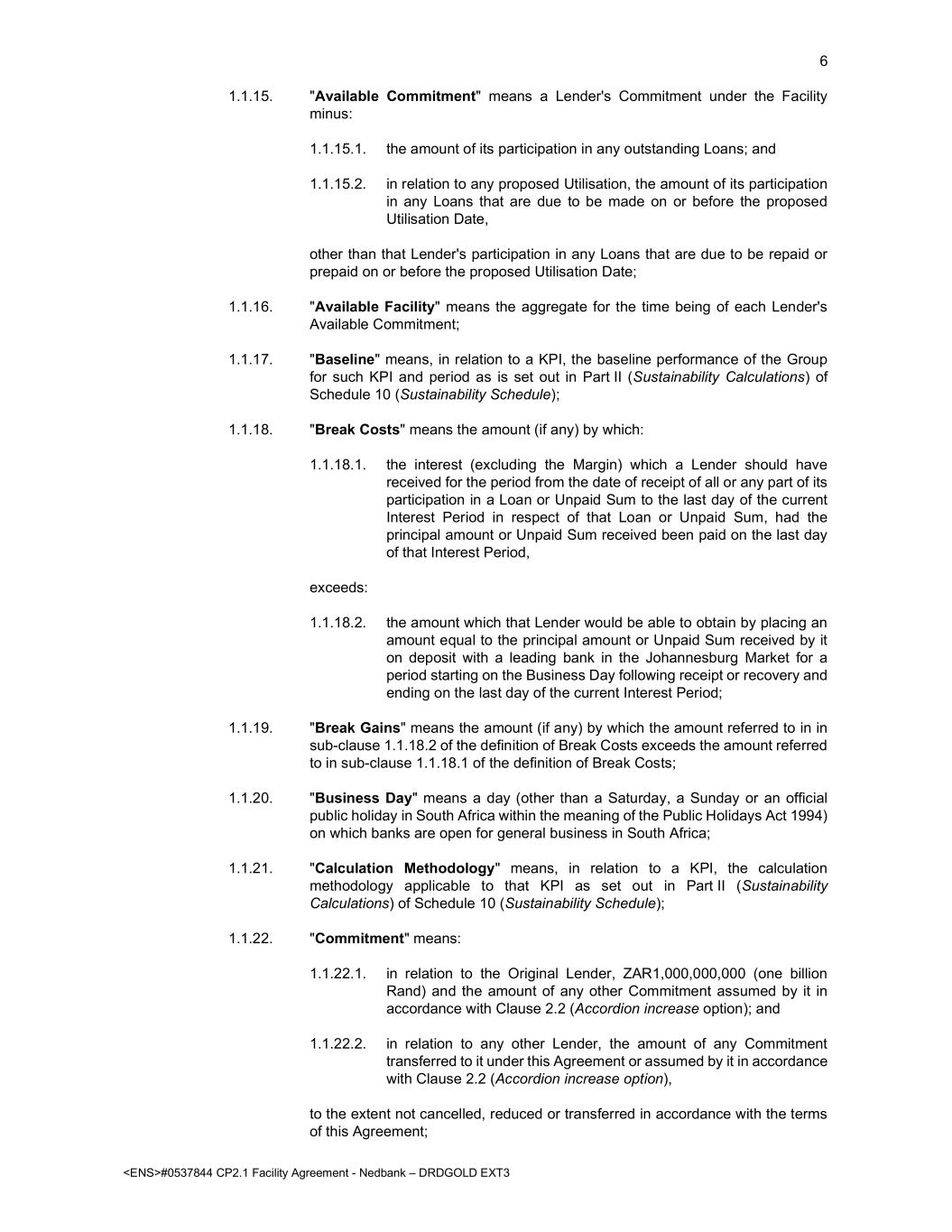 6 <ENS>#0537844 CP2.1 Facility Agreement - Nedbank – DRDGOLD EXT3 1.1.15. "Available Commitment" means a Lender's Commitment under the Facility minus: 1.1.15.1. the amount of its participation in any outstanding Loans; and 1.1.15.2. in relation to any proposed Utilisation, the amount of its participation in any Loans that are due to be made on or before the proposed Utilisation Date, other than that Lender's participation in any Loans that are due to be repaid or prepaid on or before the proposed Utilisation Date; 1.1.16. "Available Facility" means the aggregate for the time being of each Lender's Available Commitment; 1.1.17. "Baseline" means, in relation to a KPI, the baseline performance of the Group for such KPI and period as is set out in Part II (Sustainability Calculations) of Schedule 10 (Sustainability Schedule); 1.1.18. "Break Costs" means the amount (if any) by which: 1.1.18.1. the interest (excluding the Margin) which a Lender should have received for the period from the date of receipt of all or any part of its participation in a Loan or Unpaid Sum to the last day of the current Interest Period in respect of that Loan or Unpaid Sum, had the principal amount or Unpaid Sum received been paid on the last day of that Interest Period, exceeds: 1.1.18.2. the amount which that Lender would be able to obtain by placing an amount equal to the principal amount or Unpaid Sum received by it on deposit with a leading bank in the Johannesburg Market for a period starting on the Business Day following receipt or recovery and ending on the last day of the current Interest Period; 1.1.19. "Break Gains" means the amount (if any) by which the amount referred to in in sub-clause 1.1.18.2 of the definition of Break Costs exceeds the amount referred to in sub-clause 1.1.18.1 of the definition of Break Costs; 1.1.20. "Business Day" means a day (other than a Saturday, a Sunday or an official public holiday in South Africa within the meaning of the Public Holidays Act 1994) on which banks are open for general business in South Africa; 1.1.21. "Calculation Methodology" means, in relation to a KPI, the calculation methodology applicable to that KPI as set out in Part II (Sustainability Calculations) of Schedule 10 (Sustainability Schedule); 1.1.22. "Commitment" means: 1.1.22.1. in relation to the Original Lender, ZAR1,000,000,000 (one billion Rand) and the amount of any other Commitment assumed by it in accordance with Clause 2.2 (Accordion increase option); and 1.1.22.2. in relation to any other Lender, the amount of any Commitment transferred to it under this Agreement or assumed by it in accordance with Clause 2.2 (Accordion increase option), to the extent not cancelled, reduced or transferred in accordance with the terms of this Agreement;