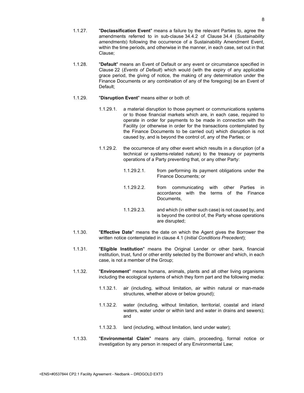 8 <ENS>#0537844 CP2.1 Facility Agreement - Nedbank – DRDGOLD EXT3 1.1.27. "Declassification Event" means a failure by the relevant Parties to, agree the amendments referred to in sub-clause 34.4.2 of Clause 34.4 (Sustainability amendments) following the occurrence of a Sustainability Amendment Event, within the time periods, and otherwise in the manner, in each case, set out in that Clause; 1.1.28. "Default" means an Event of Default or any event or circumstance specified in Clause 22 (Events of Default) which would (with the expiry of any applicable grace period, the giving of notice, the making of any determination under the Finance Documents or any combination of any of the foregoing) be an Event of Default; 1.1.29. "Disruption Event" means either or both of: 1.1.29.1. a material disruption to those payment or communications systems or to those financial markets which are, in each case, required to operate in order for payments to be made in connection with the Facility (or otherwise in order for the transactions contemplated by the Finance Documents to be carried out) which disruption is not caused by, and is beyond the control of, any of the Parties; or 1.1.29.2. the occurrence of any other event which results in a disruption (of a technical or systems-related nature) to the treasury or payments operations of a Party preventing that, or any other Party: 1.1.29.2.1. from performing its payment obligations under the Finance Documents; or 1.1.29.2.2. from communicating with other Parties in accordance with the terms of the Finance Documents, 1.1.29.2.3. and which (in either such case) is not caused by, and is beyond the control of, the Party whose operations are disrupted; 1.1.30. "Effective Date" means the date on which the Agent gives the Borrower the written notice contemplated in clause 4.1 (Initial Conditions Precedent); 1.1.31. "Eligible Institution" means the Original Lender or other bank, financial institution, trust, fund or other entity selected by the Borrower and which, in each case, is not a member of the Group; 1.1.32. "Environment" means humans, animals, plants and all other living organisms including the ecological systems of which they form part and the following media: 1.1.32.1. air (including, without limitation, air within natural or man-made structures, whether above or below ground); 1.1.32.2. water (including, without limitation, territorial, coastal and inland waters, water under or within land and water in drains and sewers); and 1.1.32.3. land (including, without limitation, land under water); 1.1.33. "Environmental Claim" means any claim, proceeding, formal notice or investigation by any person in respect of any Environmental Law;