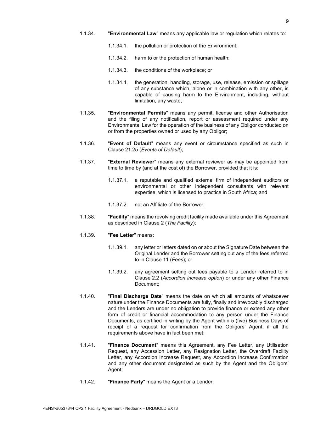 9 <ENS>#0537844 CP2.1 Facility Agreement - Nedbank – DRDGOLD EXT3 1.1.34. "Environmental Law" means any applicable law or regulation which relates to: 1.1.34.1. the pollution or protection of the Environment; 1.1.34.2. harm to or the protection of human health; 1.1.34.3. the conditions of the workplace; or 1.1.34.4. the generation, handling, storage, use, release, emission or spillage of any substance which, alone or in combination with any other, is capable of causing harm to the Environment, including, without limitation, any waste; 1.1.35. "Environmental Permits" means any permit, license and other Authorisation and the filing of any notification, report or assessment required under any Environmental Law for the operation of the business of any Obligor conducted on or from the properties owned or used by any Obligor; 1.1.36. "Event of Default" means any event or circumstance specified as such in Clause 21.25 (Events of Default); 1.1.37. "External Reviewer" means any external reviewer as may be appointed from time to time by (and at the cost of) the Borrower, provided that it is: 1.1.37.1. a reputable and qualified external firm of independent auditors or environmental or other independent consultants with relevant expertise, which is licensed to practice in South Africa; and 1.1.37.2. not an Affiliate of the Borrower; 1.1.38. "Facility" means the revolving credit facility made available under this Agreement as described in Clause 2 (The Facility); 1.1.39. "Fee Letter" means: 1.1.39.1. any letter or letters dated on or about the Signature Date between the Original Lender and the Borrower setting out any of the fees referred to in Clause 11 (Fees); or 1.1.39.2. any agreement setting out fees payable to a Lender referred to in Clause 2.2 (Accordion increase option) or under any other Finance Document; 1.1.40. "Final Discharge Date" means the date on which all amounts of whatsoever nature under the Finance Documents are fully, finally and irrevocably discharged and the Lenders are under no obligation to provide finance or extend any other form of credit or financial accommodation to any person under the Finance Documents, as certified in writing by the Agent within 5 (five) Business Days of receipt of a request for confirmation from the Obligors’ Agent, if all the requirements above have in fact been met; 1.1.41. "Finance Document" means this Agreement, any Fee Letter, any Utilisation Request, any Accession Letter, any Resignation Letter, the Overdraft Facility Letter, any Accordion Increase Request, any Accordion Increase Confirmation and any other document designated as such by the Agent and the Obligors' Agent; 1.1.42. "Finance Party" means the Agent or a Lender;