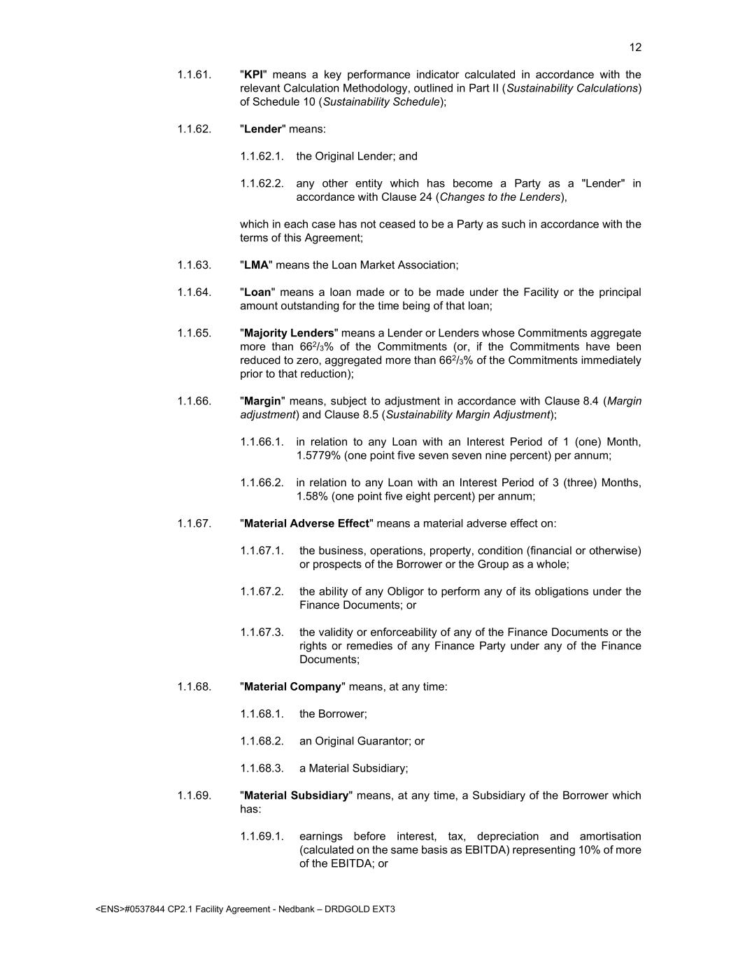 12 <ENS>#0537844 CP2.1 Facility Agreement - Nedbank – DRDGOLD EXT3 1.1.61. "KPI" means a key performance indicator calculated in accordance with the relevant Calculation Methodology, outlined in Part II (Sustainability Calculations) of Schedule 10 (Sustainability Schedule); 1.1.62. "Lender" means: 1.1.62.1. the Original Lender; and 1.1.62.2. any other entity which has become a Party as a "Lender" in accordance with Clause 24 (Changes to the Lenders), which in each case has not ceased to be a Party as such in accordance with the terms of this Agreement; 1.1.63. "LMA" means the Loan Market Association; 1.1.64. "Loan" means a loan made or to be made under the Facility or the principal amount outstanding for the time being of that loan; 1.1.65. "Majority Lenders" means a Lender or Lenders whose Commitments aggregate more than 662/3% of the Commitments (or, if the Commitments have been reduced to zero, aggregated more than 662/3% of the Commitments immediately prior to that reduction); 1.1.66. "Margin" means, subject to adjustment in accordance with Clause 8.4 (Margin adjustment) and Clause 8.5 (Sustainability Margin Adjustment); 1.1.66.1. in relation to any Loan with an Interest Period of 1 (one) Month, 1.5779% (one point five seven seven nine percent) per annum; 1.1.66.2. in relation to any Loan with an Interest Period of 3 (three) Months, 1.58% (one point five eight percent) per annum; 1.1.67. "Material Adverse Effect" means a material adverse effect on: 1.1.67.1. the business, operations, property, condition (financial or otherwise) or prospects of the Borrower or the Group as a whole; 1.1.67.2. the ability of any Obligor to perform any of its obligations under the Finance Documents; or 1.1.67.3. the validity or enforceability of any of the Finance Documents or the rights or remedies of any Finance Party under any of the Finance Documents; 1.1.68. "Material Company" means, at any time: 1.1.68.1. the Borrower; 1.1.68.2. an Original Guarantor; or 1.1.68.3. a Material Subsidiary; 1.1.69. "Material Subsidiary" means, at any time, a Subsidiary of the Borrower which has: 1.1.69.1. earnings before interest, tax, depreciation and amortisation (calculated on the same basis as EBITDA) representing 10% of more of the EBITDA; or