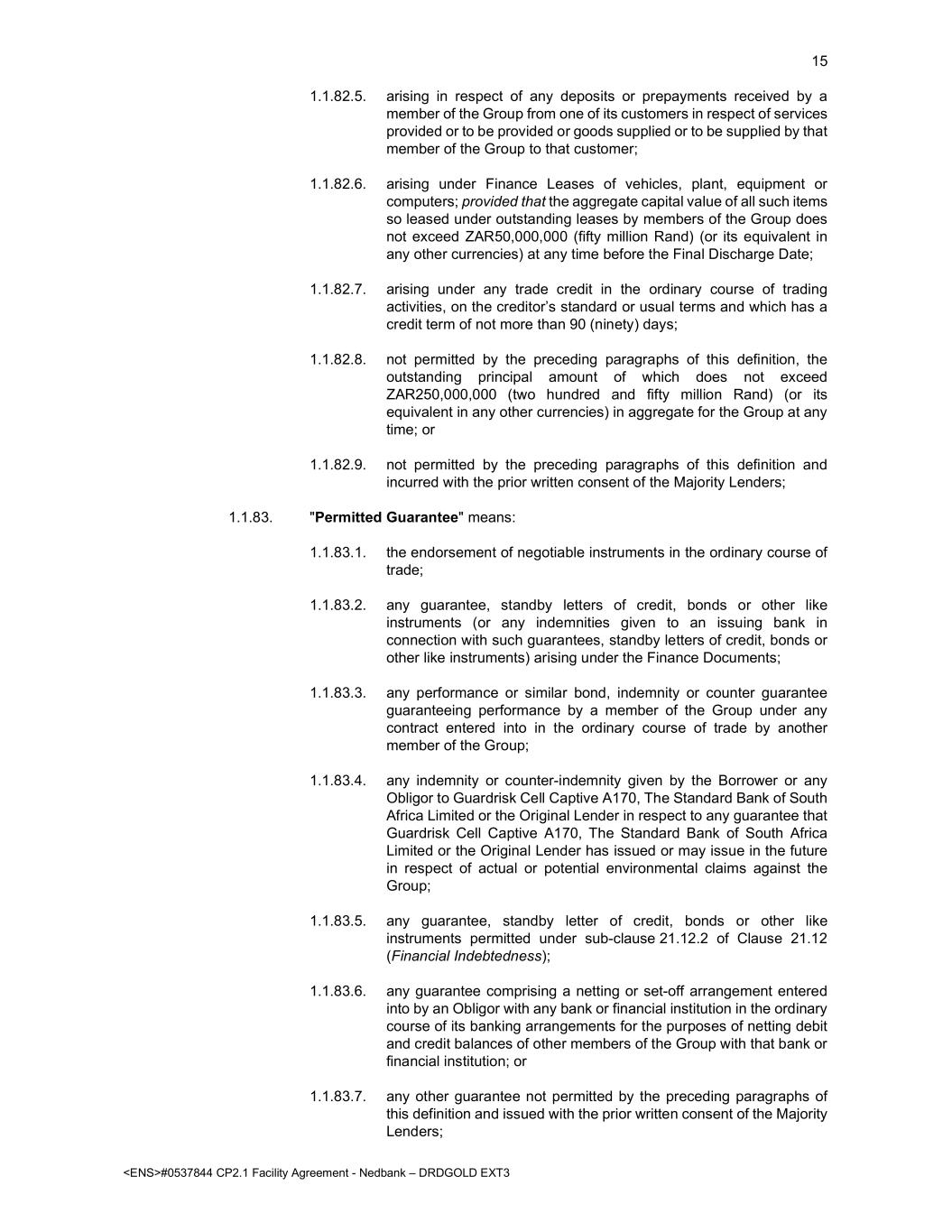 15 <ENS>#0537844 CP2.1 Facility Agreement - Nedbank – DRDGOLD EXT3 1.1.82.5. arising in respect of any deposits or prepayments received by a member of the Group from one of its customers in respect of services provided or to be provided or goods supplied or to be supplied by that member of the Group to that customer; 1.1.82.6. arising under Finance Leases of vehicles, plant, equipment or computers; provided that the aggregate capital value of all such items so leased under outstanding leases by members of the Group does not exceed ZAR50,000,000 (fifty million Rand) (or its equivalent in any other currencies) at any time before the Final Discharge Date; 1.1.82.7. arising under any trade credit in the ordinary course of trading activities, on the creditor’s standard or usual terms and which has a credit term of not more than 90 (ninety) days; 1.1.82.8. not permitted by the preceding paragraphs of this definition, the outstanding principal amount of which does not exceed ZAR250,000,000 (two hundred and fifty million Rand) (or its equivalent in any other currencies) in aggregate for the Group at any time; or 1.1.82.9. not permitted by the preceding paragraphs of this definition and incurred with the prior written consent of the Majority Lenders; 1.1.83. "Permitted Guarantee" means: 1.1.83.1. the endorsement of negotiable instruments in the ordinary course of trade; 1.1.83.2. any guarantee, standby letters of credit, bonds or other like instruments (or any indemnities given to an issuing bank in connection with such guarantees, standby letters of credit, bonds or other like instruments) arising under the Finance Documents; 1.1.83.3. any performance or similar bond, indemnity or counter guarantee guaranteeing performance by a member of the Group under any contract entered into in the ordinary course of trade by another member of the Group; 1.1.83.4. any indemnity or counter-indemnity given by the Borrower or any Obligor to Guardrisk Cell Captive A170, The Standard Bank of South Africa Limited or the Original Lender in respect to any guarantee that Guardrisk Cell Captive A170, The Standard Bank of South Africa Limited or the Original Lender has issued or may issue in the future in respect of actual or potential environmental claims against the Group; 1.1.83.5. any guarantee, standby letter of credit, bonds or other like instruments permitted under sub-clause 21.12.2 of Clause 21.12 (Financial Indebtedness); 1.1.83.6. any guarantee comprising a netting or set-off arrangement entered into by an Obligor with any bank or financial institution in the ordinary course of its banking arrangements for the purposes of netting debit and credit balances of other members of the Group with that bank or financial institution; or 1.1.83.7. any other guarantee not permitted by the preceding paragraphs of this definition and issued with the prior written consent of the Majority Lenders;