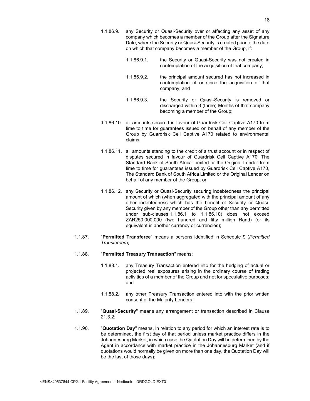 18 <ENS>#0537844 CP2.1 Facility Agreement - Nedbank – DRDGOLD EXT3 1.1.86.9. any Security or Quasi-Security over or affecting any asset of any company which becomes a member of the Group after the Signature Date, where the Security or Quasi-Security is created prior to the date on which that company becomes a member of the Group, if: 1.1.86.9.1. the Security or Quasi-Security was not created in contemplation of the acquisition of that company; 1.1.86.9.2. the principal amount secured has not increased in contemplation of or since the acquisition of that company; and 1.1.86.9.3. the Security or Quasi-Security is removed or discharged within 3 (three) Months of that company becoming a member of the Group; 1.1.86.10. all amounts secured in favour of Guardrisk Cell Captive A170 from time to time for guarantees issued on behalf of any member of the Group by Guardrisk Cell Captive A170 related to environmental claims; 1.1.86.11. all amounts standing to the credit of a trust account or in respect of disputes secured in favour of Guardrisk Cell Captive A170, The Standard Bank of South Africa Limited or the Original Lender from time to time for guarantees issued by Guardrisk Cell Captive A170, The Standard Bank of South Africa Limited or the Original Lender on behalf of any member of the Group; or 1.1.86.12. any Security or Quasi-Security securing indebtedness the principal amount of which (when aggregated with the principal amount of any other indebtedness which has the benefit of Security or Quasi- Security given by any member of the Group other than any permitted under sub-clauses 1.1.86.1 to 1.1.86.10) does not exceed ZAR250,000,000 (two hundred and fifty million Rand) (or its equivalent in another currency or currencies); 1.1.87. "Permitted Transferee" means a persons identified in Schedule 9 (Permitted Transferees); 1.1.88. "Permitted Treasury Transaction" means: 1.1.88.1. any Treasury Transaction entered into for the hedging of actual or projected real exposures arising in the ordinary course of trading activities of a member of the Group and not for speculative purposes; and 1.1.88.2. any other Treasury Transaction entered into with the prior written consent of the Majority Lenders; 1.1.89. "Quasi-Security" means any arrangement or transaction described in Clause 21.3.2; 1.1.90. "Quotation Day" means, in relation to any period for which an interest rate is to be determined, the first day of that period unless market practice differs in the Johannesburg Market, in which case the Quotation Day will be determined by the Agent in accordance with market practice in the Johannesburg Market (and if quotations would normally be given on more than one day, the Quotation Day will be the last of those days);