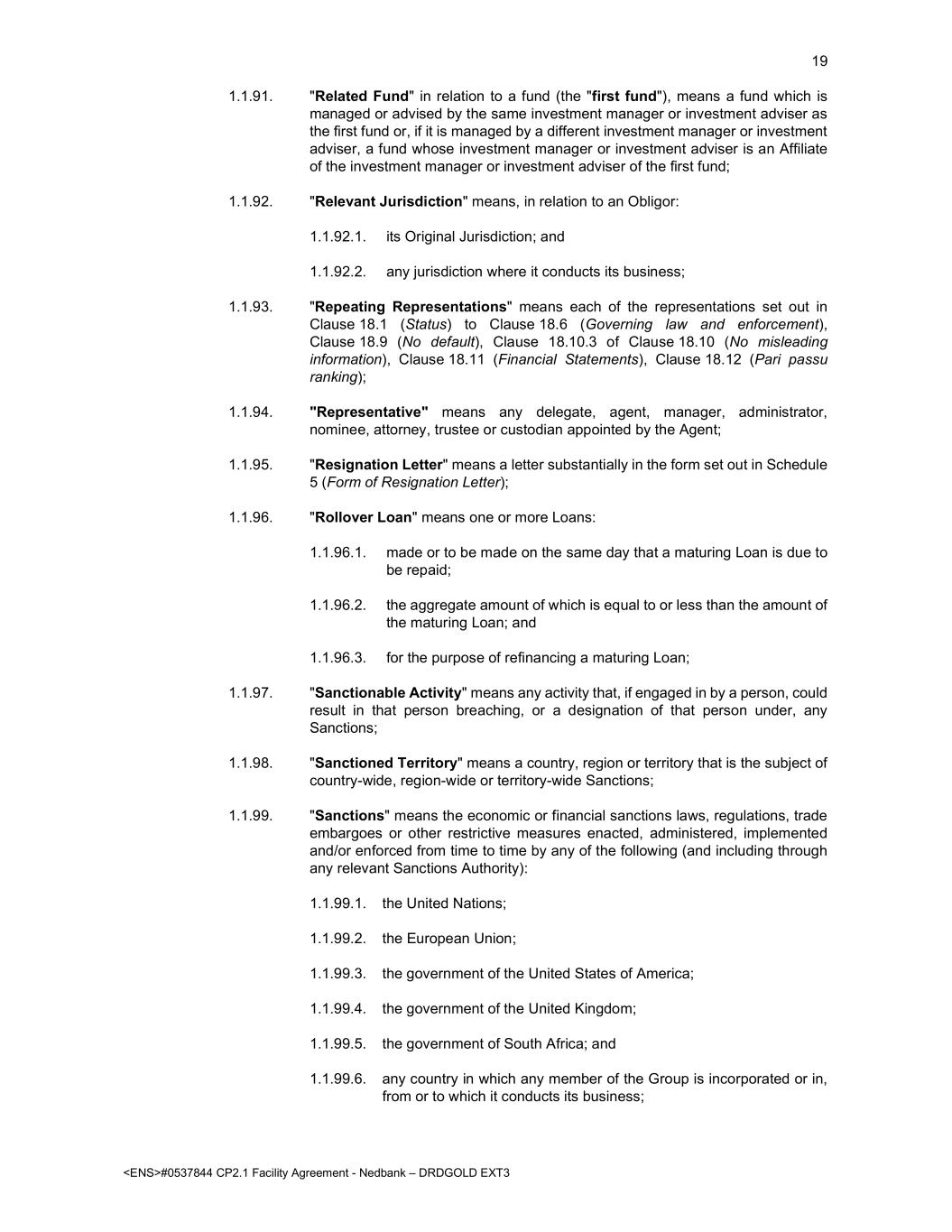 19 <ENS>#0537844 CP2.1 Facility Agreement - Nedbank – DRDGOLD EXT3 1.1.91. "Related Fund" in relation to a fund (the "first fund"), means a fund which is managed or advised by the same investment manager or investment adviser as the first fund or, if it is managed by a different investment manager or investment adviser, a fund whose investment manager or investment adviser is an Affiliate of the investment manager or investment adviser of the first fund; 1.1.92. "Relevant Jurisdiction" means, in relation to an Obligor: 1.1.92.1. its Original Jurisdiction; and 1.1.92.2. any jurisdiction where it conducts its business; 1.1.93. "Repeating Representations" means each of the representations set out in Clause 18.1 (Status) to Clause 18.6 (Governing law and enforcement), Clause 18.9 (No default), Clause 18.10.3 of Clause 18.10 (No misleading information), Clause 18.11 (Financial Statements), Clause 18.12 (Pari passu ranking); 1.1.94. "Representative" means any delegate, agent, manager, administrator, nominee, attorney, trustee or custodian appointed by the Agent; 1.1.95. "Resignation Letter" means a letter substantially in the form set out in Schedule 5 (Form of Resignation Letter); 1.1.96. "Rollover Loan" means one or more Loans: 1.1.96.1. made or to be made on the same day that a maturing Loan is due to be repaid; 1.1.96.2. the aggregate amount of which is equal to or less than the amount of the maturing Loan; and 1.1.96.3. for the purpose of refinancing a maturing Loan; 1.1.97. "Sanctionable Activity" means any activity that, if engaged in by a person, could result in that person breaching, or a designation of that person under, any Sanctions; 1.1.98. "Sanctioned Territory" means a country, region or territory that is the subject of country-wide, region-wide or territory-wide Sanctions; 1.1.99. "Sanctions" means the economic or financial sanctions laws, regulations, trade embargoes or other restrictive measures enacted, administered, implemented and/or enforced from time to time by any of the following (and including through any relevant Sanctions Authority): 1.1.99.1. the United Nations; 1.1.99.2. the European Union; 1.1.99.3. the government of the United States of America; 1.1.99.4. the government of the United Kingdom; 1.1.99.5. the government of South Africa; and 1.1.99.6. any country in which any member of the Group is incorporated or in, from or to which it conducts its business;