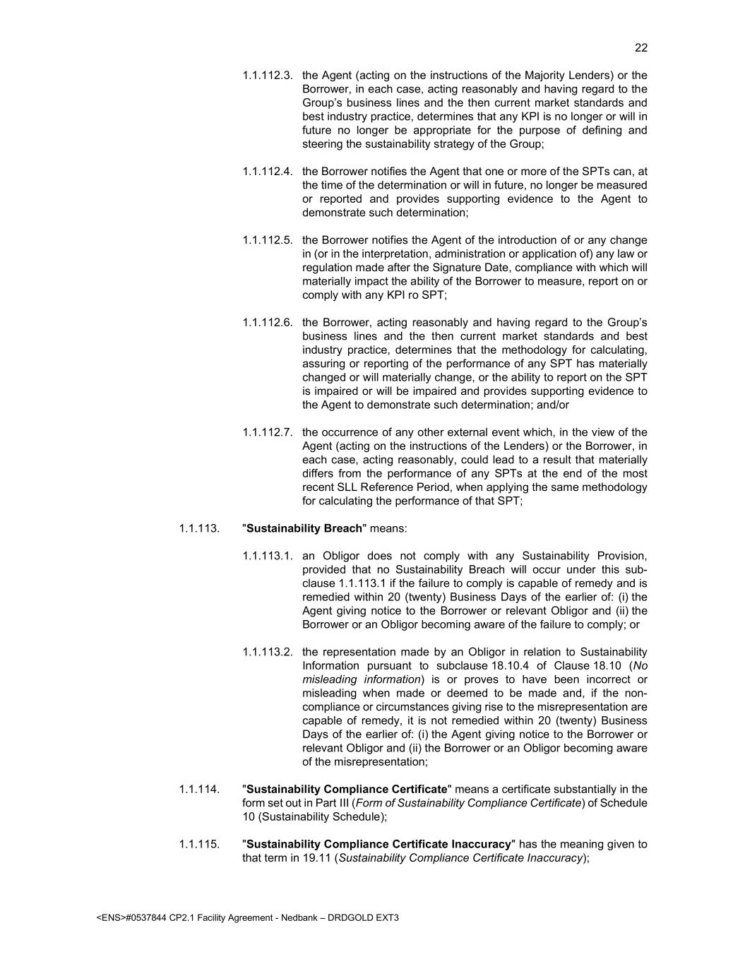 22 <ENS>#0537844 CP2.1 Facility Agreement - Nedbank – DRDGOLD EXT3 1.1.112.3. the Agent (acting on the instructions of the Majority Lenders) or the Borrower, in each case, acting reasonably and having regard to the Group’s business lines and the then current market standards and best industry practice, determines that any KPI is no longer or will in future no longer be appropriate for the purpose of defining and steering the sustainability strategy of the Group; 1.1.112.4. the Borrower notifies the Agent that one or more of the SPTs can, at the time of the determination or will in future, no longer be measured or reported and provides supporting evidence to the Agent to demonstrate such determination; 1.1.112.5. the Borrower notifies the Agent of the introduction of or any change in (or in the interpretation, administration or application of) any law or regulation made after the Signature Date, compliance with which will materially impact the ability of the Borrower to measure, report on or comply with any KPI ro SPT; 1.1.112.6. the Borrower, acting reasonably and having regard to the Group’s business lines and the then current market standards and best industry practice, determines that the methodology for calculating, assuring or reporting of the performance of any SPT has materially changed or will materially change, or the ability to report on the SPT is impaired or will be impaired and provides supporting evidence to the Agent to demonstrate such determination; and/or 1.1.112.7. the occurrence of any other external event which, in the view of the Agent (acting on the instructions of the Lenders) or the Borrower, in each case, acting reasonably, could lead to a result that materially differs from the performance of any SPTs at the end of the most recent SLL Reference Period, when applying the same methodology for calculating the performance of that SPT; 1.1.113. "Sustainability Breach" means: 1.1.113.1. an Obligor does not comply with any Sustainability Provision, provided that no Sustainability Breach will occur under this sub- clause 1.1.113.1 if the failure to comply is capable of remedy and is remedied within 20 (twenty) Business Days of the earlier of: (i) the Agent giving notice to the Borrower or relevant Obligor and (ii) the Borrower or an Obligor becoming aware of the failure to comply; or 1.1.113.2. the representation made by an Obligor in relation to Sustainability Information pursuant to subclause 18.10.4 of Clause 18.10 (No misleading information) is or proves to have been incorrect or misleading when made or deemed to be made and, if the non- compliance or circumstances giving rise to the misrepresentation are capable of remedy, it is not remedied within 20 (twenty) Business Days of the earlier of: (i) the Agent giving notice to the Borrower or relevant Obligor and (ii) the Borrower or an Obligor becoming aware of the misrepresentation; 1.1.114. "Sustainability Compliance Certificate" means a certificate substantially in the form set out in Part III (Form of Sustainability Compliance Certificate) of Schedule 10 (Sustainability Schedule); 1.1.115. "Sustainability Compliance Certificate Inaccuracy" has the meaning given to that term in 19.11 (Sustainability Compliance Certificate Inaccuracy);