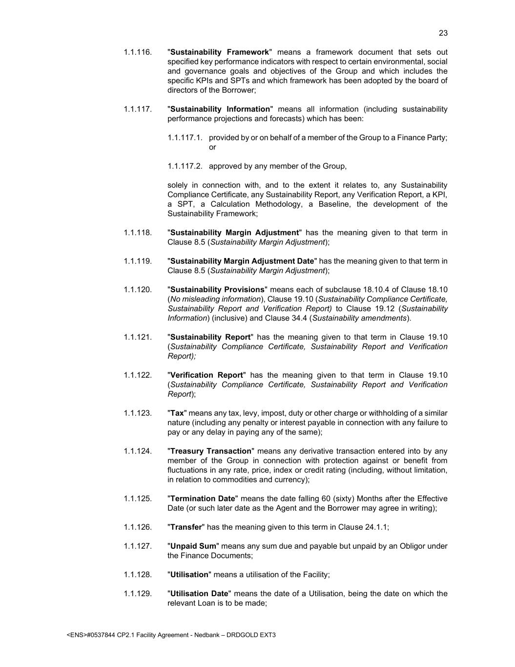 23 <ENS>#0537844 CP2.1 Facility Agreement - Nedbank – DRDGOLD EXT3 1.1.116. "Sustainability Framework" means a framework document that sets out specified key performance indicators with respect to certain environmental, social and governance goals and objectives of the Group and which includes the specific KPIs and SPTs and which framework has been adopted by the board of directors of the Borrower; 1.1.117. "Sustainability Information" means all information (including sustainability performance projections and forecasts) which has been: 1.1.117.1. provided by or on behalf of a member of the Group to a Finance Party; or 1.1.117.2. approved by any member of the Group, solely in connection with, and to the extent it relates to, any Sustainability Compliance Certificate, any Sustainability Report, any Verification Report, a KPI, a SPT, a Calculation Methodology, a Baseline, the development of the Sustainability Framework; 1.1.118. "Sustainability Margin Adjustment" has the meaning given to that term in Clause 8.5 (Sustainability Margin Adjustment); 1.1.119. "Sustainability Margin Adjustment Date" has the meaning given to that term in Clause 8.5 (Sustainability Margin Adjustment); 1.1.120. "Sustainability Provisions" means each of subclause 18.10.4 of Clause 18.10 (No misleading information), Clause 19.10 (Sustainability Compliance Certificate, Sustainability Report and Verification Report) to Clause 19.12 (Sustainability Information) (inclusive) and Clause 34.4 (Sustainability amendments). 1.1.121. "Sustainability Report" has the meaning given to that term in Clause 19.10 (Sustainability Compliance Certificate, Sustainability Report and Verification Report); 1.1.122. "Verification Report" has the meaning given to that term in Clause 19.10 (Sustainability Compliance Certificate, Sustainability Report and Verification Report); 1.1.123. "Tax" means any tax, levy, impost, duty or other charge or withholding of a similar nature (including any penalty or interest payable in connection with any failure to pay or any delay in paying any of the same); 1.1.124. "Treasury Transaction" means any derivative transaction entered into by any member of the Group in connection with protection against or benefit from fluctuations in any rate, price, index or credit rating (including, without limitation, in relation to commodities and currency); 1.1.125. "Termination Date" means the date falling 60 (sixty) Months after the Effective Date (or such later date as the Agent and the Borrower may agree in writing); 1.1.126. "Transfer" has the meaning given to this term in Clause 24.1.1; 1.1.127. "Unpaid Sum" means any sum due and payable but unpaid by an Obligor under the Finance Documents; 1.1.128. "Utilisation" means a utilisation of the Facility; 1.1.129. "Utilisation Date" means the date of a Utilisation, being the date on which the relevant Loan is to be made;