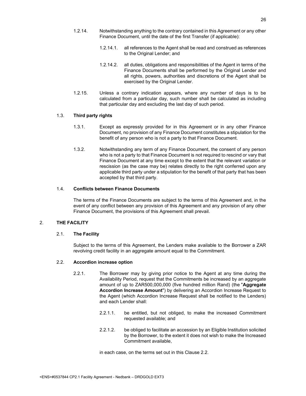 26 <ENS>#0537844 CP2.1 Facility Agreement - Nedbank – DRDGOLD EXT3 1.2.14. Notwithstanding anything to the contrary contained in this Agreement or any other Finance Document, until the date of the first Transfer (if applicable): 1.2.14.1. all references to the Agent shall be read and construed as references to the Original Lender; and 1.2.14.2. all duties, obligations and responsibilities of the Agent in terms of the Finance Documents shall be performed by the Original Lender and all rights, powers, authorities and discretions of the Agent shall be exercised by the Original Lender. 1.2.15. Unless a contrary indication appears, where any number of days is to be calculated from a particular day, such number shall be calculated as including that particular day and excluding the last day of such period. 1.3. Third party rights 1.3.1. Except as expressly provided for in this Agreement or in any other Finance Document, no provision of any Finance Document constitutes a stipulation for the benefit of any person who is not a party to that Finance Document. 1.3.2. Notwithstanding any term of any Finance Document, the consent of any person who is not a party to that Finance Document is not required to rescind or vary that Finance Document at any time except to the extent that the relevant variation or rescission (as the case may be) relates directly to the right conferred upon any applicable third party under a stipulation for the benefit of that party that has been accepted by that third party. 1.4. Conflicts between Finance Documents The terms of the Finance Documents are subject to the terms of this Agreement and, in the event of any conflict between any provision of this Agreement and any provision of any other Finance Document, the provisions of this Agreement shall prevail. 2. THE FACILITY 2.1. The Facility Subject to the terms of this Agreement, the Lenders make available to the Borrower a ZAR revolving credit facility in an aggregate amount equal to the Commitment. 2.2. Accordion increase option 2.2.1. The Borrower may by giving prior notice to the Agent at any time during the Availability Period, request that the Commitments be increased by an aggregate amount of up to ZAR500,000,000 (five hundred million Rand) (the "Aggregate Accordion Increase Amount") by delivering an Accordion Increase Request to the Agent (which Accordion Increase Request shall be notified to the Lenders) and each Lender shall: 2.2.1.1. be entitled, but not obliged, to make the increased Commitment requested available; and 2.2.1.2. be obliged to facilitate an accession by an Eligible Institution solicited by the Borrower, to the extent it does not wish to make the Increased Commitment available, in each case, on the terms set out in this Clause 2.2.