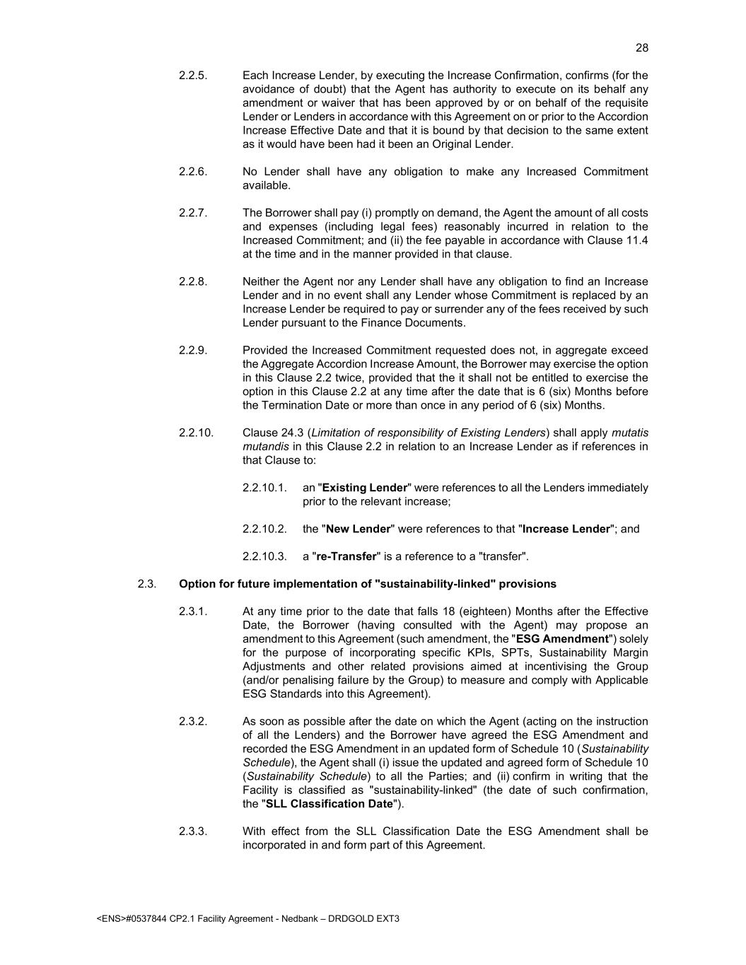 28 <ENS>#0537844 CP2.1 Facility Agreement - Nedbank – DRDGOLD EXT3 2.2.5. Each Increase Lender, by executing the Increase Confirmation, confirms (for the avoidance of doubt) that the Agent has authority to execute on its behalf any amendment or waiver that has been approved by or on behalf of the requisite Lender or Lenders in accordance with this Agreement on or prior to the Accordion Increase Effective Date and that it is bound by that decision to the same extent as it would have been had it been an Original Lender. 2.2.6. No Lender shall have any obligation to make any Increased Commitment available. 2.2.7. The Borrower shall pay (i) promptly on demand, the Agent the amount of all costs and expenses (including legal fees) reasonably incurred in relation to the Increased Commitment; and (ii) the fee payable in accordance with Clause 11.4 at the time and in the manner provided in that clause. 2.2.8. Neither the Agent nor any Lender shall have any obligation to find an Increase Lender and in no event shall any Lender whose Commitment is replaced by an Increase Lender be required to pay or surrender any of the fees received by such Lender pursuant to the Finance Documents. 2.2.9. Provided the Increased Commitment requested does not, in aggregate exceed the Aggregate Accordion Increase Amount, the Borrower may exercise the option in this Clause 2.2 twice, provided that the it shall not be entitled to exercise the option in this Clause 2.2 at any time after the date that is 6 (six) Months before the Termination Date or more than once in any period of 6 (six) Months. 2.2.10. Clause 24.3 (Limitation of responsibility of Existing Lenders) shall apply mutatis mutandis in this Clause 2.2 in relation to an Increase Lender as if references in that Clause to: 2.2.10.1. an "Existing Lender" were references to all the Lenders immediately prior to the relevant increase; 2.2.10.2. the "New Lender" were references to that "Increase Lender"; and 2.2.10.3. a "re-Transfer" is a reference to a "transfer". 2.3. Option for future implementation of "sustainability-linked" provisions 2.3.1. At any time prior to the date that falls 18 (eighteen) Months after the Effective Date, the Borrower (having consulted with the Agent) may propose an amendment to this Agreement (such amendment, the "ESG Amendment") solely for the purpose of incorporating specific KPIs, SPTs, Sustainability Margin Adjustments and other related provisions aimed at incentivising the Group (and/or penalising failure by the Group) to measure and comply with Applicable ESG Standards into this Agreement). 2.3.2. As soon as possible after the date on which the Agent (acting on the instruction of all the Lenders) and the Borrower have agreed the ESG Amendment and recorded the ESG Amendment in an updated form of Schedule 10 (Sustainability Schedule), the Agent shall (i) issue the updated and agreed form of Schedule 10 (Sustainability Schedule) to all the Parties; and (ii) confirm in writing that the Facility is classified as "sustainability-linked" (the date of such confirmation, the "SLL Classification Date"). 2.3.3. With effect from the SLL Classification Date the ESG Amendment shall be incorporated in and form part of this Agreement.