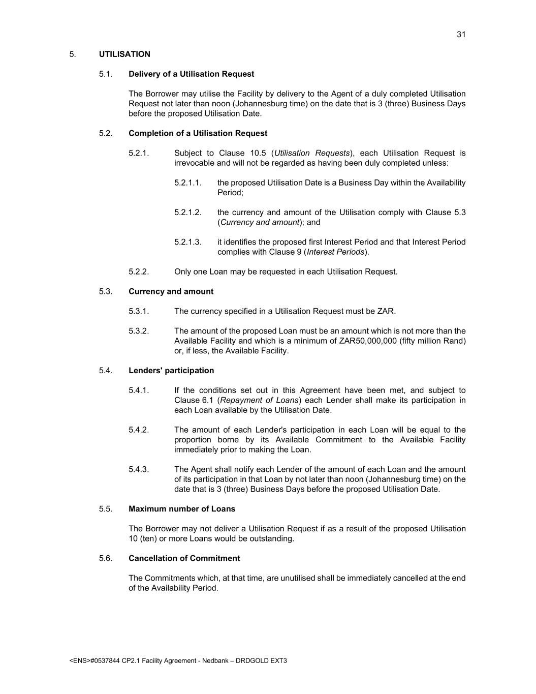 31 <ENS>#0537844 CP2.1 Facility Agreement - Nedbank – DRDGOLD EXT3 5. UTILISATION 5.1. Delivery of a Utilisation Request The Borrower may utilise the Facility by delivery to the Agent of a duly completed Utilisation Request not later than noon (Johannesburg time) on the date that is 3 (three) Business Days before the proposed Utilisation Date. 5.2. Completion of a Utilisation Request 5.2.1. Subject to Clause 10.5 (Utilisation Requests), each Utilisation Request is irrevocable and will not be regarded as having been duly completed unless: 5.2.1.1. the proposed Utilisation Date is a Business Day within the Availability Period; 5.2.1.2. the currency and amount of the Utilisation comply with Clause 5.3 (Currency and amount); and 5.2.1.3. it identifies the proposed first Interest Period and that Interest Period complies with Clause 9 (Interest Periods). 5.2.2. Only one Loan may be requested in each Utilisation Request. 5.3. Currency and amount 5.3.1. The currency specified in a Utilisation Request must be ZAR. 5.3.2. The amount of the proposed Loan must be an amount which is not more than the Available Facility and which is a minimum of ZAR50,000,000 (fifty million Rand) or, if less, the Available Facility. 5.4. Lenders' participation 5.4.1. If the conditions set out in this Agreement have been met, and subject to Clause 6.1 (Repayment of Loans) each Lender shall make its participation in each Loan available by the Utilisation Date. 5.4.2. The amount of each Lender's participation in each Loan will be equal to the proportion borne by its Available Commitment to the Available Facility immediately prior to making the Loan. 5.4.3. The Agent shall notify each Lender of the amount of each Loan and the amount of its participation in that Loan by not later than noon (Johannesburg time) on the date that is 3 (three) Business Days before the proposed Utilisation Date. 5.5. Maximum number of Loans The Borrower may not deliver a Utilisation Request if as a result of the proposed Utilisation 10 (ten) or more Loans would be outstanding. 5.6. Cancellation of Commitment The Commitments which, at that time, are unutilised shall be immediately cancelled at the end of the Availability Period.