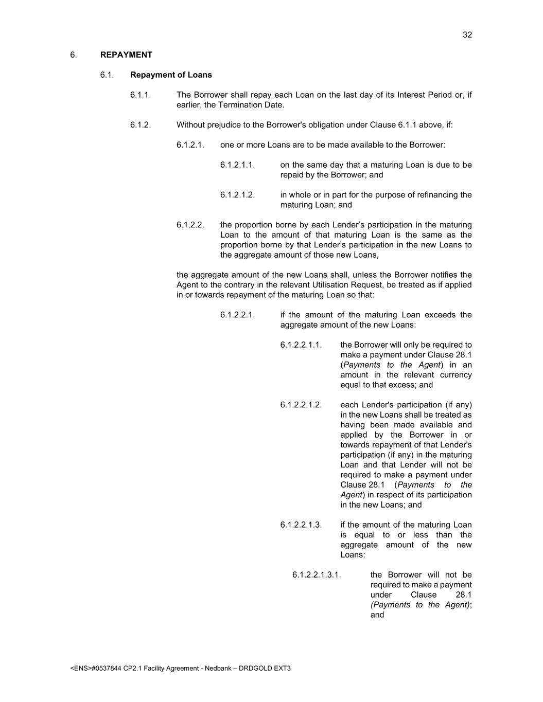 32 <ENS>#0537844 CP2.1 Facility Agreement - Nedbank – DRDGOLD EXT3 6. REPAYMENT 6.1. Repayment of Loans 6.1.1. The Borrower shall repay each Loan on the last day of its Interest Period or, if earlier, the Termination Date. 6.1.2. Without prejudice to the Borrower's obligation under Clause 6.1.1 above, if: 6.1.2.1. one or more Loans are to be made available to the Borrower: 6.1.2.1.1. on the same day that a maturing Loan is due to be repaid by the Borrower; and 6.1.2.1.2. in whole or in part for the purpose of refinancing the maturing Loan; and 6.1.2.2. the proportion borne by each Lender’s participation in the maturing Loan to the amount of that maturing Loan is the same as the proportion borne by that Lender’s participation in the new Loans to the aggregate amount of those new Loans, the aggregate amount of the new Loans shall, unless the Borrower notifies the Agent to the contrary in the relevant Utilisation Request, be treated as if applied in or towards repayment of the maturing Loan so that: 6.1.2.2.1. if the amount of the maturing Loan exceeds the aggregate amount of the new Loans: 6.1.2.2.1.1. the Borrower will only be required to make a payment under Clause 28.1 (Payments to the Agent) in an amount in the relevant currency equal to that excess; and 6.1.2.2.1.2. each Lender's participation (if any) in the new Loans shall be treated as having been made available and applied by the Borrower in or towards repayment of that Lender's participation (if any) in the maturing Loan and that Lender will not be required to make a payment under Clause 28.1 (Payments to the Agent) in respect of its participation in the new Loans; and 6.1.2.2.1.3. if the amount of the maturing Loan is equal to or less than the aggregate amount of the new Loans: 6.1.2.2.1.3.1. the Borrower will not be required to make a payment under Clause 28.1 (Payments to the Agent); and