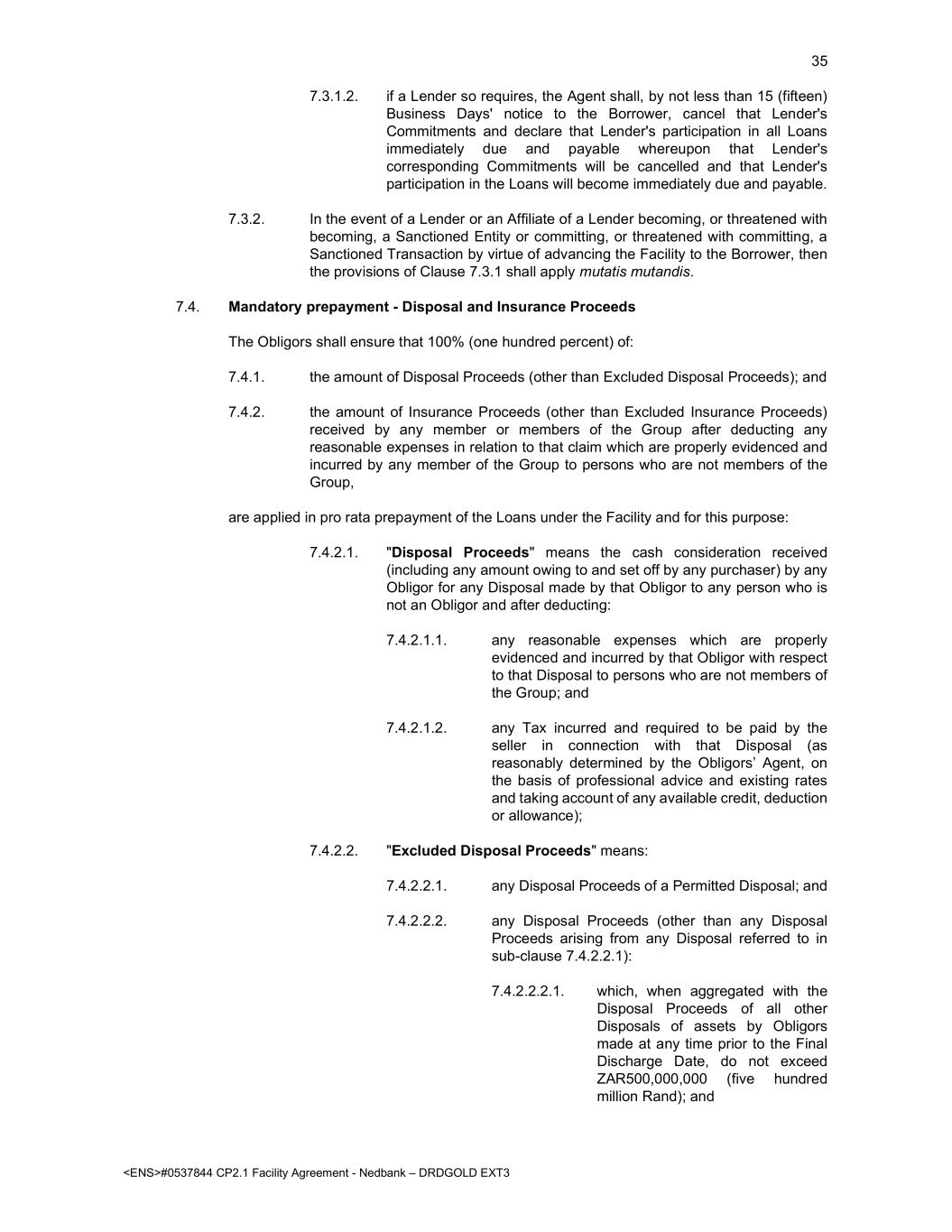 35 <ENS>#0537844 CP2.1 Facility Agreement - Nedbank – DRDGOLD EXT3 7.3.1.2. if a Lender so requires, the Agent shall, by not less than 15 (fifteen) Business Days' notice to the Borrower, cancel that Lender's Commitments and declare that Lender's participation in all Loans immediately due and payable whereupon that Lender's corresponding Commitments will be cancelled and that Lender's participation in the Loans will become immediately due and payable. 7.3.2. In the event of a Lender or an Affiliate of a Lender becoming, or threatened with becoming, a Sanctioned Entity or committing, or threatened with committing, a Sanctioned Transaction by virtue of advancing the Facility to the Borrower, then the provisions of Clause 7.3.1 shall apply mutatis mutandis. 7.4. Mandatory prepayment - Disposal and Insurance Proceeds The Obligors shall ensure that 100% (one hundred percent) of: 7.4.1. the amount of Disposal Proceeds (other than Excluded Disposal Proceeds); and 7.4.2. the amount of Insurance Proceeds (other than Excluded Insurance Proceeds) received by any member or members of the Group after deducting any reasonable expenses in relation to that claim which are properly evidenced and incurred by any member of the Group to persons who are not members of the Group, are applied in pro rata prepayment of the Loans under the Facility and for this purpose: 7.4.2.1. "Disposal Proceeds" means the cash consideration received (including any amount owing to and set off by any purchaser) by any Obligor for any Disposal made by that Obligor to any person who is not an Obligor and after deducting: 7.4.2.1.1. any reasonable expenses which are properly evidenced and incurred by that Obligor with respect to that Disposal to persons who are not members of the Group; and 7.4.2.1.2. any Tax incurred and required to be paid by the seller in connection with that Disposal (as reasonably determined by the Obligors’ Agent, on the basis of professional advice and existing rates and taking account of any available credit, deduction or allowance); 7.4.2.2. "Excluded Disposal Proceeds" means: 7.4.2.2.1. any Disposal Proceeds of a Permitted Disposal; and 7.4.2.2.2. any Disposal Proceeds (other than any Disposal Proceeds arising from any Disposal referred to in sub-clause 7.4.2.2.1): 7.4.2.2.2.1. which, when aggregated with the Disposal Proceeds of all other Disposals of assets by Obligors made at any time prior to the Final Discharge Date, do not exceed ZAR500,000,000 (five hundred million Rand); and