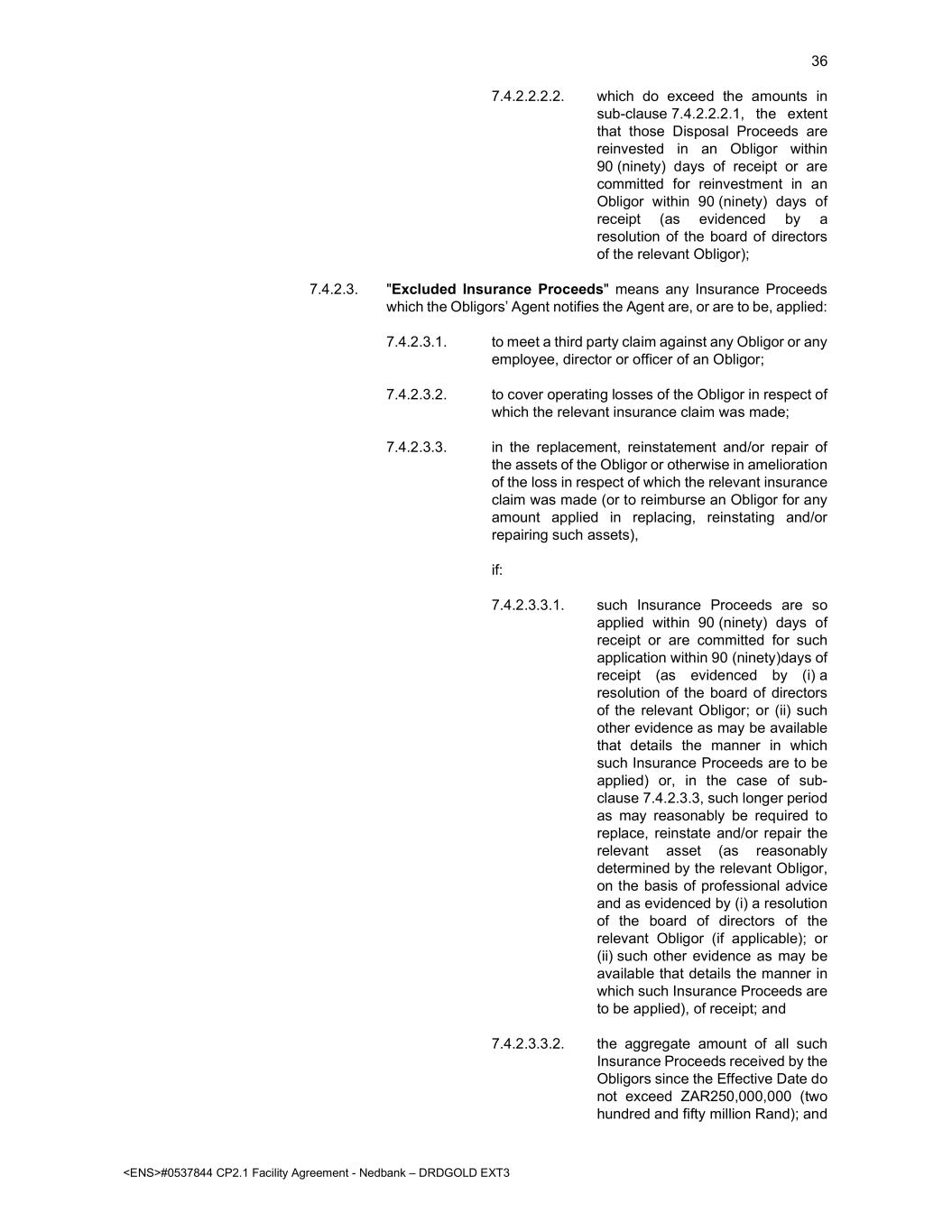 36 <ENS>#0537844 CP2.1 Facility Agreement - Nedbank – DRDGOLD EXT3 7.4.2.2.2.2. which do exceed the amounts in sub-clause 7.4.2.2.2.1, the extent that those Disposal Proceeds are reinvested in an Obligor within 90 (ninety) days of receipt or are committed for reinvestment in an Obligor within 90 (ninety) days of receipt (as evidenced by a resolution of the board of directors of the relevant Obligor); 7.4.2.3. "Excluded Insurance Proceeds" means any Insurance Proceeds which the Obligors’ Agent notifies the Agent are, or are to be, applied: 7.4.2.3.1. to meet a third party claim against any Obligor or any employee, director or officer of an Obligor; 7.4.2.3.2. to cover operating losses of the Obligor in respect of which the relevant insurance claim was made; 7.4.2.3.3. in the replacement, reinstatement and/or repair of the assets of the Obligor or otherwise in amelioration of the loss in respect of which the relevant insurance claim was made (or to reimburse an Obligor for any amount applied in replacing, reinstating and/or repairing such assets), if: 7.4.2.3.3.1. such Insurance Proceeds are so applied within 90 (ninety) days of receipt or are committed for such application within 90 (ninety)days of receipt (as evidenced by (i) a resolution of the board of directors of the relevant Obligor; or (ii) such other evidence as may be available that details the manner in which such Insurance Proceeds are to be applied) or, in the case of sub- clause 7.4.2.3.3, such longer period as may reasonably be required to replace, reinstate and/or repair the relevant asset (as reasonably determined by the relevant Obligor, on the basis of professional advice and as evidenced by (i) a resolution of the board of directors of the relevant Obligor (if applicable); or (ii) such other evidence as may be available that details the manner in which such Insurance Proceeds are to be applied), of receipt; and 7.4.2.3.3.2. the aggregate amount of all such Insurance Proceeds received by the Obligors since the Effective Date do not exceed ZAR250,000,000 (two hundred and fifty million Rand); and