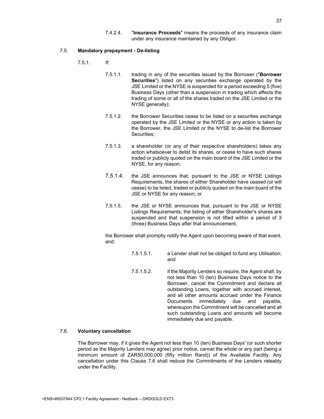 37 <ENS>#0537844 CP2.1 Facility Agreement - Nedbank – DRDGOLD EXT3 7.4.2.4. "Insurance Proceeds" means the proceeds of any insurance claim under any insurance maintained by any Obligor. 7.5. Mandatory prepayment - De-listing 7.5.1. If: 7.5.1.1. trading in any of the securities issued by the Borrower ("Borrower Securities") listed on any securities exchange operated by the JSE Limited or the NYSE is suspended for a period exceeding 5 (five) Business Days (other than a suspension in trading which affects the trading of some or all of the shares traded on the JSE Limited or the NYSE generally); 7.5.1.2. the Borrower Securities cease to be listed on a securities exchange operated by the JSE Limited or the NYSE or any action is taken by the Borrower, the JSE Limited or the NYSE to de-list the Borrower Securities; 7.5.1.3. a shareholder (or any of their respective shareholders) takes any action whatsoever to delist its shares, or cease to have such shares traded or publicly quoted on the main board of the JSE Limited or the NYSE, for any reason; 7.5.1.4. the JSE announces that, pursuant to the JSE or NYSE Listings Requirements, the shares of either Shareholder have ceased (or will cease) to be listed, traded or publicly quoted on the main board of the JSE or NYSE for any reason; or 7.5.1.5. the JSE or NYSE announces that, pursuant to the JSE or NYSE Listings Requirements, the listing of either Shareholder's shares are suspended and that suspension is not lifted within a period of 3 (three) Business Days after that announcement, the Borrower shall promptly notify the Agent upon becoming aware of that event, and: 7.5.1.5.1. a Lender shall not be obliged to fund any Utilisation; and 7.5.1.5.2. if the Majority Lenders so require, the Agent shall, by not less than 10 (ten) Business Days notice to the Borrower, cancel the Commitment and declare all outstanding Loans, together with accrued interest, and all other amounts accrued under the Finance Documents immediately due and payable, whereupon the Commitment will be cancelled and all such outstanding Loans and amounts will become immediately due and payable. 7.6. Voluntary cancellation The Borrower may, if it gives the Agent not less than 10 (ten) Business Days' (or such shorter period as the Majority Lenders may agree) prior notice, cancel the whole or any part (being a minimum amount of ZAR50,000,000 (fifty million Rand)) of the Available Facility. Any cancellation under this Clause 7.6 shall reduce the Commitments of the Lenders rateably under the Facility.