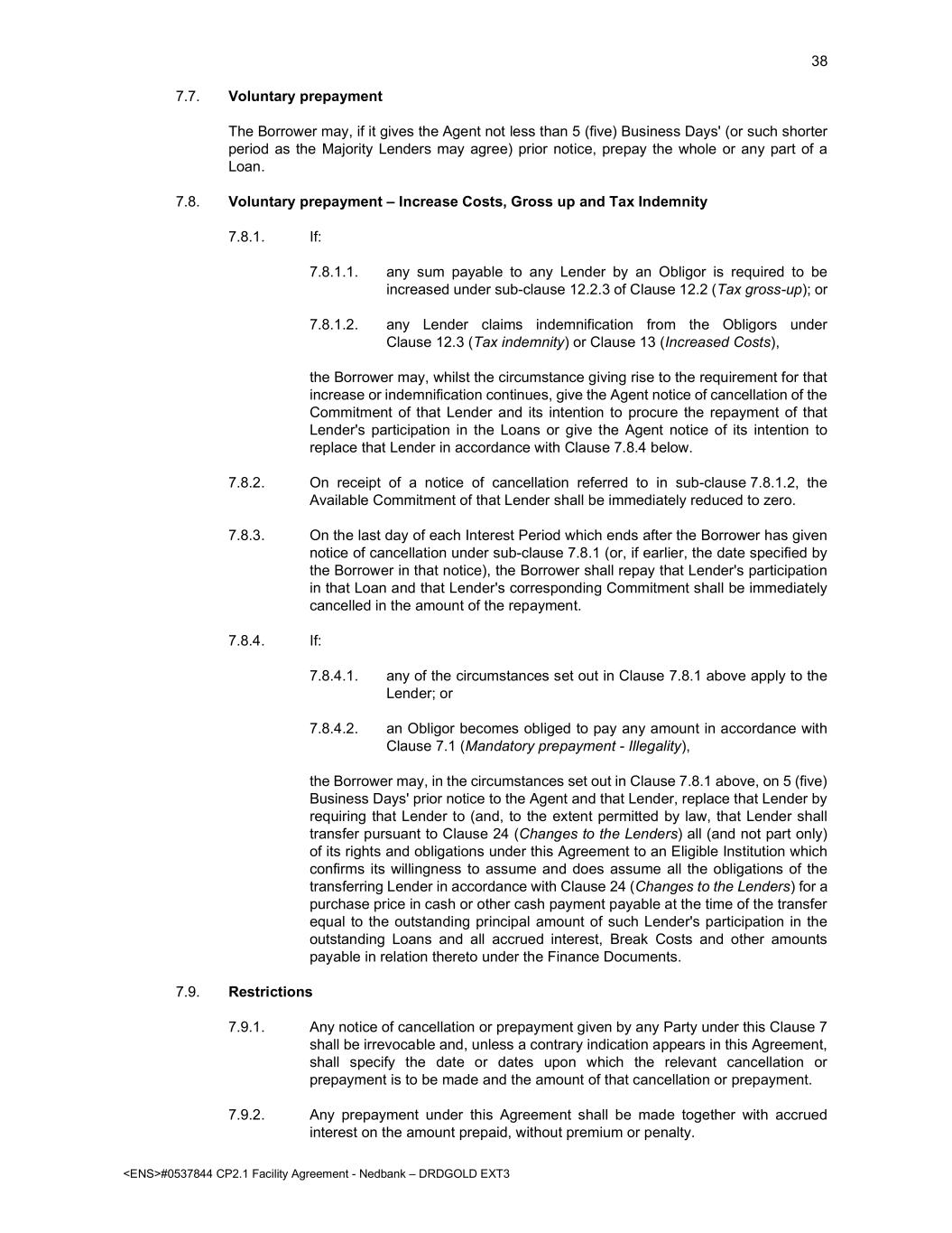 38 <ENS>#0537844 CP2.1 Facility Agreement - Nedbank – DRDGOLD EXT3 7.7. Voluntary prepayment The Borrower may, if it gives the Agent not less than 5 (five) Business Days' (or such shorter period as the Majority Lenders may agree) prior notice, prepay the whole or any part of a Loan. 7.8. Voluntary prepayment – Increase Costs, Gross up and Tax Indemnity 7.8.1. If: 7.8.1.1. any sum payable to any Lender by an Obligor is required to be increased under sub-clause 12.2.3 of Clause 12.2 (Tax gross-up); or 7.8.1.2. any Lender claims indemnification from the Obligors under Clause 12.3 (Tax indemnity) or Clause 13 (Increased Costs), the Borrower may, whilst the circumstance giving rise to the requirement for that increase or indemnification continues, give the Agent notice of cancellation of the Commitment of that Lender and its intention to procure the repayment of that Lender's participation in the Loans or give the Agent notice of its intention to replace that Lender in accordance with Clause 7.8.4 below. 7.8.2. On receipt of a notice of cancellation referred to in sub-clause 7.8.1.2, the Available Commitment of that Lender shall be immediately reduced to zero. 7.8.3. On the last day of each Interest Period which ends after the Borrower has given notice of cancellation under sub-clause 7.8.1 (or, if earlier, the date specified by the Borrower in that notice), the Borrower shall repay that Lender's participation in that Loan and that Lender's corresponding Commitment shall be immediately cancelled in the amount of the repayment. 7.8.4. If: 7.8.4.1. any of the circumstances set out in Clause 7.8.1 above apply to the Lender; or 7.8.4.2. an Obligor becomes obliged to pay any amount in accordance with Clause 7.1 (Mandatory prepayment - Illegality), the Borrower may, in the circumstances set out in Clause 7.8.1 above, on 5 (five) Business Days' prior notice to the Agent and that Lender, replace that Lender by requiring that Lender to (and, to the extent permitted by law, that Lender shall transfer pursuant to Clause 24 (Changes to the Lenders) all (and not part only) of its rights and obligations under this Agreement to an Eligible Institution which confirms its willingness to assume and does assume all the obligations of the transferring Lender in accordance with Clause 24 (Changes to the Lenders) for a purchase price in cash or other cash payment payable at the time of the transfer equal to the outstanding principal amount of such Lender's participation in the outstanding Loans and all accrued interest, Break Costs and other amounts payable in relation thereto under the Finance Documents. 7.9. Restrictions 7.9.1. Any notice of cancellation or prepayment given by any Party under this Clause 7 shall be irrevocable and, unless a contrary indication appears in this Agreement, shall specify the date or dates upon which the relevant cancellation or prepayment is to be made and the amount of that cancellation or prepayment. 7.9.2. Any prepayment under this Agreement shall be made together with accrued interest on the amount prepaid, without premium or penalty.