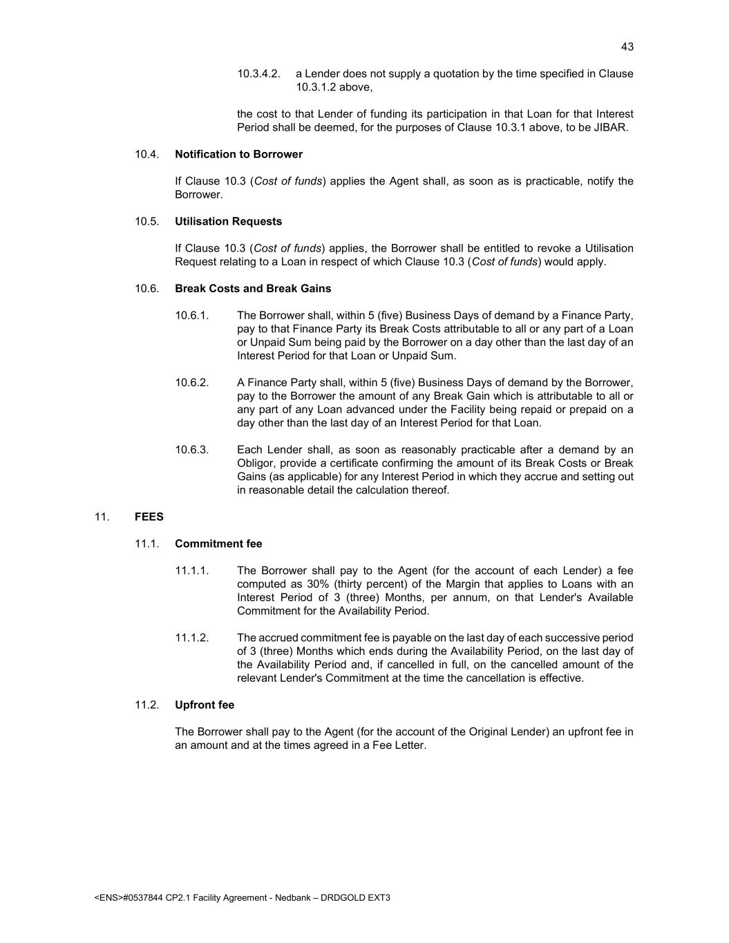43 <ENS>#0537844 CP2.1 Facility Agreement - Nedbank – DRDGOLD EXT3 10.3.4.2. a Lender does not supply a quotation by the time specified in Clause 10.3.1.2 above, the cost to that Lender of funding its participation in that Loan for that Interest Period shall be deemed, for the purposes of Clause 10.3.1 above, to be JIBAR. 10.4. Notification to Borrower If Clause 10.3 (Cost of funds) applies the Agent shall, as soon as is practicable, notify the Borrower. 10.5. Utilisation Requests If Clause 10.3 (Cost of funds) applies, the Borrower shall be entitled to revoke a Utilisation Request relating to a Loan in respect of which Clause 10.3 (Cost of funds) would apply. 10.6. Break Costs and Break Gains 10.6.1. The Borrower shall, within 5 (five) Business Days of demand by a Finance Party, pay to that Finance Party its Break Costs attributable to all or any part of a Loan or Unpaid Sum being paid by the Borrower on a day other than the last day of an Interest Period for that Loan or Unpaid Sum. 10.6.2. A Finance Party shall, within 5 (five) Business Days of demand by the Borrower, pay to the Borrower the amount of any Break Gain which is attributable to all or any part of any Loan advanced under the Facility being repaid or prepaid on a day other than the last day of an Interest Period for that Loan. 10.6.3. Each Lender shall, as soon as reasonably practicable after a demand by an Obligor, provide a certificate confirming the amount of its Break Costs or Break Gains (as applicable) for any Interest Period in which they accrue and setting out in reasonable detail the calculation thereof. 11. FEES 11.1. Commitment fee 11.1.1. The Borrower shall pay to the Agent (for the account of each Lender) a fee computed as 30% (thirty percent) of the Margin that applies to Loans with an Interest Period of 3 (three) Months, per annum, on that Lender's Available Commitment for the Availability Period. 11.1.2. The accrued commitment fee is payable on the last day of each successive period of 3 (three) Months which ends during the Availability Period, on the last day of the Availability Period and, if cancelled in full, on the cancelled amount of the relevant Lender's Commitment at the time the cancellation is effective. 11.2. Upfront fee The Borrower shall pay to the Agent (for the account of the Original Lender) an upfront fee in an amount and at the times agreed in a Fee Letter.